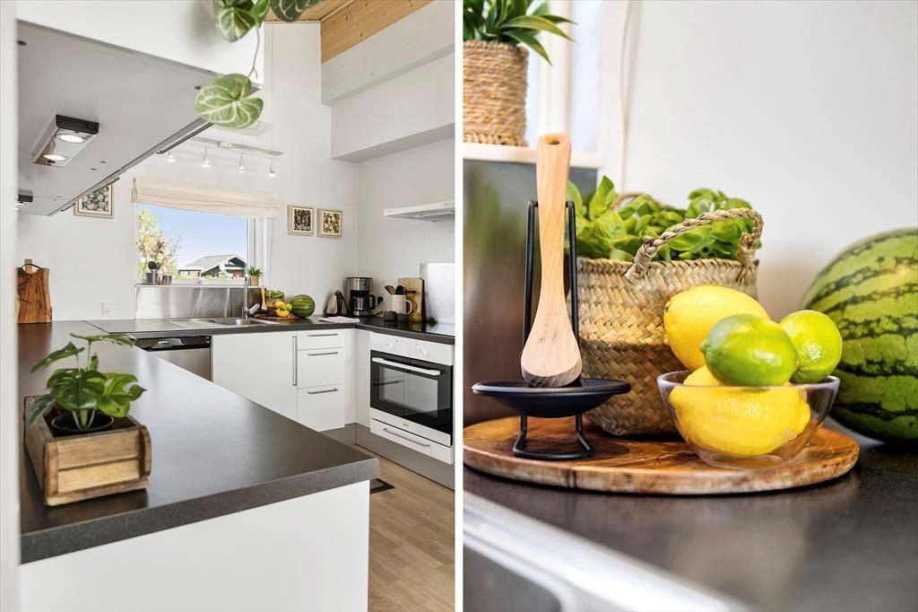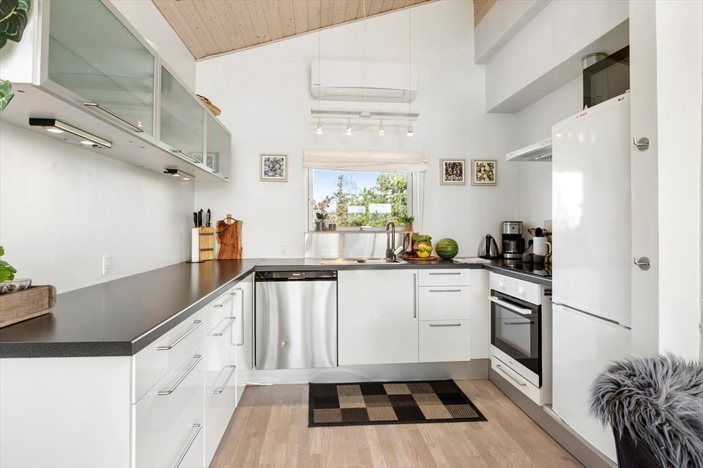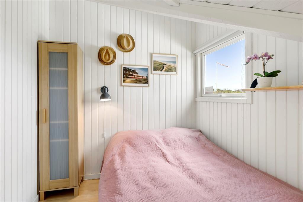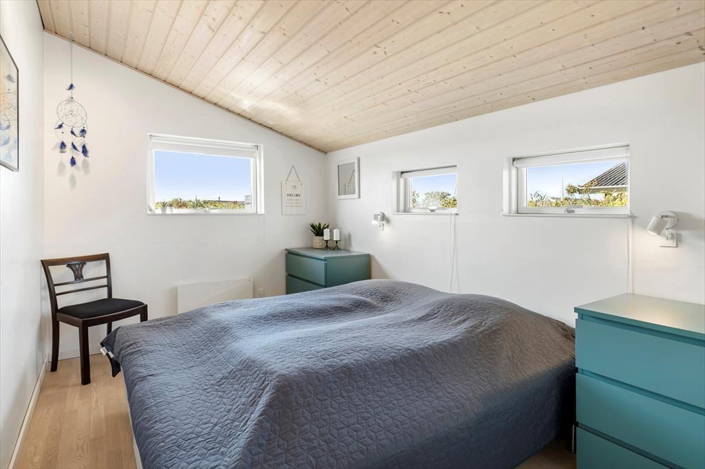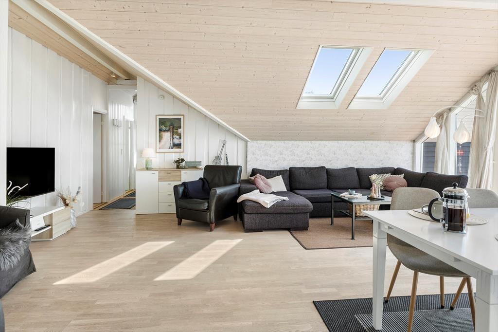 Sommerhuset byder på en lys og indbydende atmosfære med en hyggelig indretning, hvor skråvægge og træbeklædte overflader skaber en autentisk og varm sommerhusstemning. Stue og køkken ligger i åben forbindelse, så her er det oplagt at samles om fælles madlavning og afslapning i sofaen efter en dag fyldt med oplevelser. Lyset strømmer ind gennem vinduerne og skaber en rolig stemning i rummet – perfekt til en stille morgen med kaffe og avislæsning eller en aften med brætspil og latter. Indretningen er enkel, men personlig, og huset har en afslappet, uformel karakter, hvor man hurtigt føler sig hjemme.