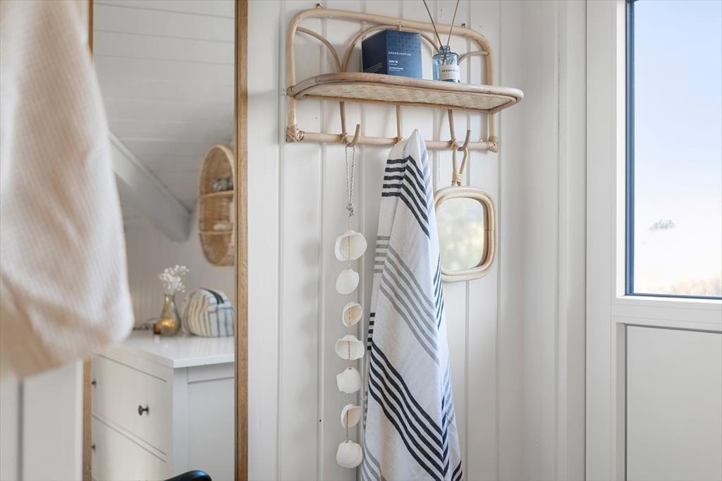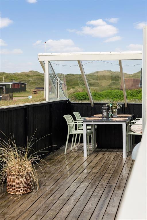 Når du træder ind i sommerhuset, mødes du af en lys og indbydende atmosfære med rustikke trævægge og loft til kip, der skaber en autentisk sommerhusstemning. Den åbne stue er udstyret med en brændeovn, der spreder varme på kølige aftener, mens store vinduespartier lader dagslyset strømme ind og giver udsigt til det omkringliggende klitlandskab. Det veludstyrede køkken ligger i åben forbindelse med stuen, hvilket gør det nemt at tilberede lækre måltider, mens samtalen flyder. Fra stuen er der direkte adgang til en rummelig udestue, hvor du kan nyde kaffen med udsigt til naturen, uanset vejret.