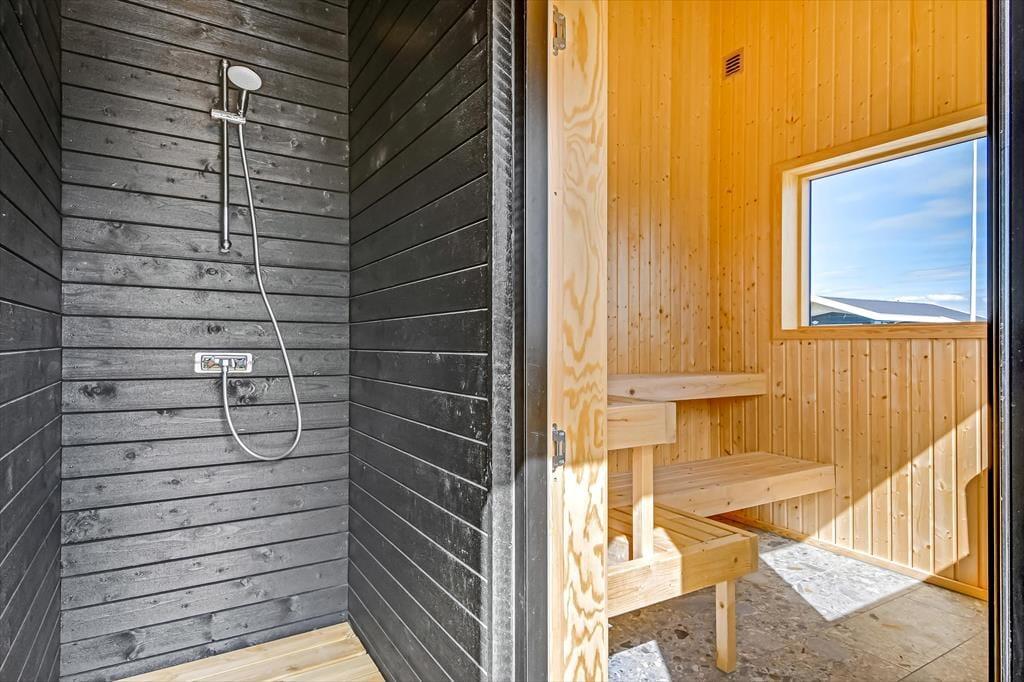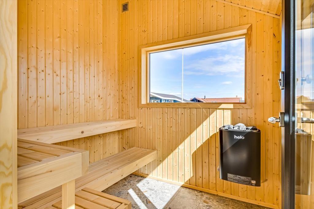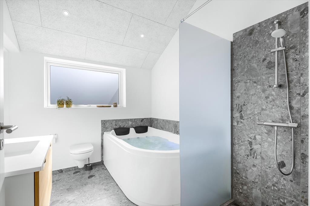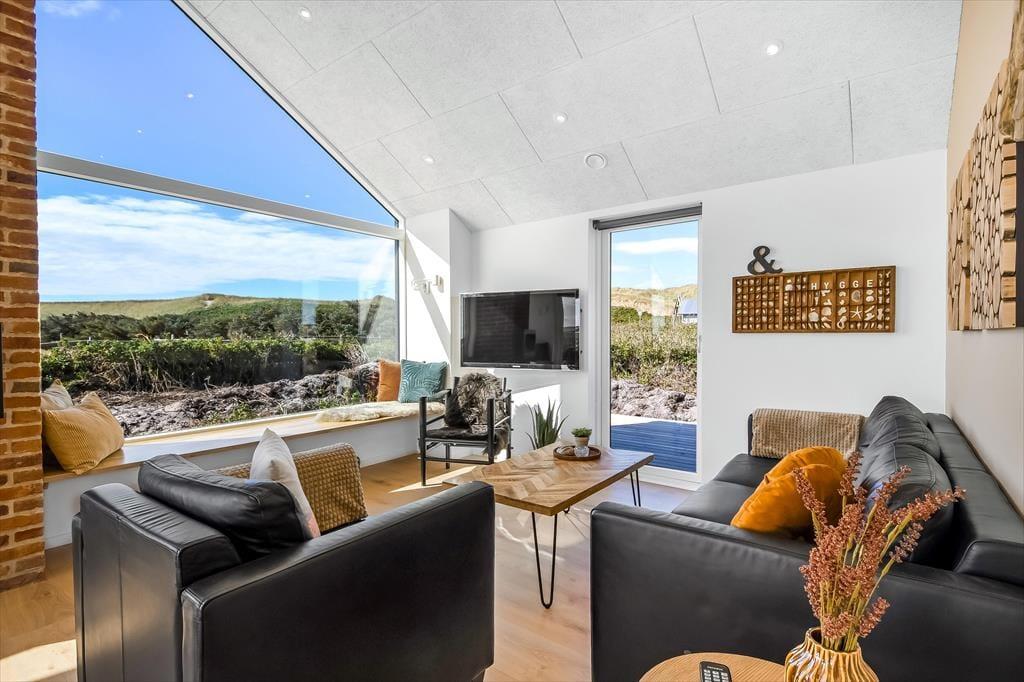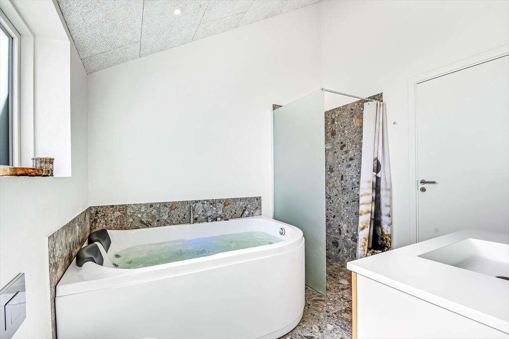 Indenfor bliver du mødt af et sommerhus, der udstråler kvalitet og ro. Det moderne interiør er præget af lyse farver, rene linjer og store vinduespartier, som inviterer den omkringliggende natur helt tæt på. Det åbne opholdsrum samler køkken, spiseplads og stue i ét – et oplagt sted til både madlavning, hyggesnak og fælles stunder foran brændeovnen. Når dagen lakker mod enden, kan du lade kroppen slappe af i det indendørs spabad eller nyde varmen i saunaen – den perfekte afslutning på en dag med frisk luft og vind i håret. Det er et sommerhus, hvor du straks føler dig hjemme og får lyst til at blive lidt længere.