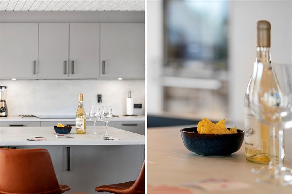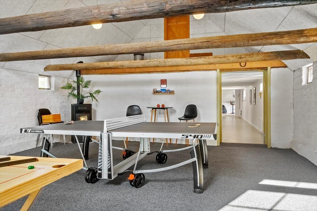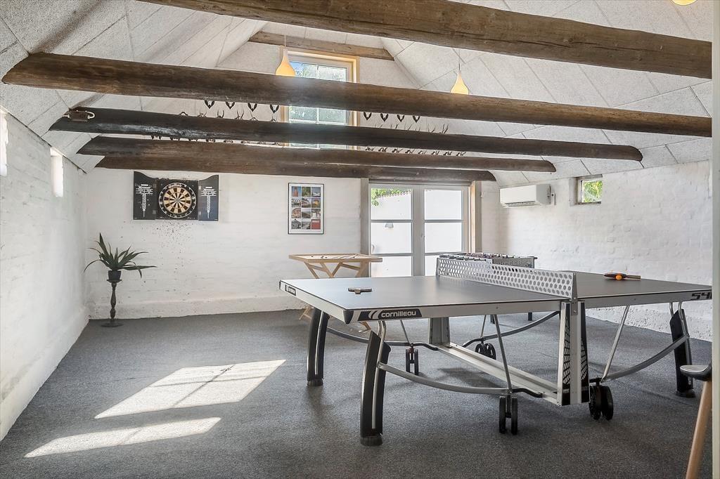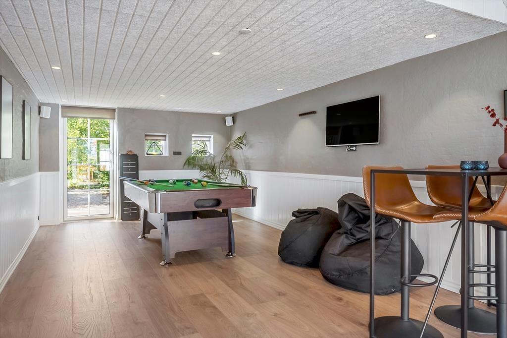 Indendørs møder du en harmonisk kombination af moderne komfort og hyggelig sommerhusstemning. I 2025 er huset blevet renoveret, og især opholdsrummet – med helt nyt køkken og stue i ét – fremstår nyt, lyst og indbydende. Her kan I samles på kryds og tværs af generationer, mens duften af mad breder sig fra køkkenet, og børnene lægger sidste hånd på dagens perleplader eller brætspil. Og når der er brug for et skud konkurrence, kan I rykke ind i det store aktivitetsrum og dyste i bordtennis, fodboldspil, dart og billiard. Efter en dag fuld af oplevelser er det rart at falde til ro i de rummelige og velindrettede soveværelser, mens man glæder sig til endnu en feriedag i det skønne sommerhus.