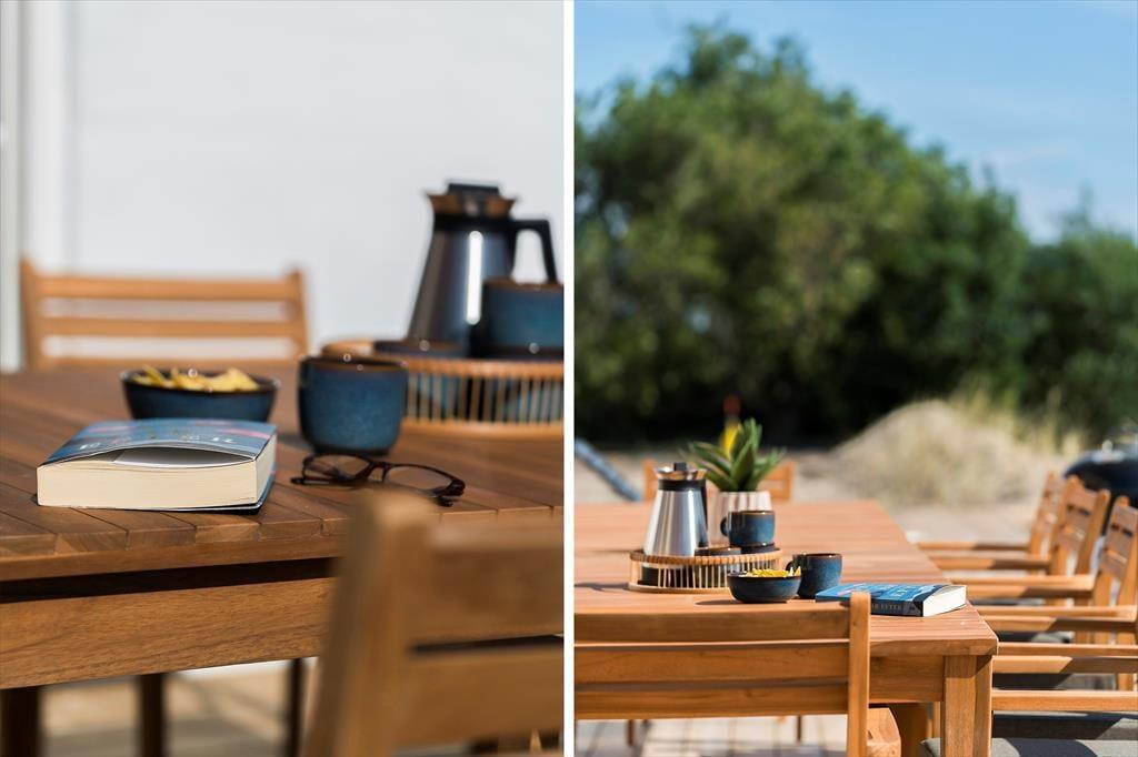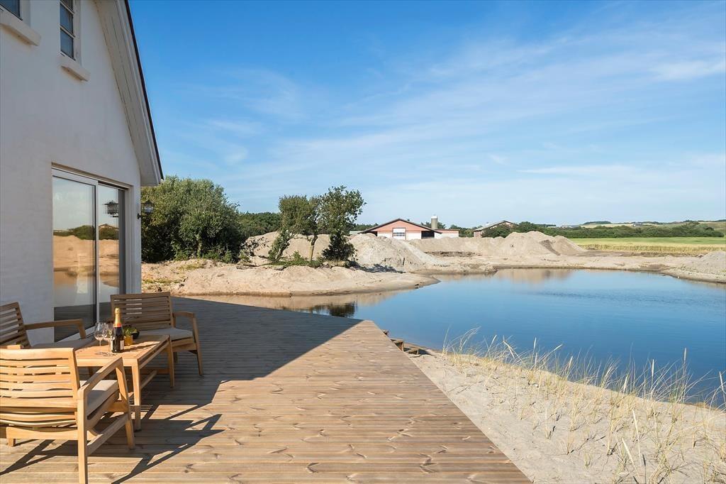 Lige udenfor venter ferieglæderne i lange baner. Det omkringliggende terrasse- og stisystem er noget helt særligt – med gangbroer og terrasser i alle retninger kan I altid finde sol, læ eller skygge, alt efter humør og vejr. De naturskønne omgivelser indbyder til ro og fordybelse, og fra saunaen og det udendørs spabad kan I nyde panoramaudsigten over den store sø, der ligger lige ved huset. Måske tager I en stille rotur i robåden, prøver balancen af på paddleboardet eller sætter gang i boldspillet på den private fodboldbane eller beachvolleybanen. Det er udendørsliv, når det er allerbedst – og det hele er jeres helt alene.