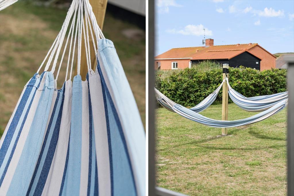 Omkring huset finder du hele to terrasser, så du har mulighed for at vælge netop den solplet eller skyggefulde krog, der passer til stemningen og tidspunktet på dagen. Her kan morgenkaffen nydes under åben himmel, og aftensmaden serveres med udsigt til de fredelige omgivelser, mens solen går ned bag klitterne. Den indhegnede grund er en gave, hvis du har hund med på ferie – her kan den trygt bevæge sig rundt, mens børnene leger og de voksne slapper af. Grunden er desuden omgivet af natur og stilhed, så det er nemt at finde roen og bare være til stede i nuet.