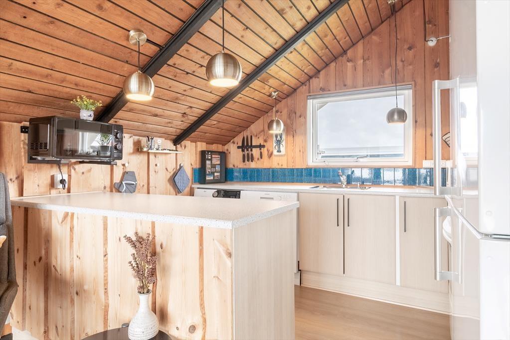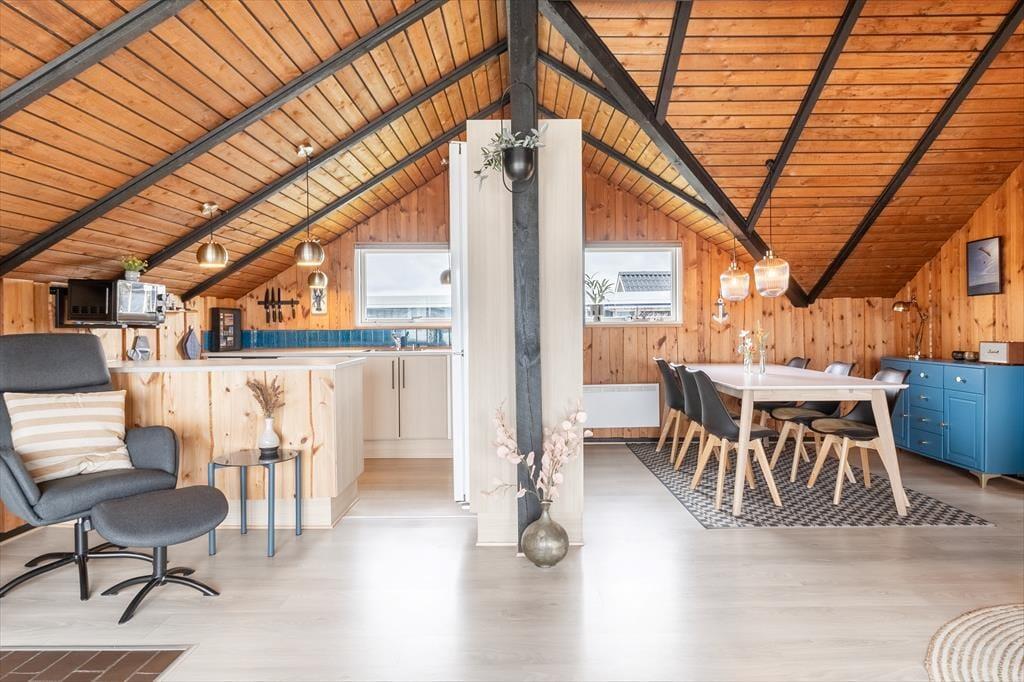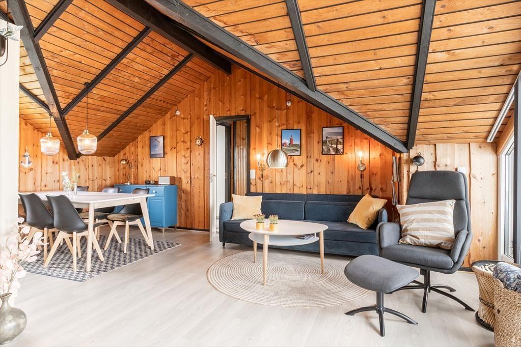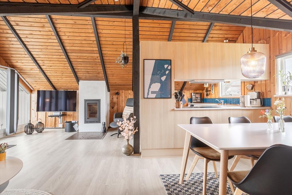 Når du træder indenfor i sommerhuset på Vejlby Klit 291, fornemmer du straks den særlige sommerhusstemning, der opstår, når æstetik og funktionalitet går hånd i hånd. Loftet går til kip, og de rå trælister på væggene giver en hyggelig og autentisk følelse, som du ikke kan andet end at slappe af i. Midt i stuen står brændeovnen klar til at lune jer på kølige dage – perfekt til at samle familien til spil, samtale eller blot afslapning i sofaen med en kop varm kakao. Det kombinerede køkken-alrum gør det nemt at være sammen på tværs af aktiviteter – og store vinduer sørger for, at dagslyset strømmer ind og skaber kontakt til de skønne omgivelser udenfor.