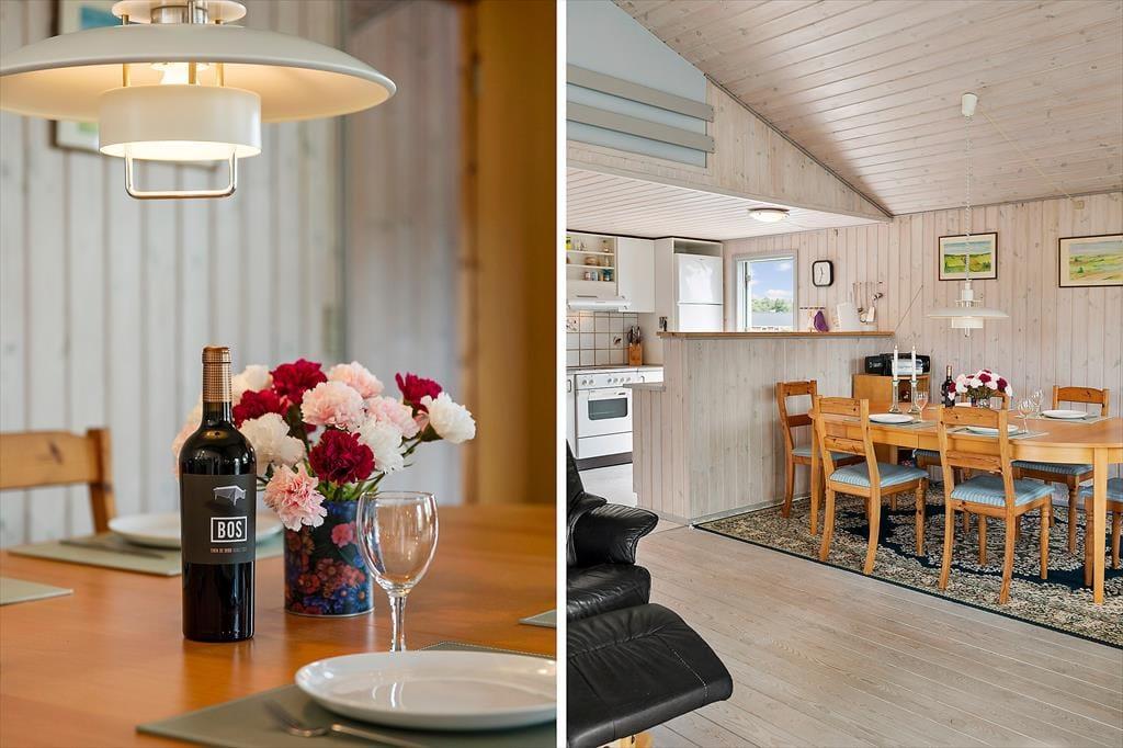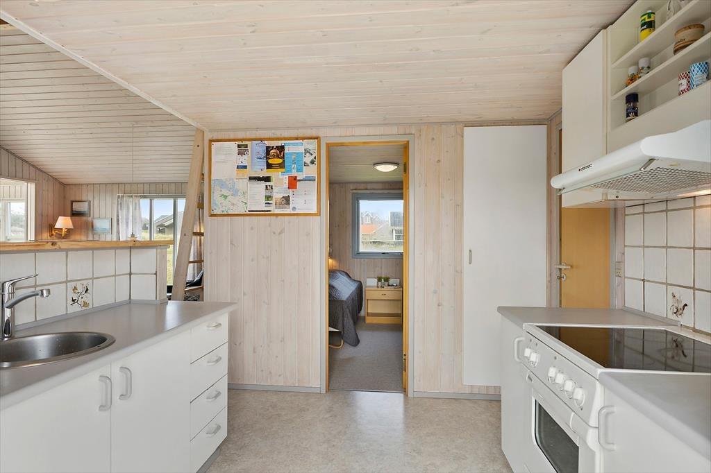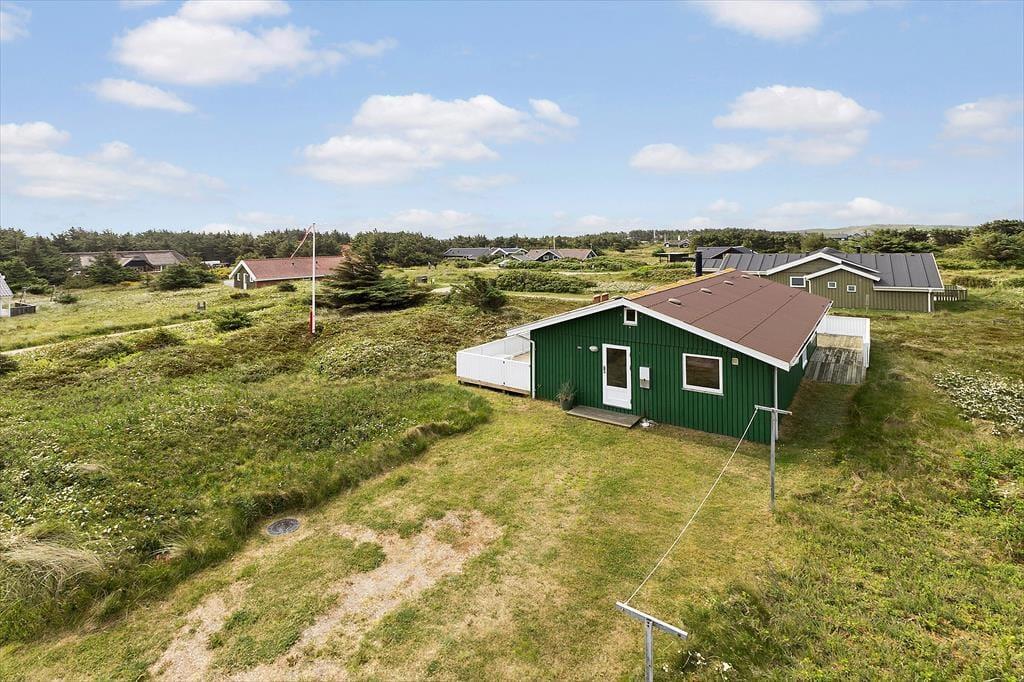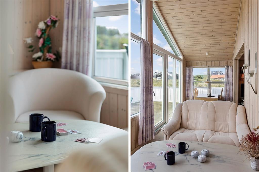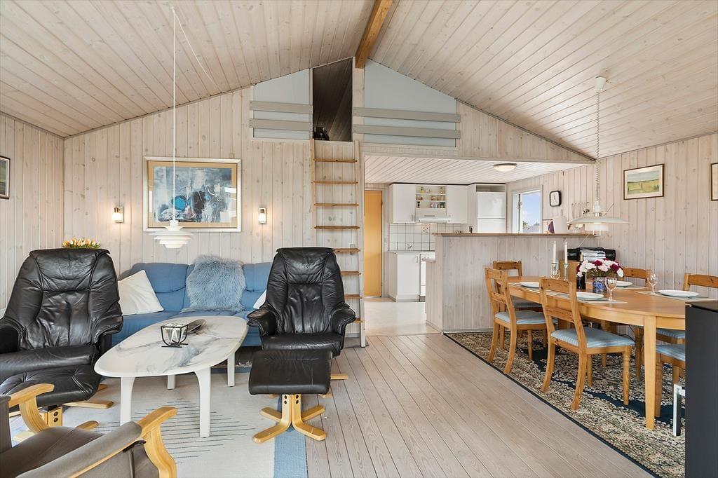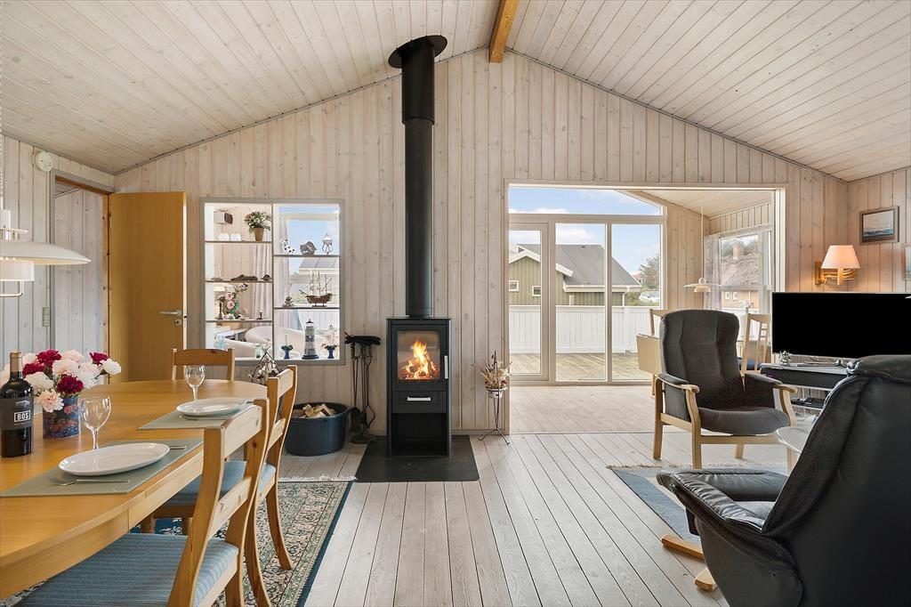 Når du træder ind i dette hyggelige sommerhus, mødes du af en lys og indbydende atmosfære. Huset er velindrettet med tre soveværelser, hvilket giver god plads til op til seks personer. Derudover er der en hems, som børnene vil elske at bruge som deres egen lille hule. Stuen og køkkenet er i åben forbindelse, hvilket skaber et naturligt samlingspunkt for hele familien. Her kan I nyde hyggelige aftener foran brændeovnen eller samles om et spil kort ved spisebordet. De store vinduer i stuen giver et fantastisk lysindfald og en smuk udsigt til klitterne, der omkranser huset.