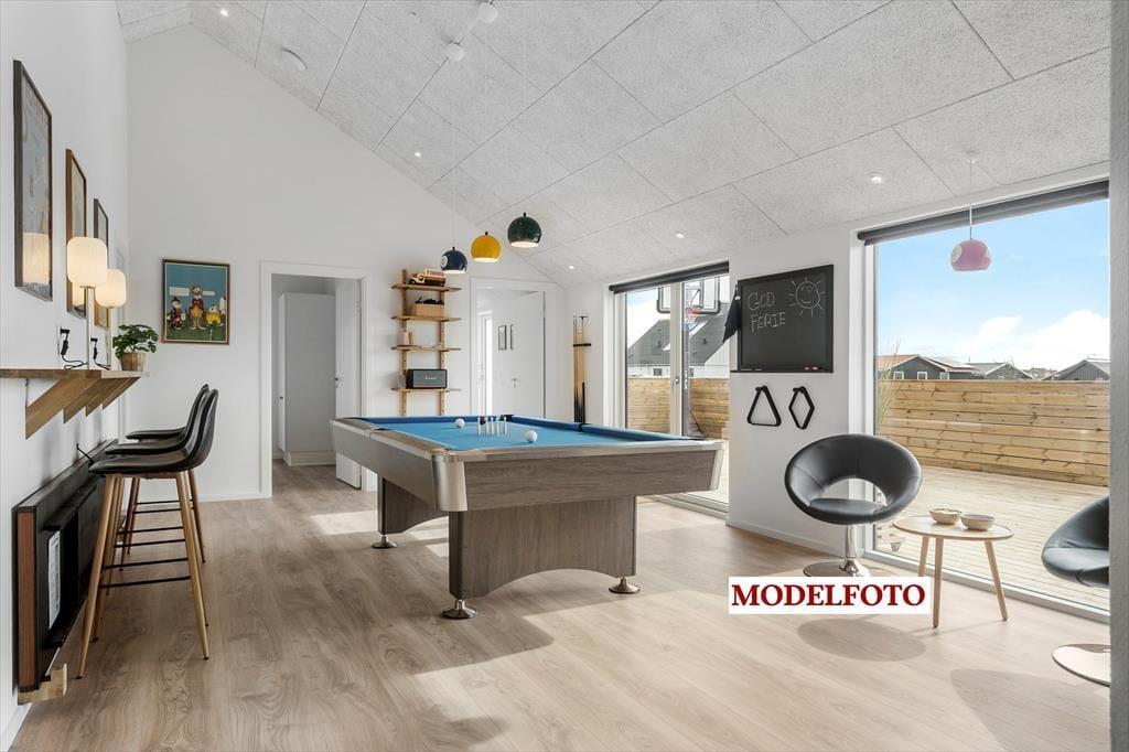 Indenfor venter en lys og moderne indretning med store vinduespartier, som lader solen og naturens skiftende lys strømme ind og understreger husets rummelige karakter. Hjertet i huset er det store opholdsrum med åbent køkken, spiseplads og stue – et oplagt sted at samles til måltider, spil og hyggelige aftener. Til familiens spillefugle og konkurrencemennesker er aktivitetsrummet et hit med både poolbord, spillekonsol og en masse gode brætspil tilgængelig – perfekt til både regnvejrsdage og hyggestunder efter stranden. De gennemtænkte detaljer skaber en rar atmosfære, hvor I hurtigt vil føle jer hjemme – uanset om det er første ferie i Vejlby Klit, eller I kommer igen år efter år.