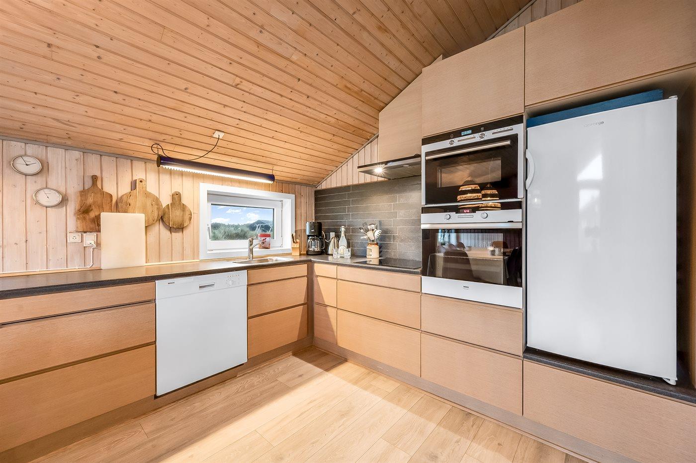 Køkkenet er udstyret med 1 køleskab. Der er 4 keramiske kogeplader, varmluftovn, mikrobølgeovn samt opvaskemaskine.
