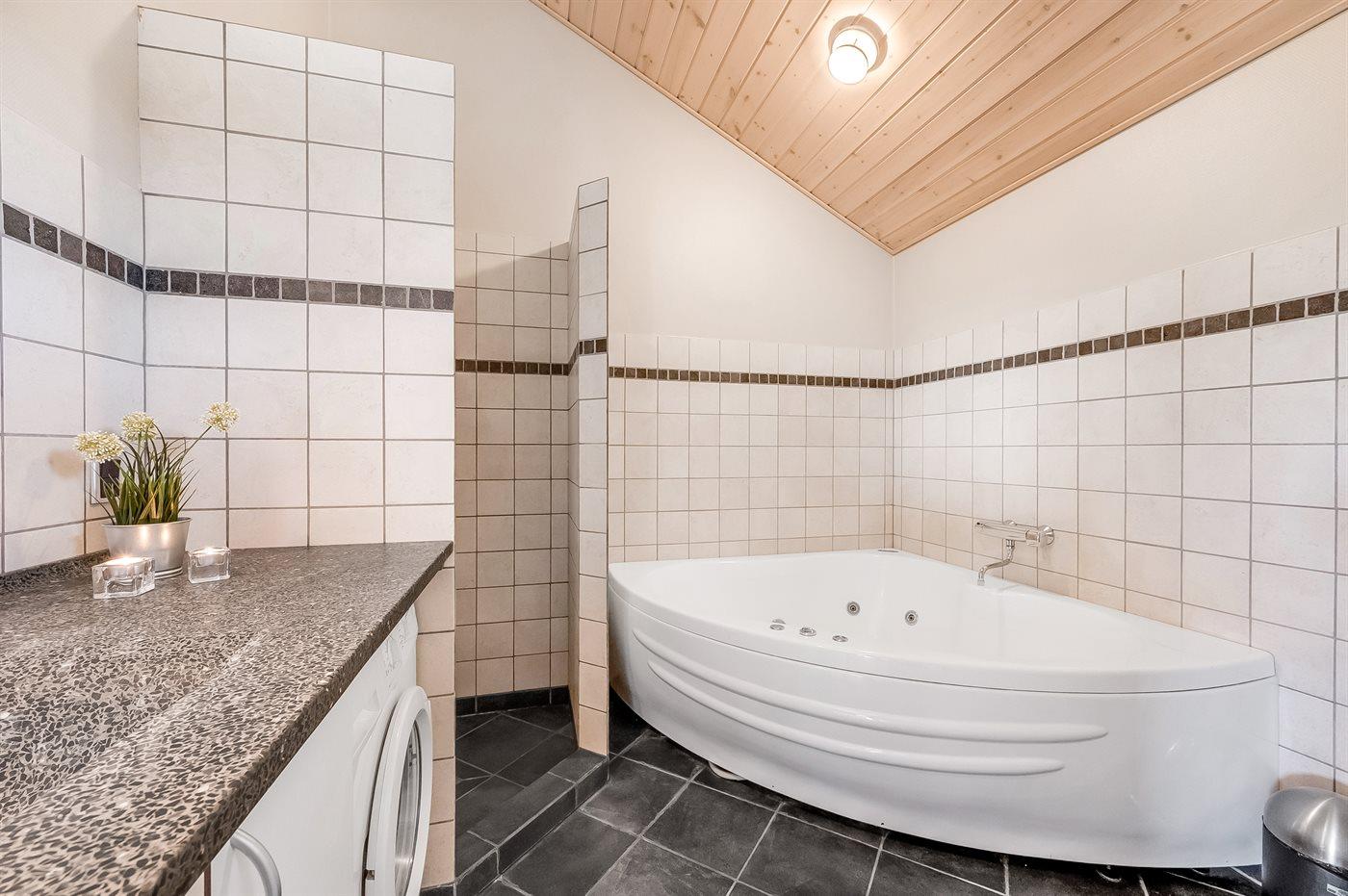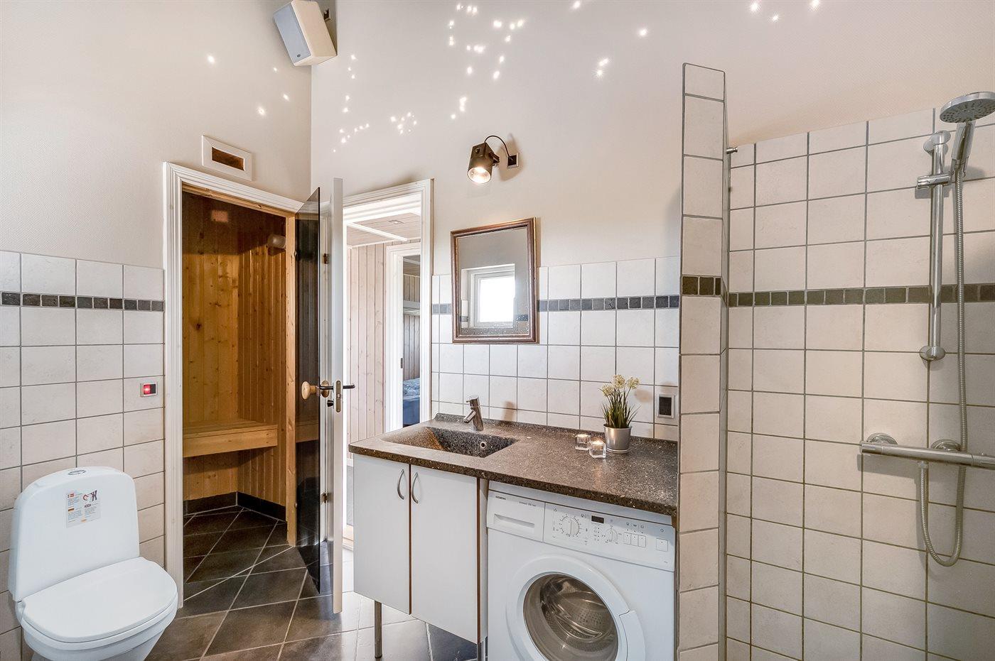 Hele huset er smagfuldt og funktionelt indrettet. Badeværelse med gulvvarme, bruseniche, adgang til 4 pers. sauna samt 3 pers. spa - dæmp lyset, tænd for massagedyserne og højtalerne på badeværelset, hvorefter stemningen fuldendes når stjernehimlen tændes efter et tryk på stikkontakten.