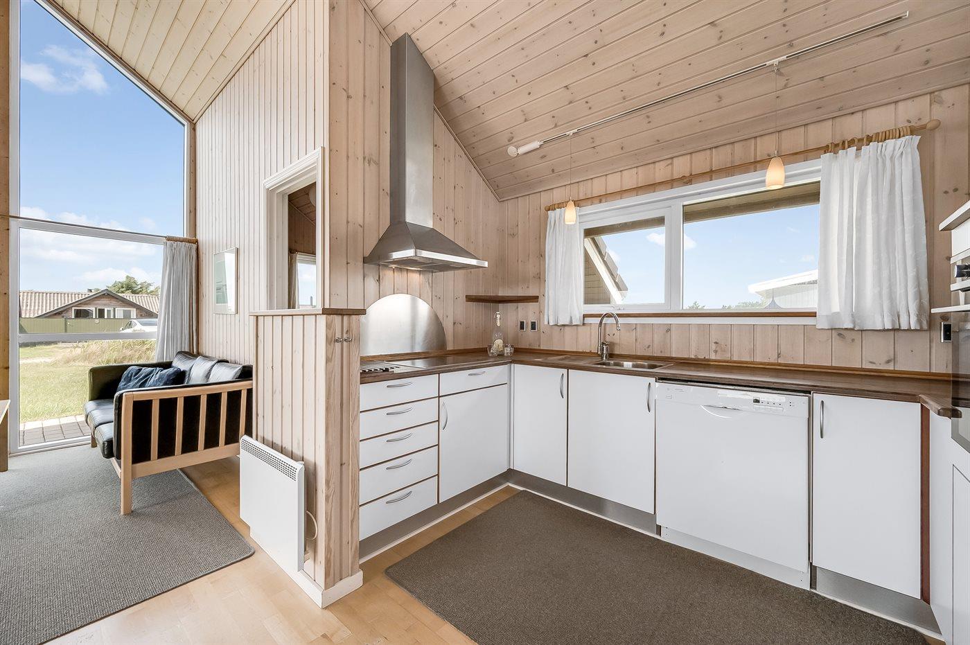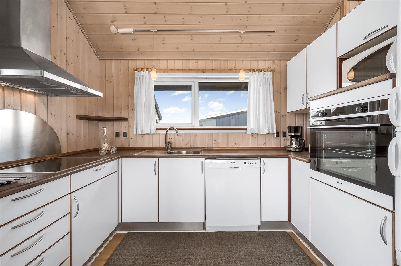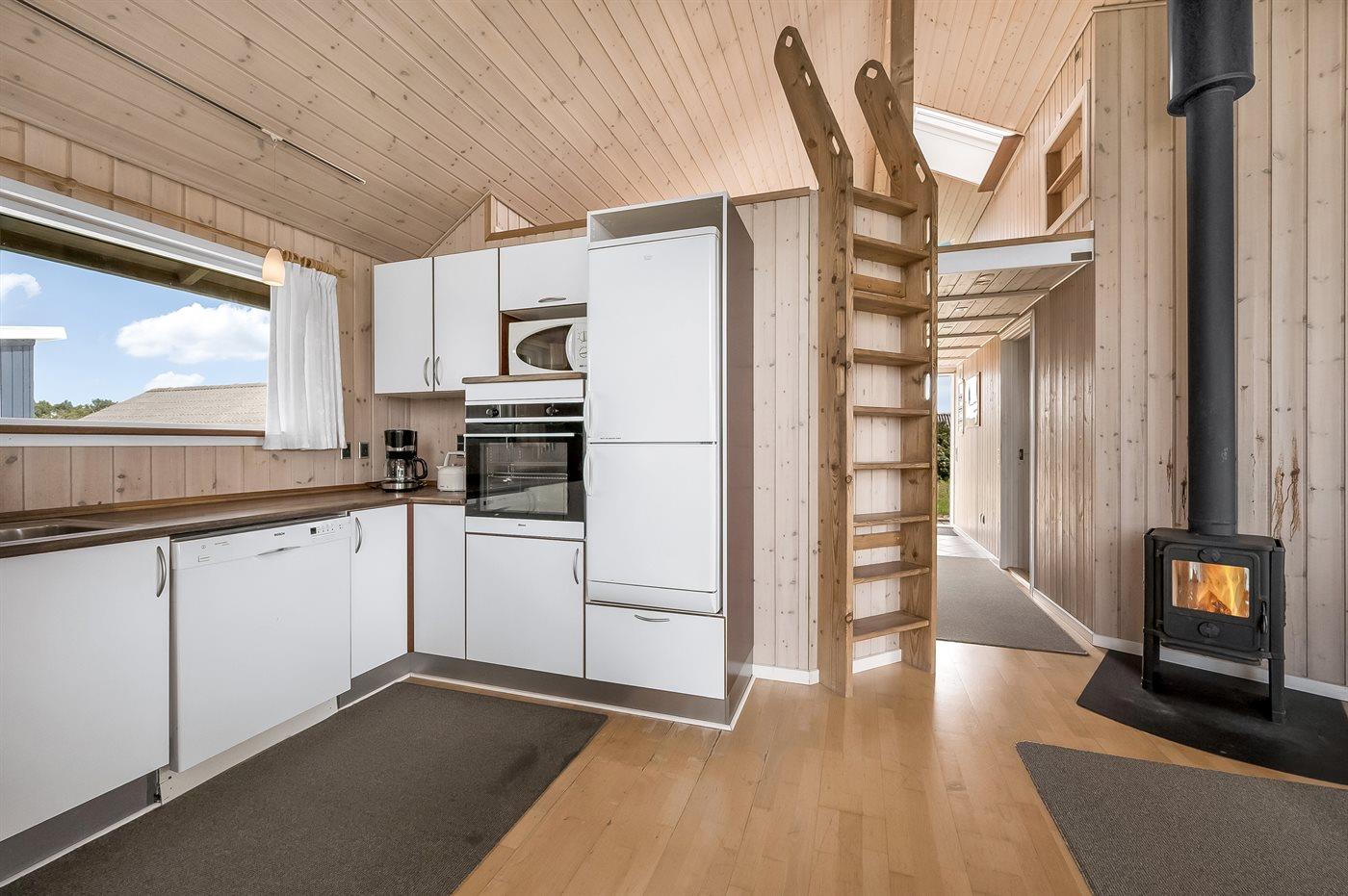 Køkkenet er kombineret med opholdsstuen og bl.a. udstyret med opvaskemaskine, mikrobølgeovn, fryser, varmluftovn og komfur med keramiske kogeplader. I den rummelige opholds-/spisestue, med adgang til den overdækkede terrasse, finder I brændeovn, stereoanlæg, video og TV med parabol (digital). Husets sovepladser fordeler sig på 3 værelser; 2 med dobbeltseng og 1 med 2 enkeltsenge.