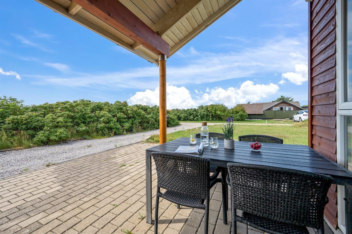 Til huset hører dejlige, såvel åbne som overdækkede terrasser med havemøbler. Nyd morgensolen og udsigten over bl.a. klitterne og Ferring Sø fra den 28 m2 store hems med delvis ståhøjde.