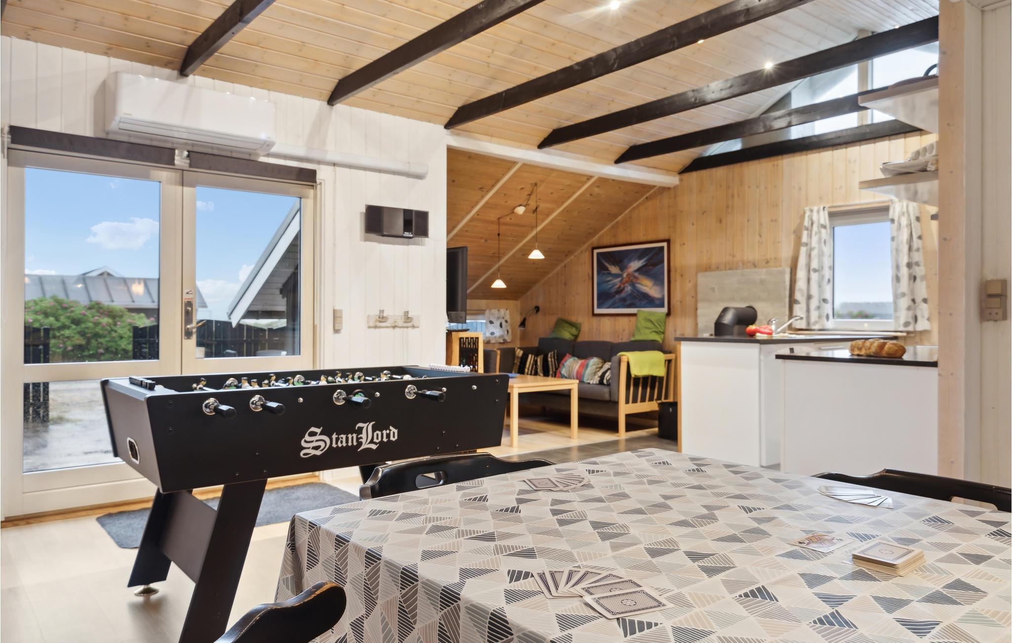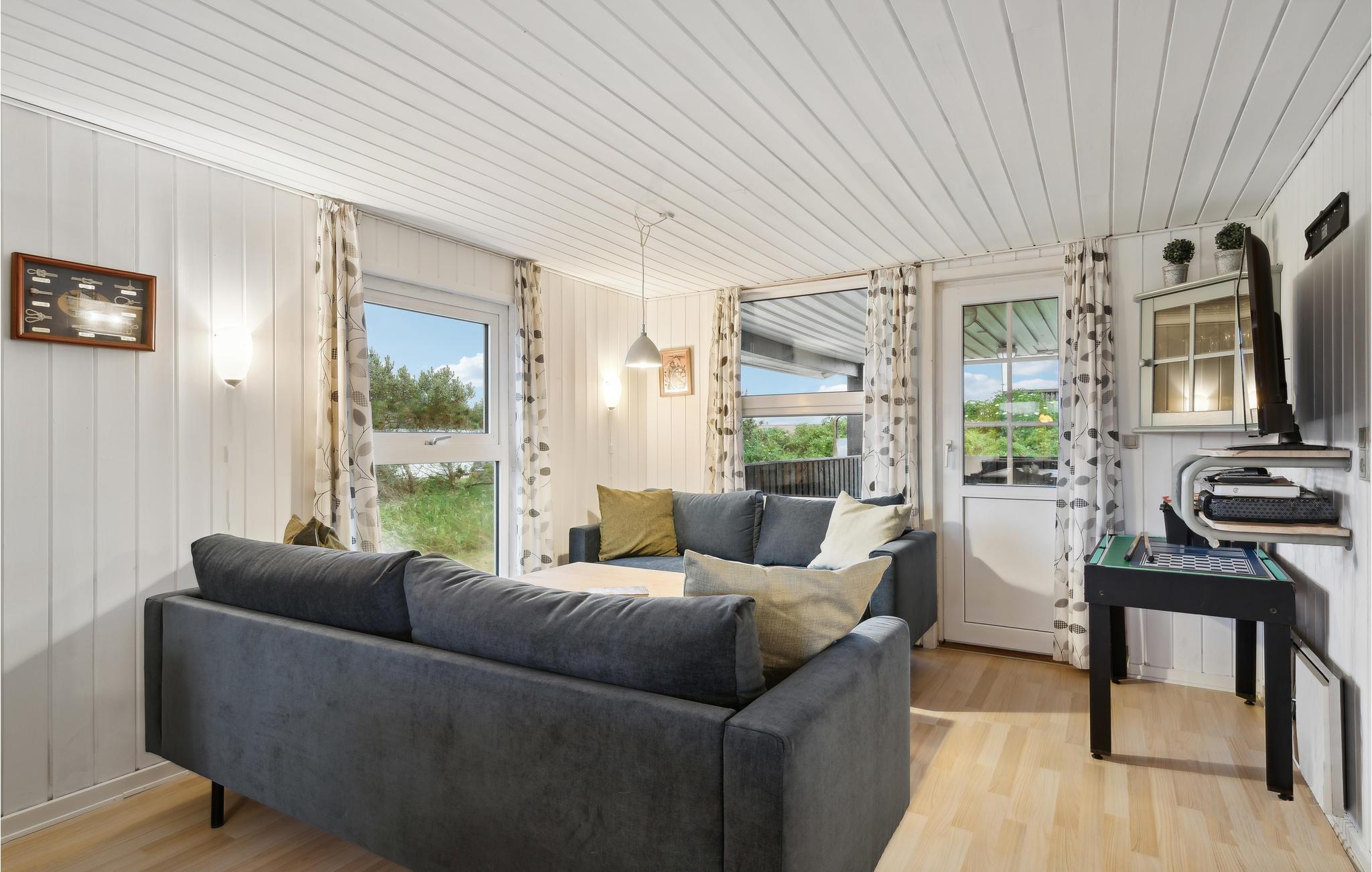 Velkommen til Vejlby Klit Strand og dette indbydende feriehus. Her er noget for enhver smag, og der er tænkt meget over farvevalg og indretning for at skabe en så hyggelig stemning som muligt. Der er hele to sofaarrangementer og dermed plads til alle og til forskellige aktiviteter. Mon ikke også der venter en bordfodboldkamp i ny og næ? Slap af i spabadet eller sved dagligdagens stress ud i saunaen. Udforsk Vejlby Klit med den brede Vesterhavsstrand og det store naturområde bag klitrækken. Den unikke, lidt barske Vesterhavsnatur er en fryd på alle årstider. Om sommeren kan I nyde at bade i det friske hav og lege på stranden. Om efteråret og vinteren er der ikke noget bedre end lange gåture på stranden.