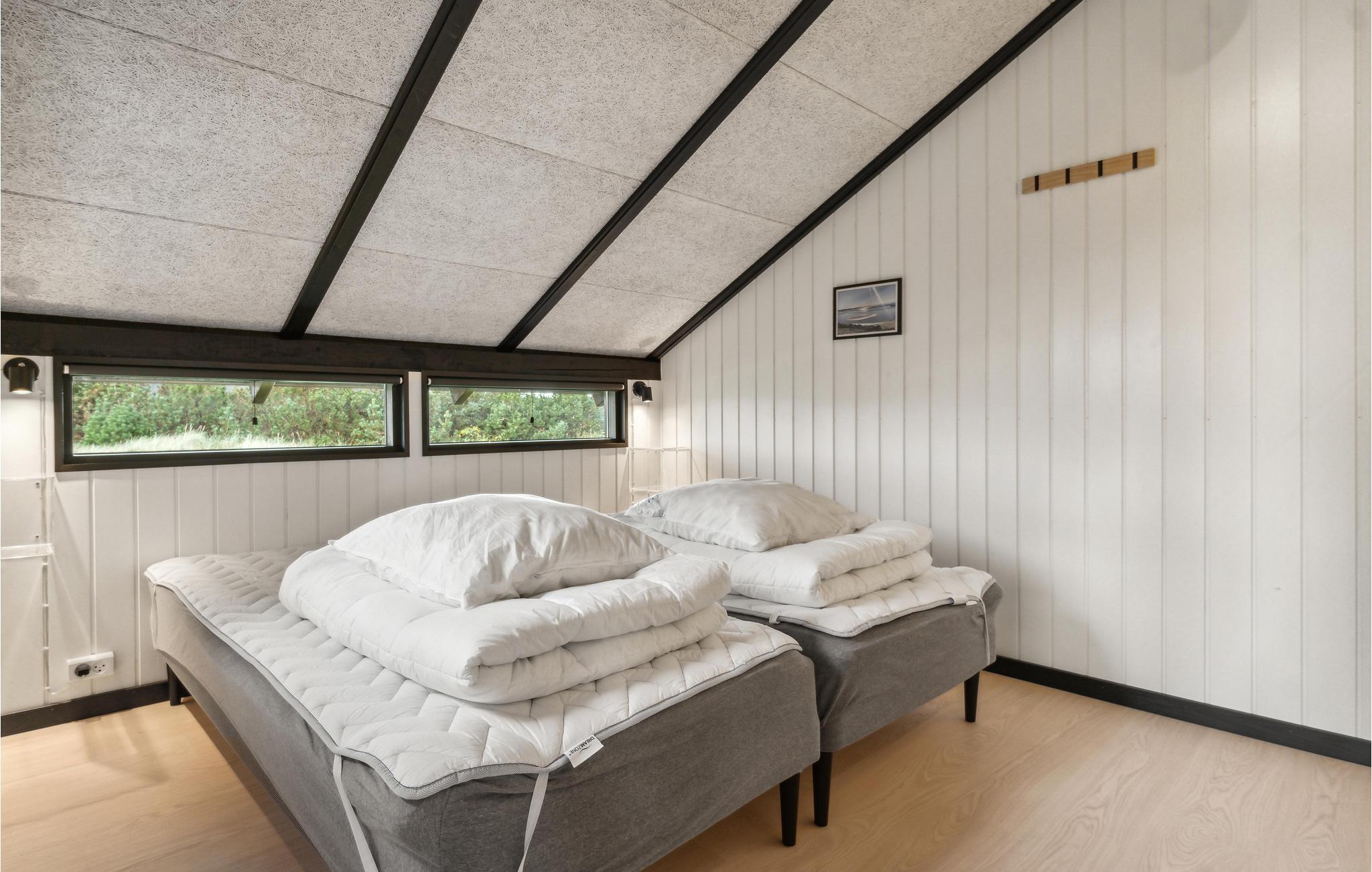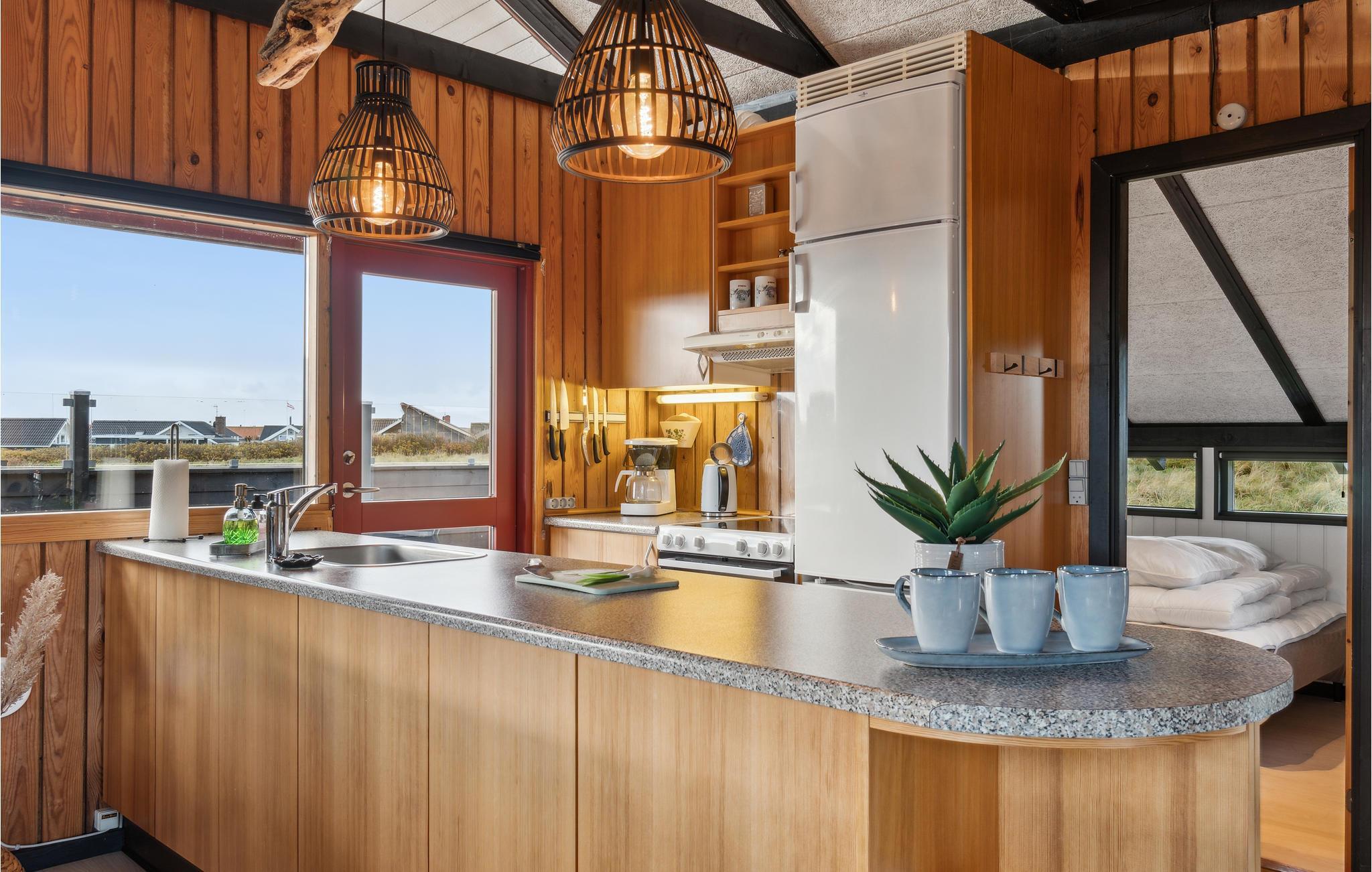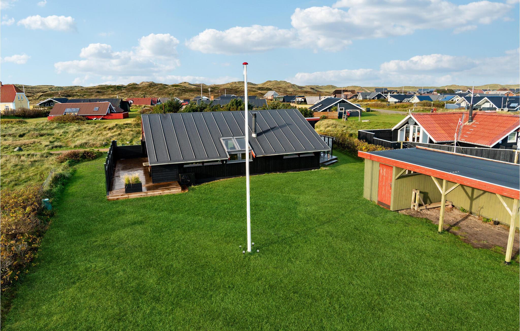 Velkommen til dette dejlige hus, som byder velkommen i et smukt klitlandskab i kort afstand til søen. Det mørke træ og de sorte bjælker danner sammen med den behagelige indretning en varm atmosfære, det rigtige sted at slappe af med familien. Uanset om I laver mad og spiser sammen eller sludrer tilbagelænet i sofaerne, kan I nyde jeres tid sammen i fulde drag. Det bliver endnu hyggeligere, når I tænder op i brændeovnen. I kan nyde solen på terrassen og glæde hele familien med lækre grillretter om aftenen. En aftengåtur til søen er en dejlig måde at runde en herlig feriedag af på.