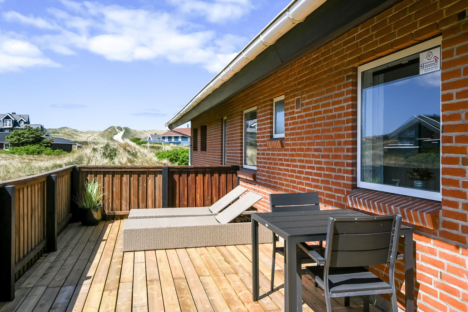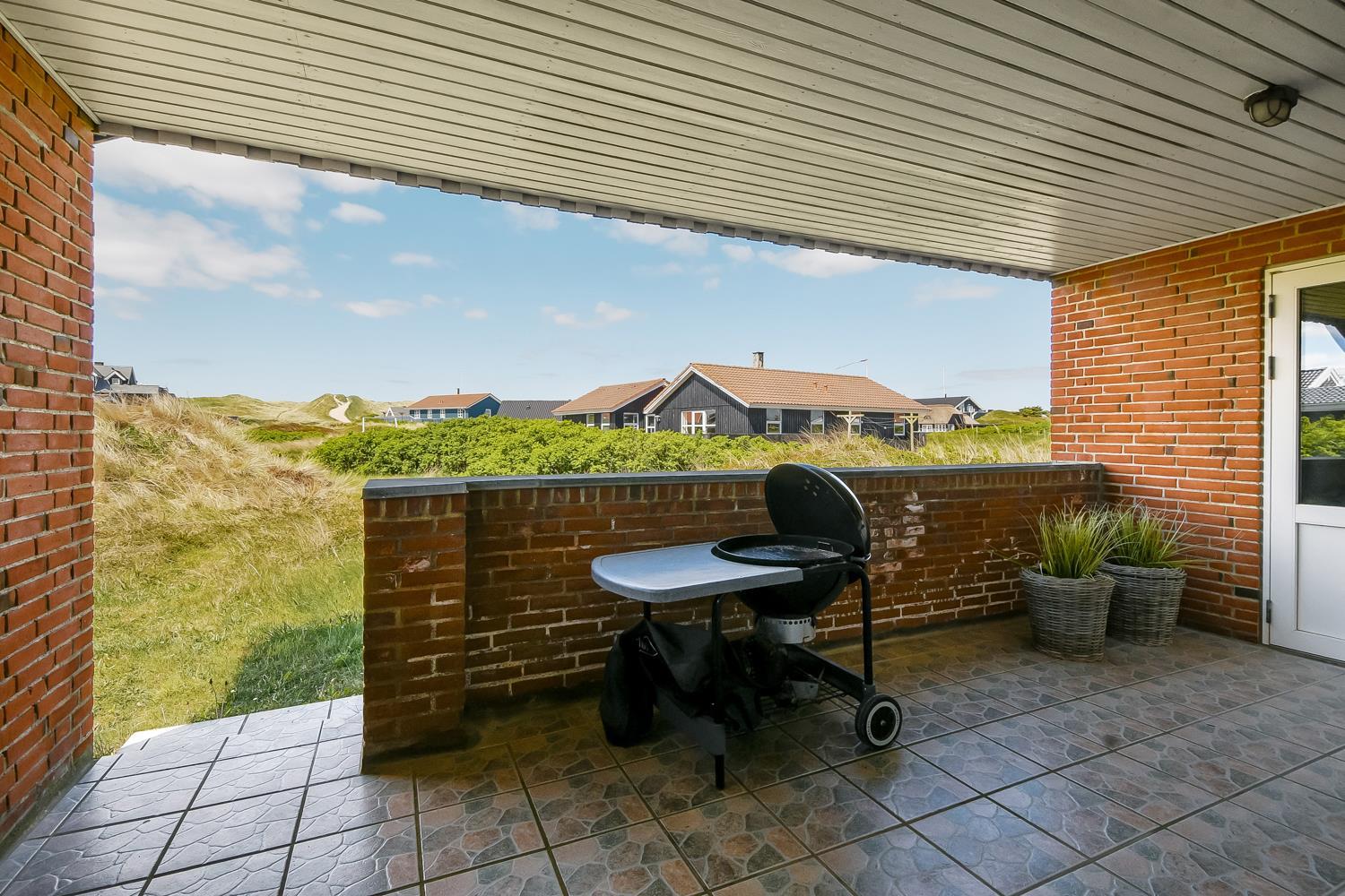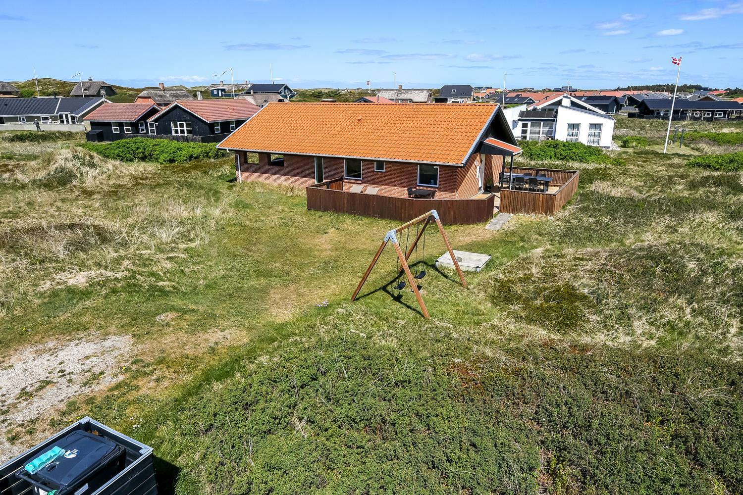 Huset ligger på en ca. 1.358 m2 dejlig grund. Fra stuen er udgang til et helt fantastisk, overdækket terasse. Herudover er der også et dejlig stort terrasseanlæg med gode havemøbler, liggestole og grill som nemt kan flyttes til en plads i solen. Et terrasseanlæg hvor der altid er læ, selv på blæsende dage, og hvor man altid kan nyde udsigten til de høje klitter. En åben naturgrund bekræfter de mange muligheder. Vesterhavet ligger kun 250 fra huset og det er altid en fornøjelse at komme op at se hvordan havet nu "har det". Om sommeren er der fine bademuligheder og børnene kan få mange timer til at gå med at lave sandborge eller små dæmninger i sandet, mens det voksne kan ligge og slappe af. Her er nemlig altid masser af plads, så man føler man får stranden for sig selv. Der er 700m til nærmeste indkøbsmulighed på torvet i Vejlby Klit Vrist, som dog kun har åbent i sæsonen. Dette helt specielle og meget charmerende feriehus byder på en ferieoplevelse i særklasse uanset årstid.