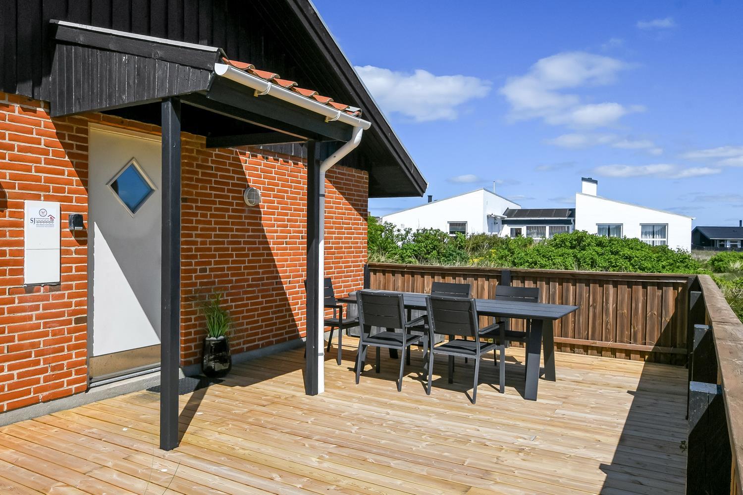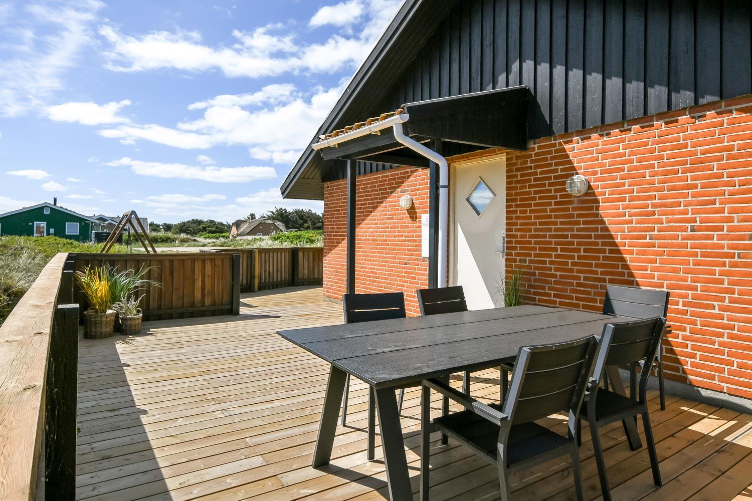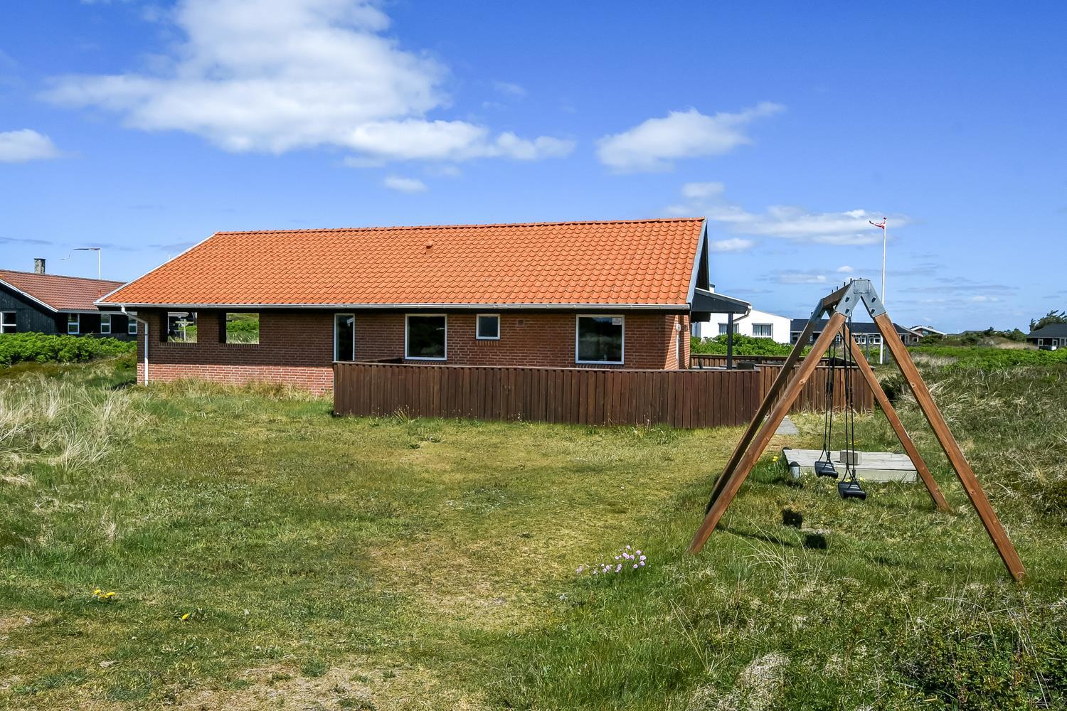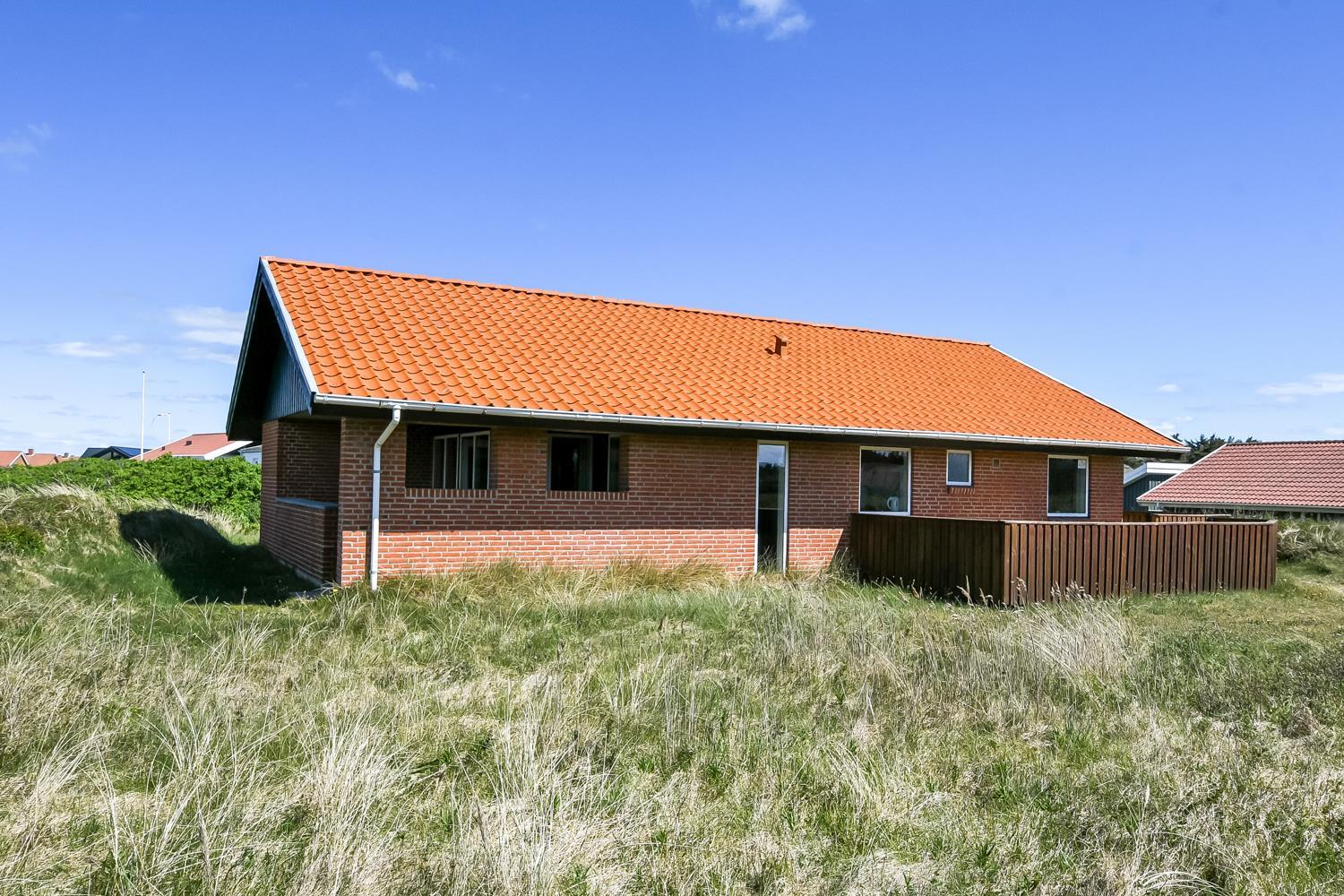 Huset ligger på en ca. 1.358 m2 dejlig grund. Fra stuen er udgang til et helt fantastisk, overdækket terasse. Herudover er der også et dejlig stort terrasseanlæg med gode havemøbler, liggestole og grill som nemt kan flyttes til en plads i solen. Et terrasseanlæg hvor der altid er læ, selv på blæsende dage, og hvor man altid kan nyde udsigten til de høje klitter. En åben naturgrund bekræfter de mange muligheder. Vesterhavet ligger kun 250 fra huset og det er altid en fornøjelse at komme op at se hvordan havet nu "har det". Om sommeren er der fine bademuligheder og børnene kan få mange timer til at gå med at lave sandborge eller små dæmninger i sandet, mens det voksne kan ligge og slappe af. Her er nemlig altid masser af plads, så man føler man får stranden for sig selv. Der er 700m til nærmeste indkøbsmulighed på torvet i Vejlby Klit Vrist, som dog kun har åbent i sæsonen. Dette helt specielle og meget charmerende feriehus byder på en ferieoplevelse i særklasse uanset årstid.