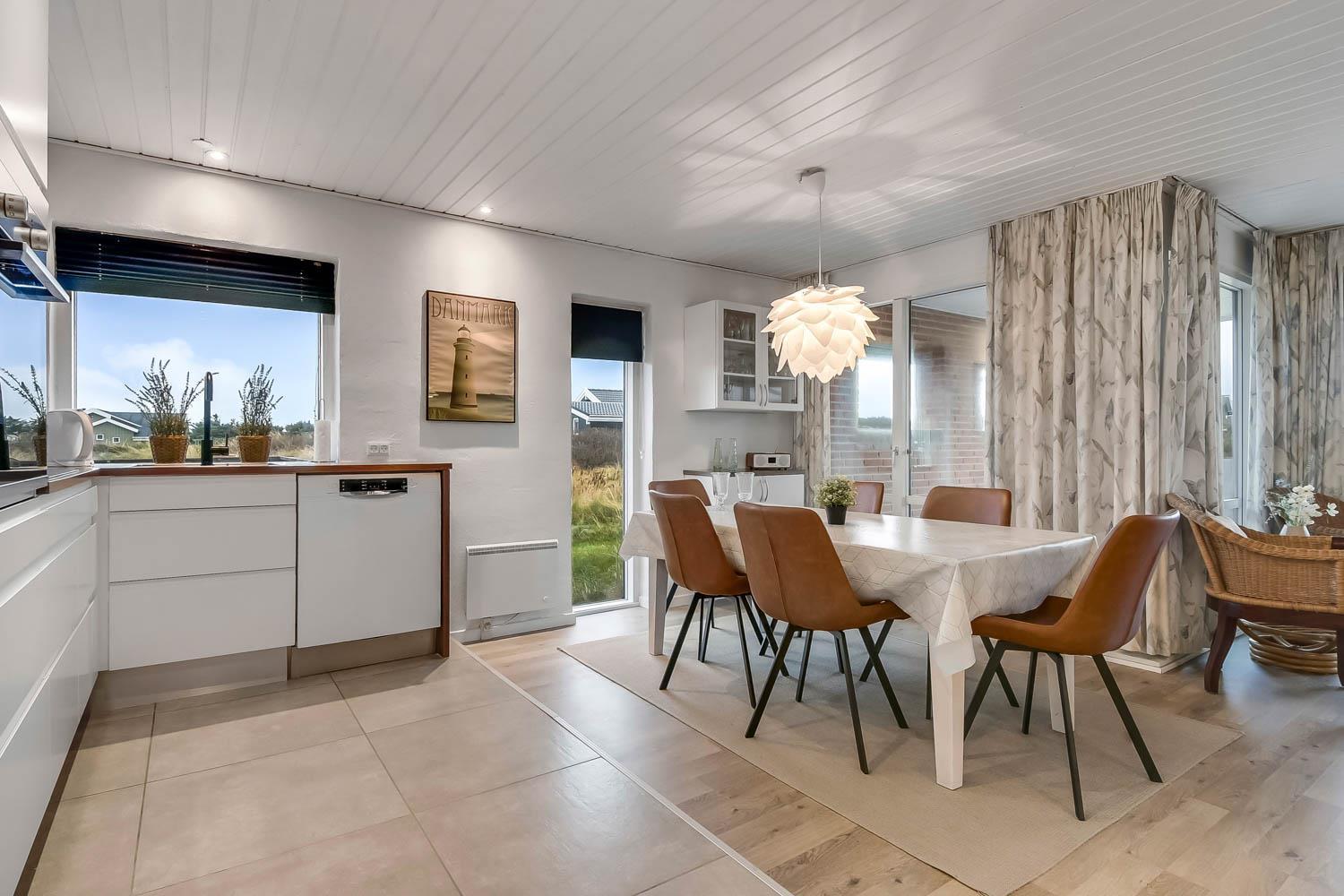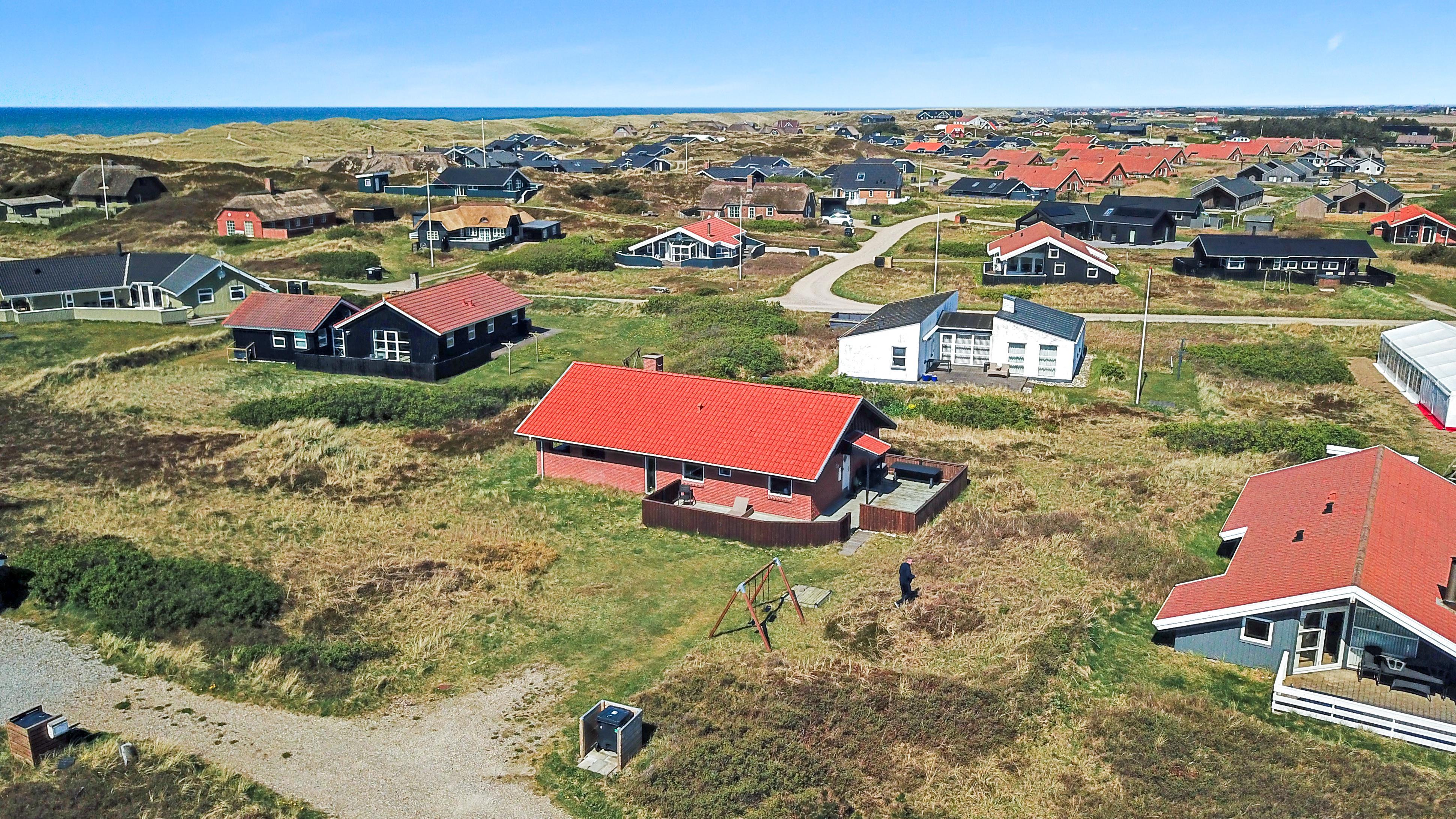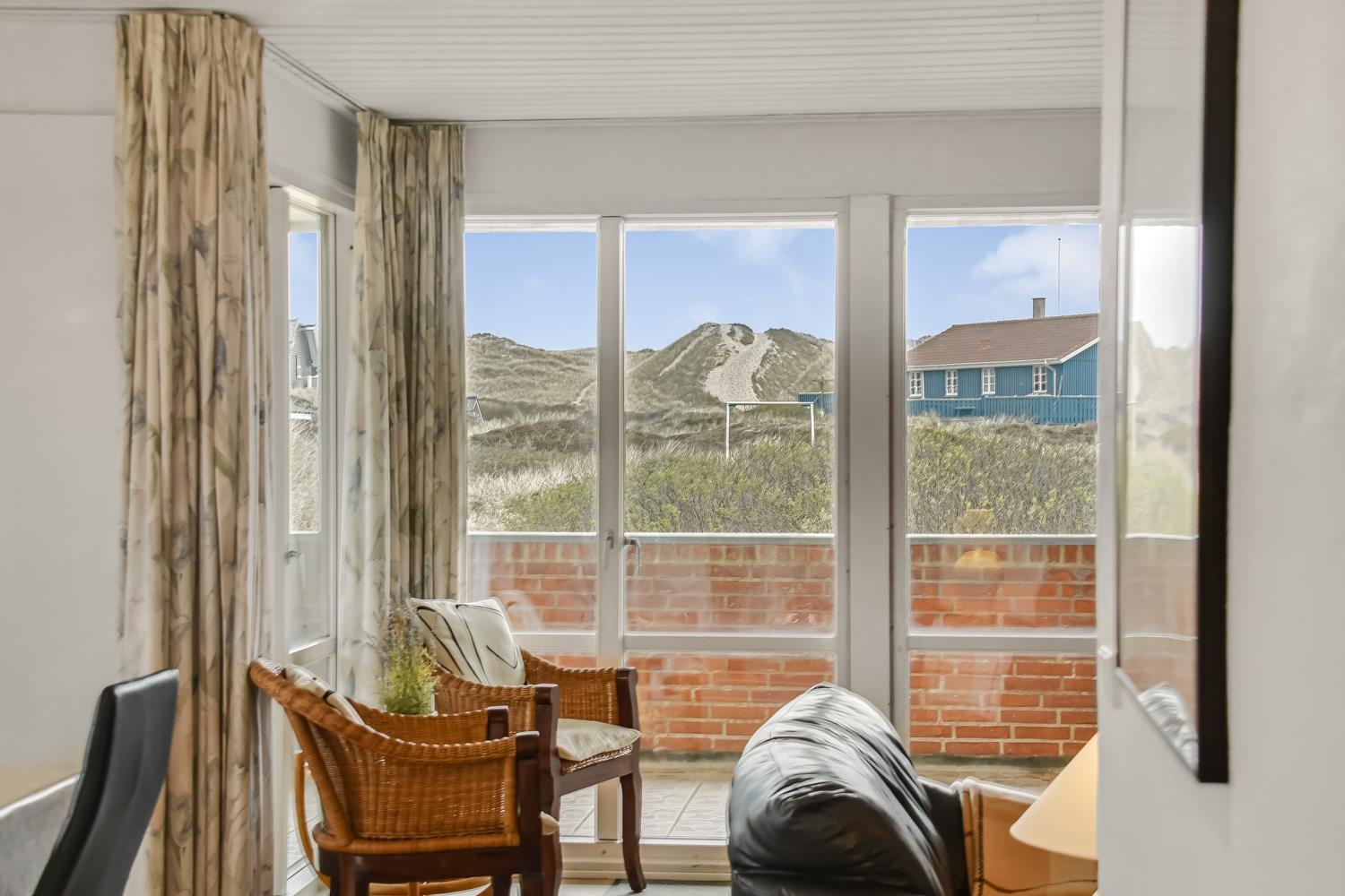 Allerede når bilen rammer grusvejen, bliver det klart at beliggenhed og hus er noget ganske særligt. Når man drejer ind på grunden og parkerer bilen begynder ferien. En dejlig entre byder jer velkommen og fører jer direkte ind i en fordeler gang, hvor der er adgang til husets 3 soverum og badeværelse. Flot, moderne køkkenhjørne med udsigt til de høje klitter ved Vesterhavet. Køkkenet har alt i service og køkkengrej og er også udstyret med keramisk kogeplade, indbygningsovn, emhætte, mikroovn, køleskab med fryseboks og opvaskemaskine. Der er et trin fra køkkenet og ned til spiseafdelingen med spisebord og stole. Opholdsstuen har en dejlige lædermøbler og TV med danske som tyske kanaler. En dejlig brændeovn som giver ekstra hygge og behagelig varme. Fra stuen er der ligeledes udsigt til Klitterne. 3 værelser (1DS, 2S, 2S). Husets badeværelse har bruser, toilet, håndvask og klinkegulv med gulvvarme. Hele huset har trægulve. Ikke ryger hus. Husdyr ikke tilladt.