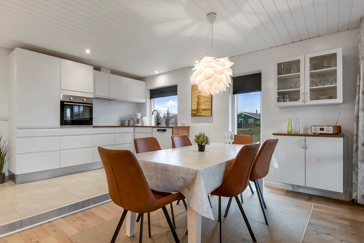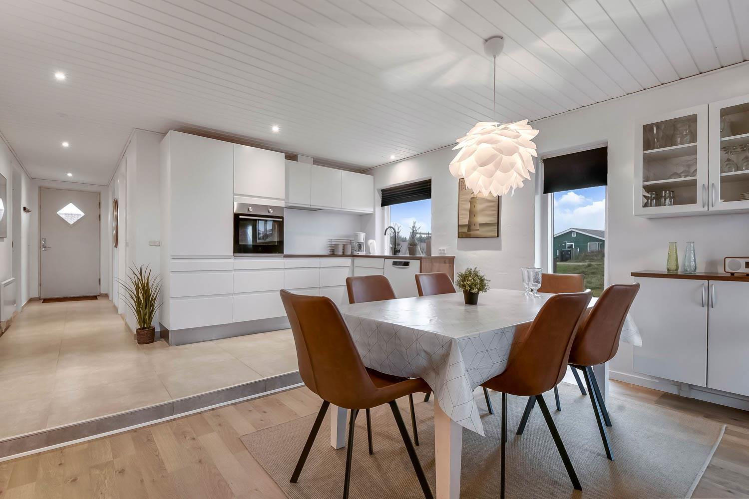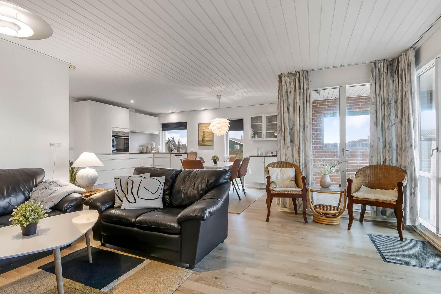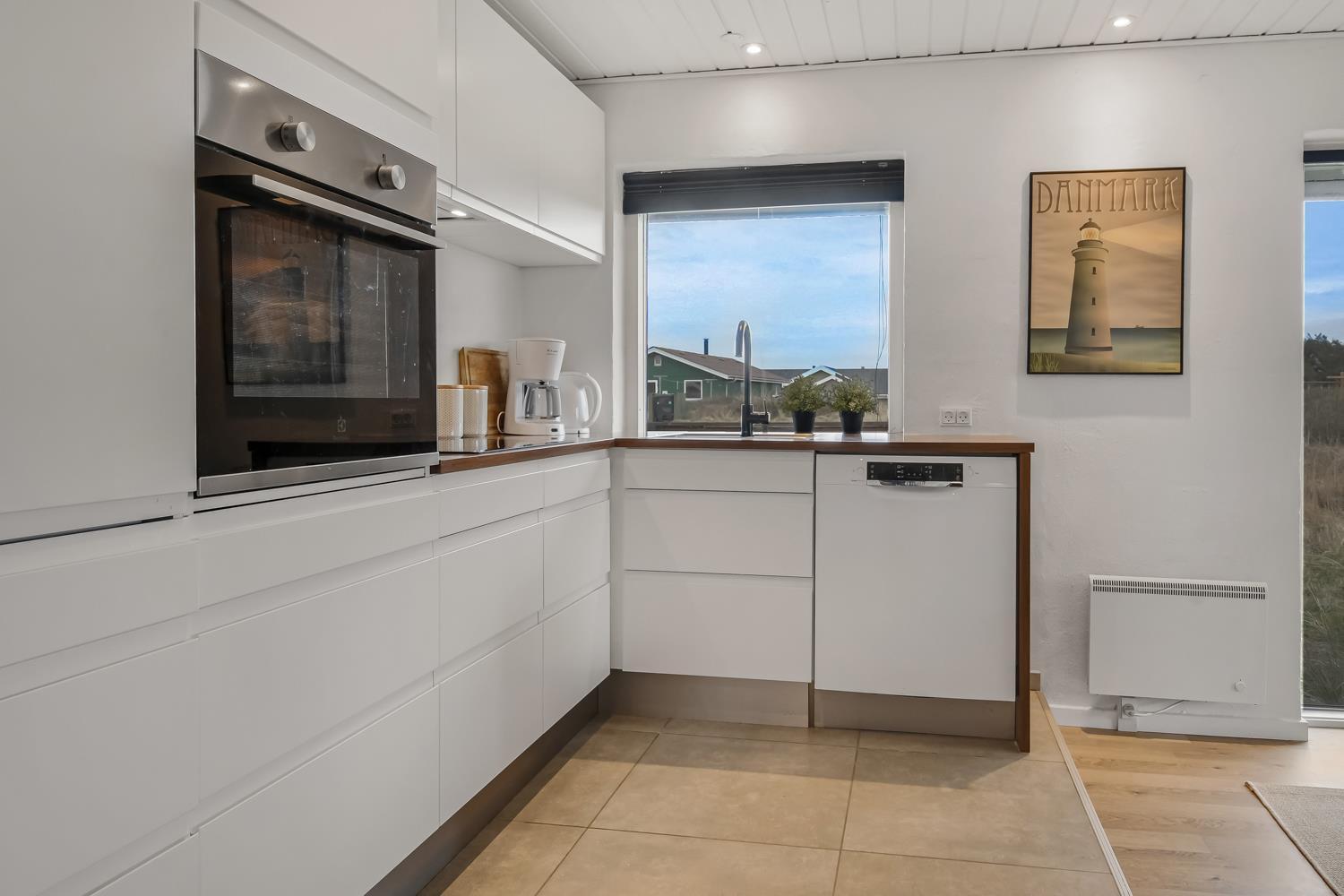 Allerede når bilen rammer grusvejen, bliver det klart at beliggenhed og hus er noget ganske særligt. Når man drejer ind på grunden og parkerer bilen begynder ferien. En dejlig entre byder jer velkommen og fører jer direkte ind i en fordeler gang, hvor der er adgang til husets 3 soverum og badeværelse. Flot, moderne køkkenhjørne med udsigt til de høje klitter ved Vesterhavet. Køkkenet har alt i service og køkkengrej og er også udstyret med keramisk kogeplade, indbygningsovn, emhætte, mikroovn, køleskab med fryseboks og opvaskemaskine. Der er et trin fra køkkenet og ned til spiseafdelingen med spisebord og stole. Opholdsstuen har en dejlige lædermøbler og TV med danske som tyske kanaler. En dejlig brændeovn som giver ekstra hygge og behagelig varme. Fra stuen er der ligeledes udsigt til Klitterne. 3 værelser (1DS, 2S, 2S). Husets badeværelse har bruser, toilet, håndvask og klinkegulv med gulvvarme. Hele huset har trægulve. Ikke ryger hus. Husdyr ikke tilladt.