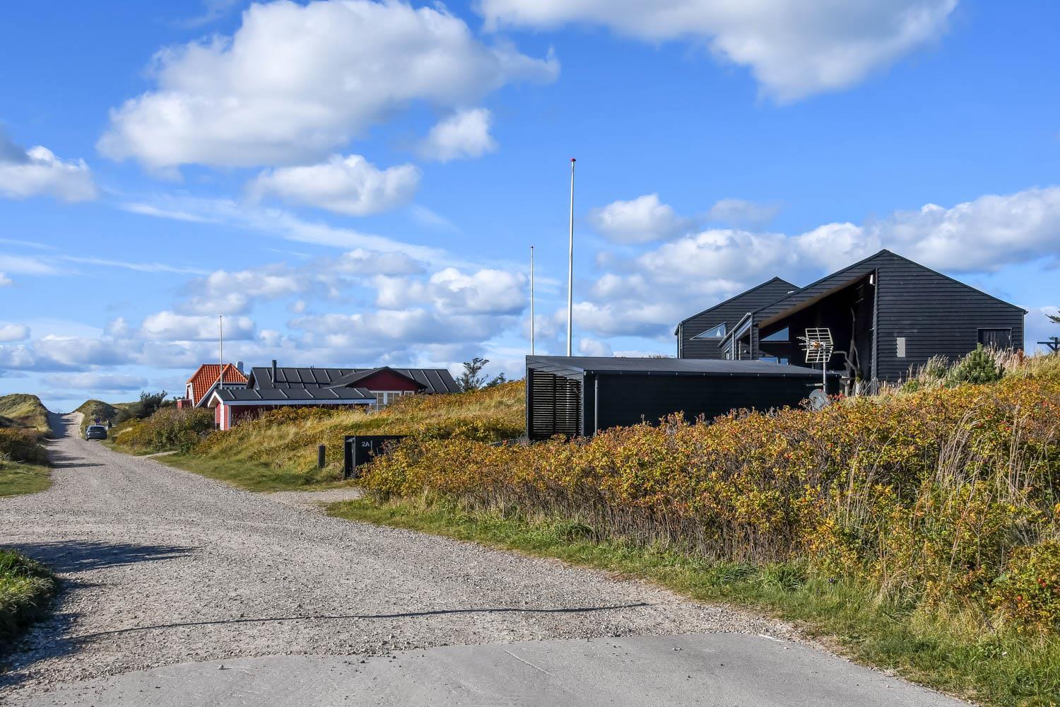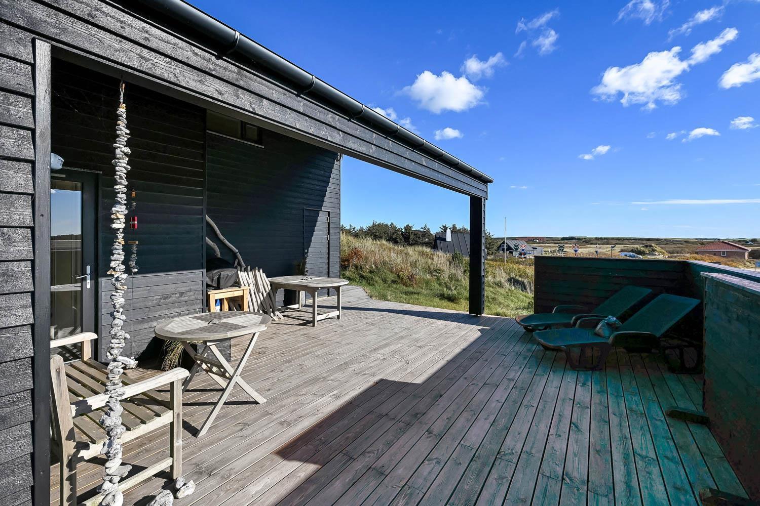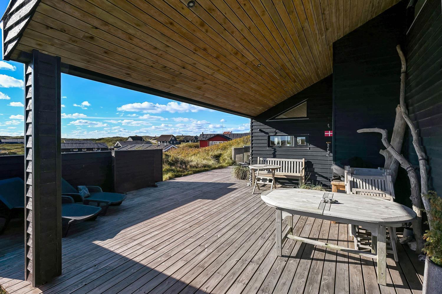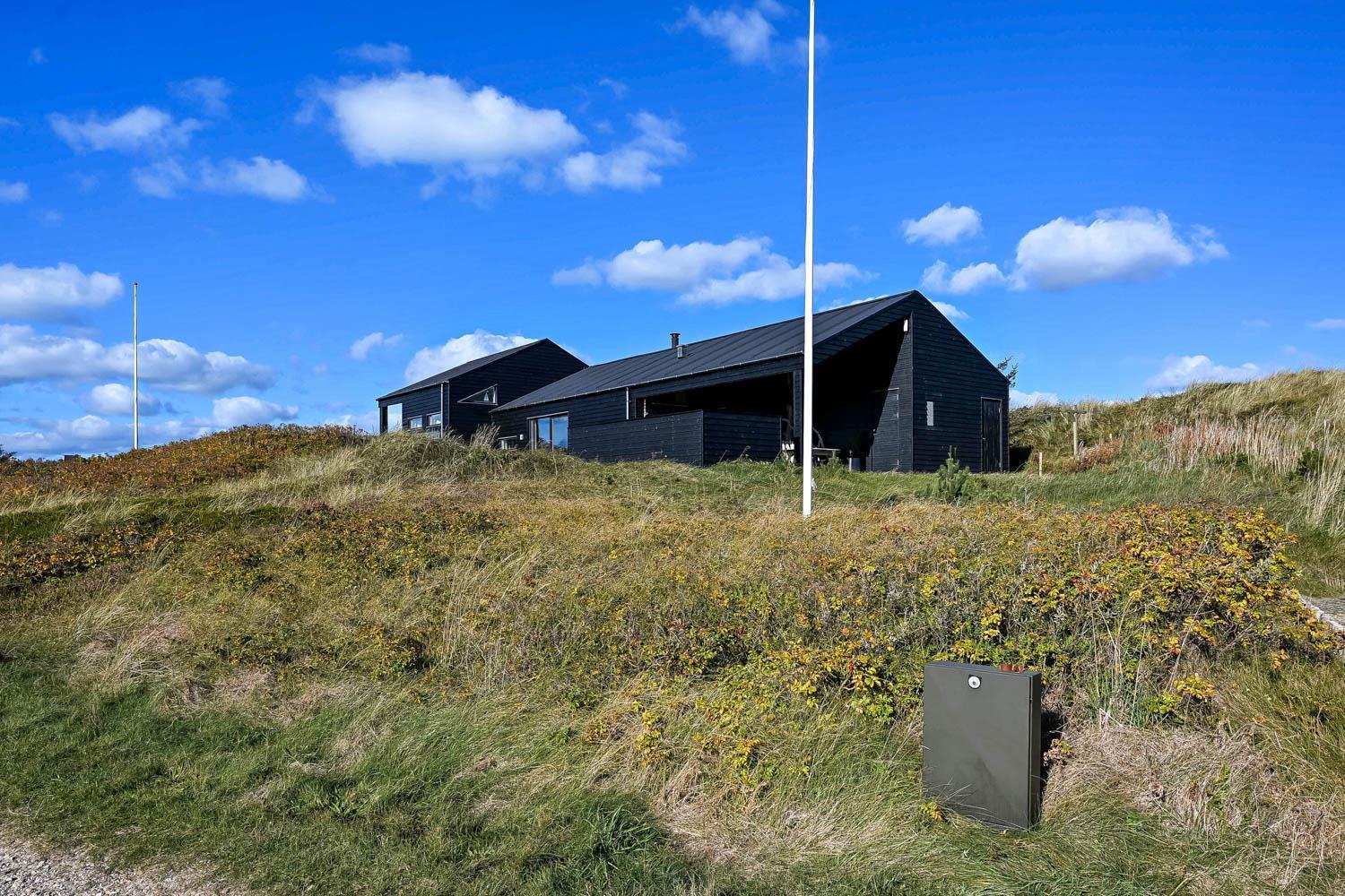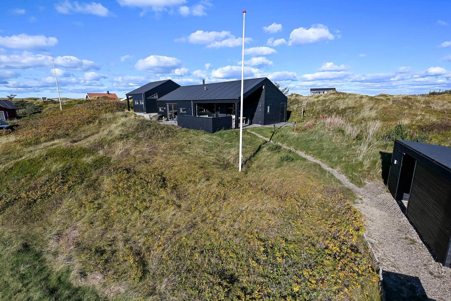 På en 2500 m2 dejlig, kuperet naturgrund med en fantastisk udsigt til klitterne, og kun 200 m fra Vesterhavet, ligger dette pragtfulde feriehus på 125 m2 + redskabsrum. Huset er minimalistisk i sit udtryk og praktisk indrettet. En flot entrè byder velkommen indeholdende skabe samt vaskemaskine og tørretumbler. Køkken alrummet er med loft til kip og betongulv. Her findes der en brændeovn, og køkkenet indeholder opvaskemaskine, keramisk kogeplade, ovn, køl og frys samt vinkøleskab. Fra køkken alrummet er der en opgang til opholdsstuen, hvor der ligeledes er loft til kip samt parketgulv. Heroppe findes der er et fladskærms-TV med danske og tyske kanaler samt chromecast. Chromecast gør det muligt via mobiltelefonen eller tablet at se film eller streaming på fladskærmen. Herudover er der en bluetooth-højtaler som også gør det muligt at høre radio eller musik via egen mobiltelefon. Huset indeholder stort badeværelse med toilet, håndvask, spa, sauna, bruseniche og gulvvarme samt udgang til ugeneret udendørsbruser et plus når man lige kommer fra stranden. Der er et mindre badeværelse med bruseniche toilet, håndvask og gulvvarme. Huset har 3 fine soveværelser med parketgulve og skabe (1DS, 1DS,, 1DS). Der er gratis trådløs internetadgang. Der findes varmeluftpumpe, som reducerer varmeforbruget. Rygning eller husdyr er ikke tilladt.