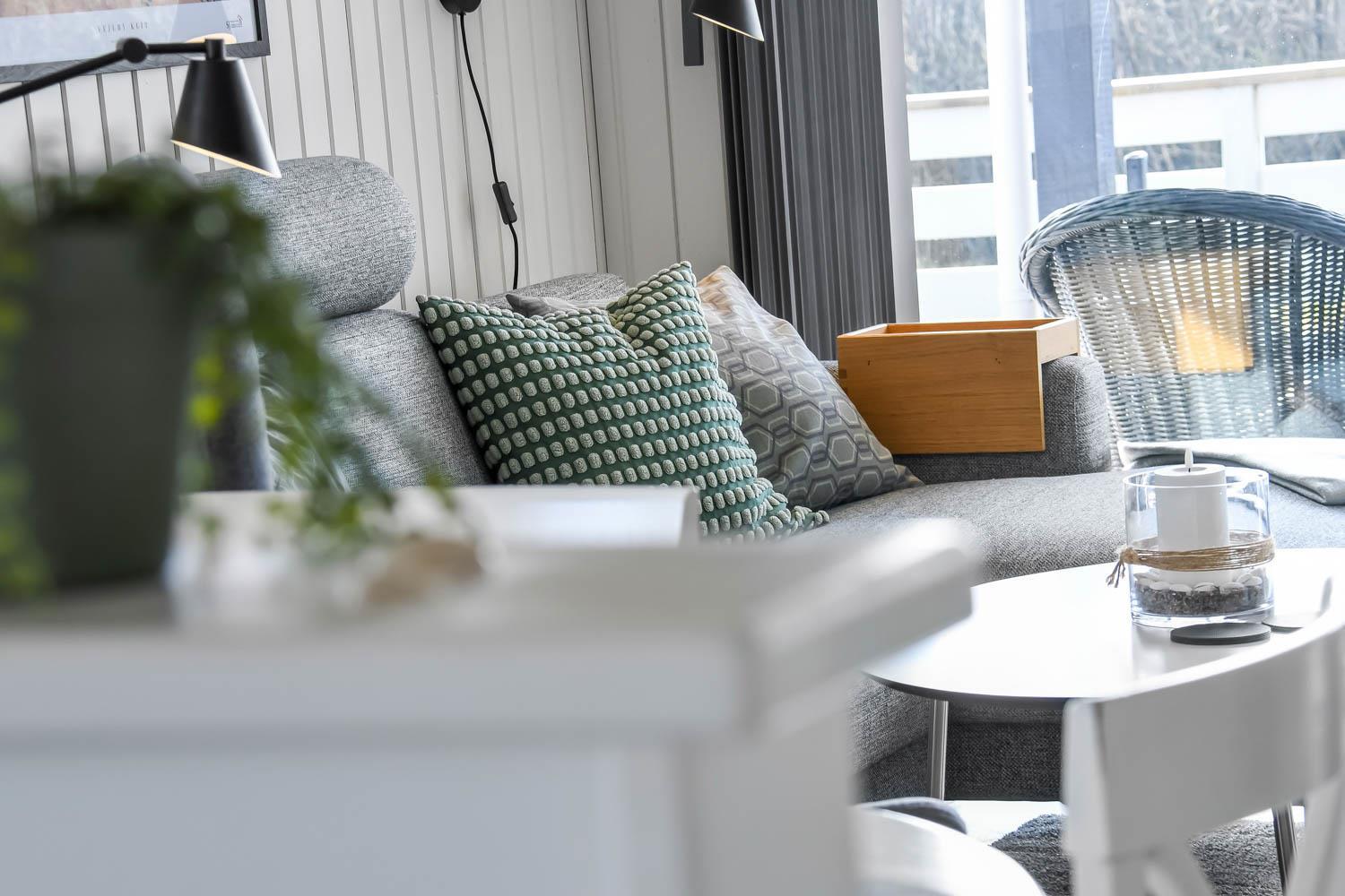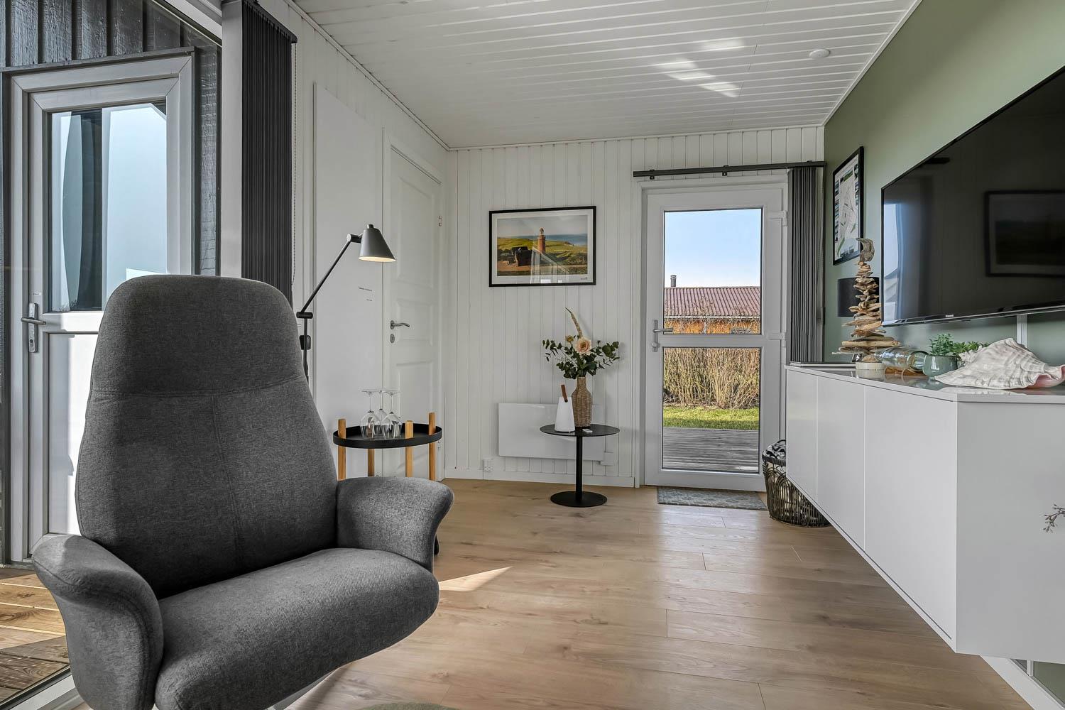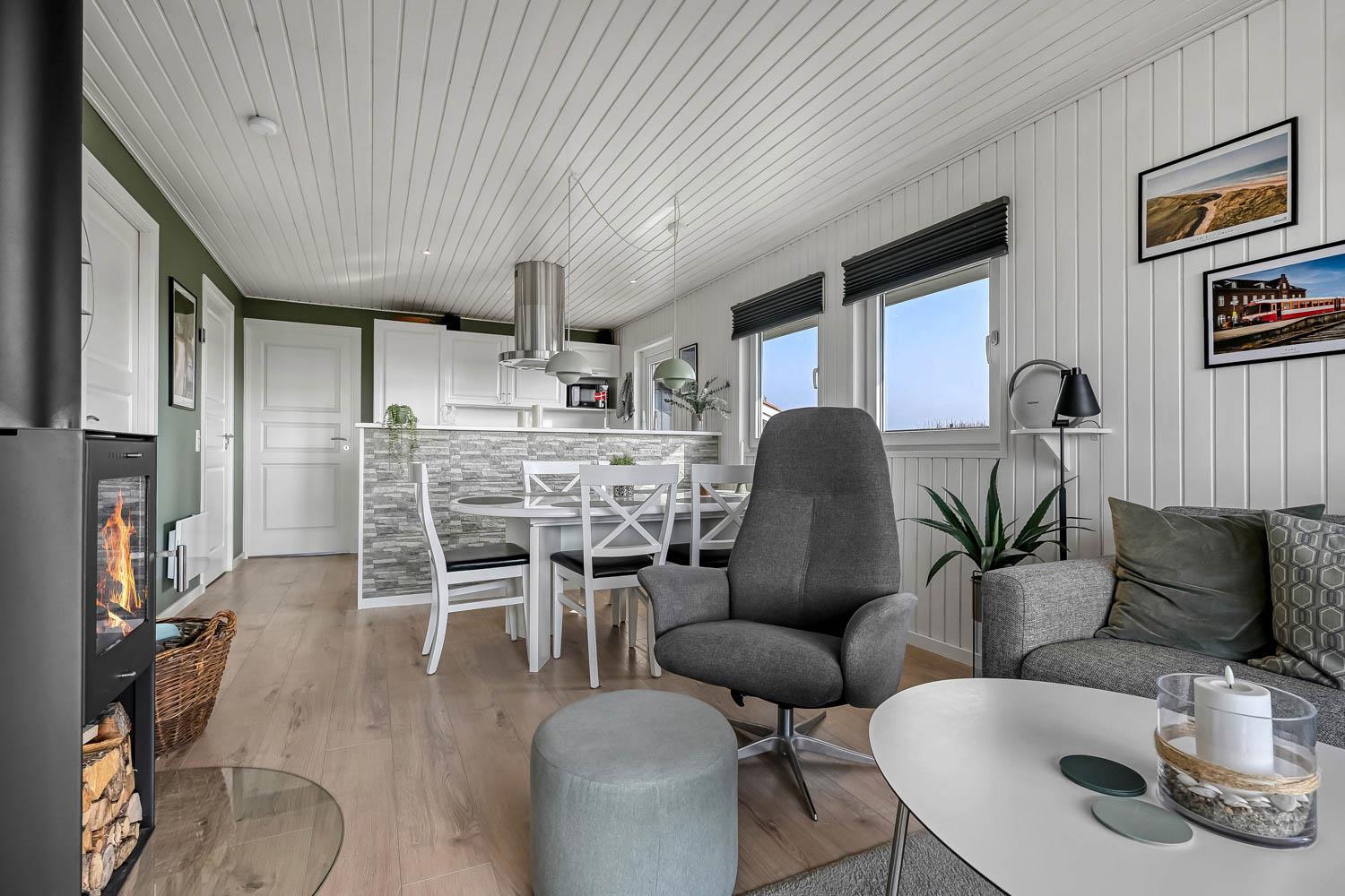 Husets stue og køkken er i samme rum og fra stuen er der direkte adgang til det store terrasseanlæg, som vender mod syd ved indgangen til stuen. Køkkenet har glaskeramisk komfur med emhætte, køle-fryseskab, mikrobølgeovn og en opvaskemaskine. Mellem stuen og køkkenet står spisebordet med stole og i enden af huset ligger selve stuen. Her er der sofagruppe med stuebord. Brændeovn og varmepumpe søger for at alle kan holde varmen året rundt og samtidig kan spare på forbruget. Der er ligeledes et smart-tv med mulighed for at se tysk og dansk TV, DVD-afspiller samt streaming af TV, radio og apps via Chromecast. Herudover er der også CD-adspiller og radio hvis man for eksempel ønsker noget baggrundsmusik til hyggen. Badeværelset med klinkegulv med gulvvarme, bruser, vaskemaskine, tørretumbler, toilet, håndvask. Der er 3 soveværelser i huset (1DS, 1DS, 1DS). Ikke-ryger hus. Husdyr ikke tilladt.