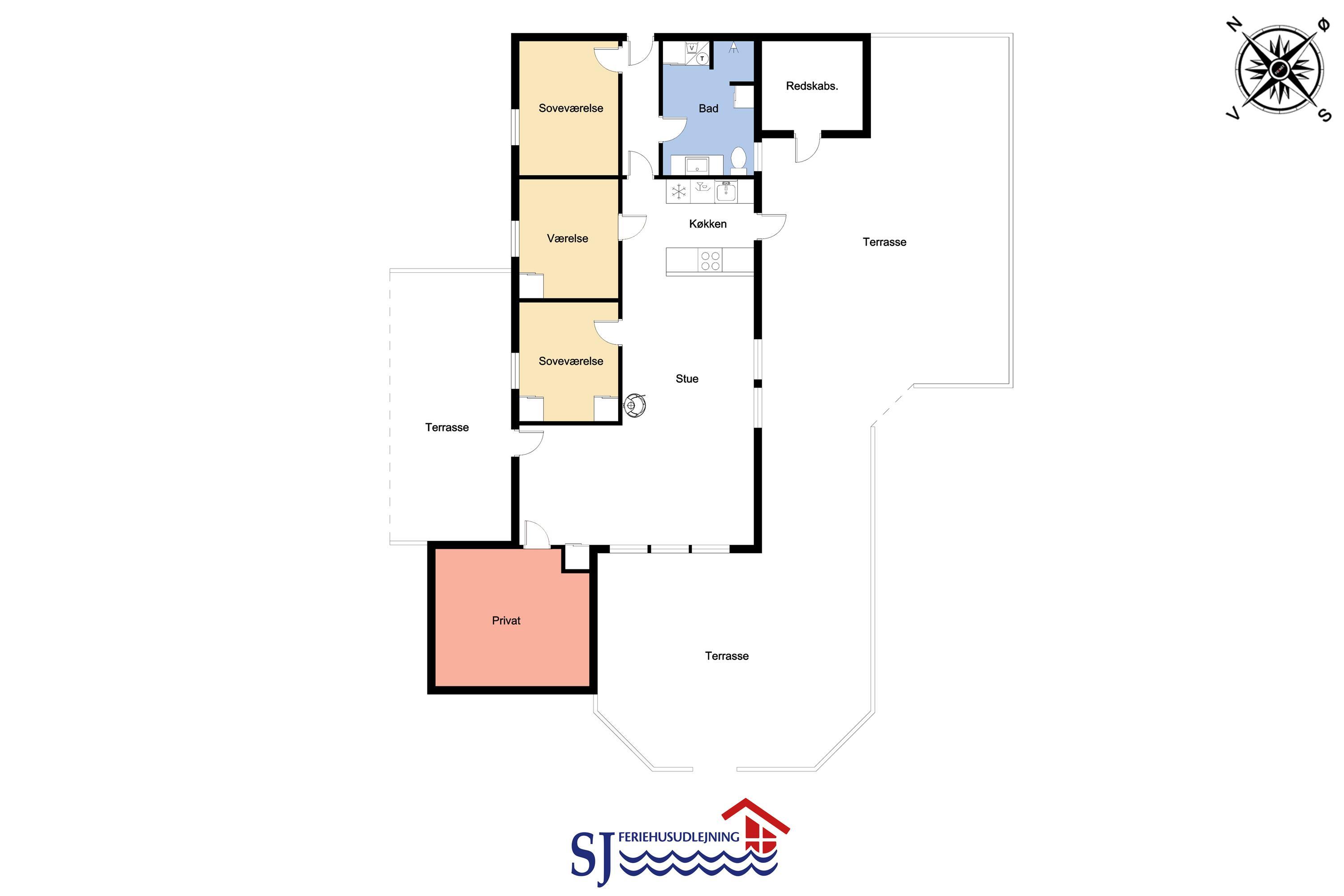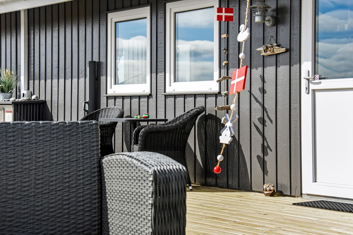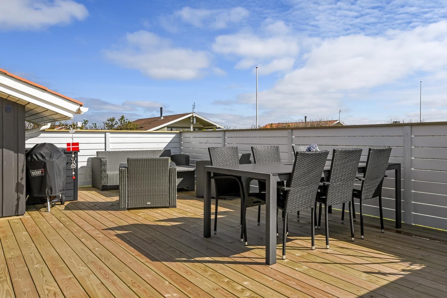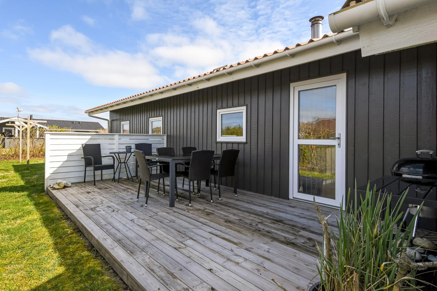 Feriehuset ligger på ca. 900 kvadratmeter åben naturgrund kun 350 m fra Vesterhavet. Huset har et åben og delvis overdækket terrasseanlæg hvor der både er grill, havemøbler og solvogne. I redskabsrummet er der ekstra afliggeplads. Huset direkte ved siden af en af områdets legepladser. Der er kun 150 meter til Vejlby Torv hvor der findes en købmand der har åbent fra påske til og med oktober. Går man videre herfra er man hurtigt oppe ved Vesterhavet, som kan passeres via en overgang for gangbesværede, som også er god hvis man skal have en trækvogn eller klapvogn med på stranden. Umiddelbart cirka 600 meter syd for huset ligger Ferring Sø, hvor man kan foretage mange vandreture. Det pefekte og særdeles samgfuldt indrettet til både par og den lille familie.
