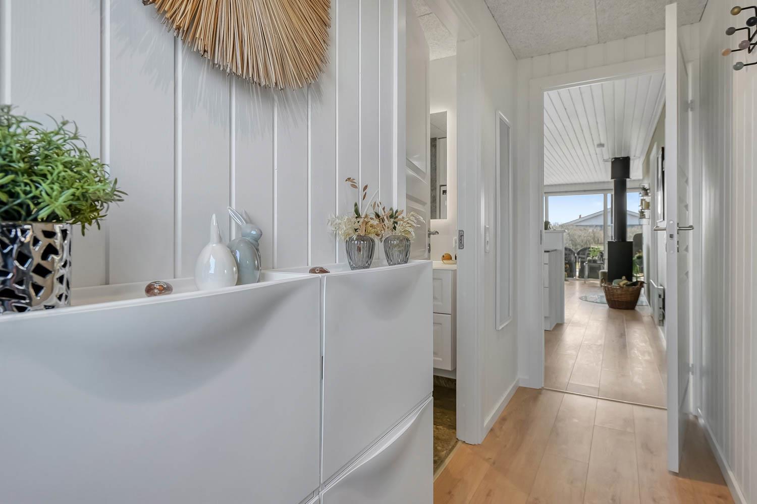 Nyrenoveret, smagfuldt og godt indrettet sommerhus i træ centralt beliggende i Vejlby Klit på rolig vej tæt på Vesterhavet og Ferrings Sø. Gratis trådløst internet - WIFI - i huset.