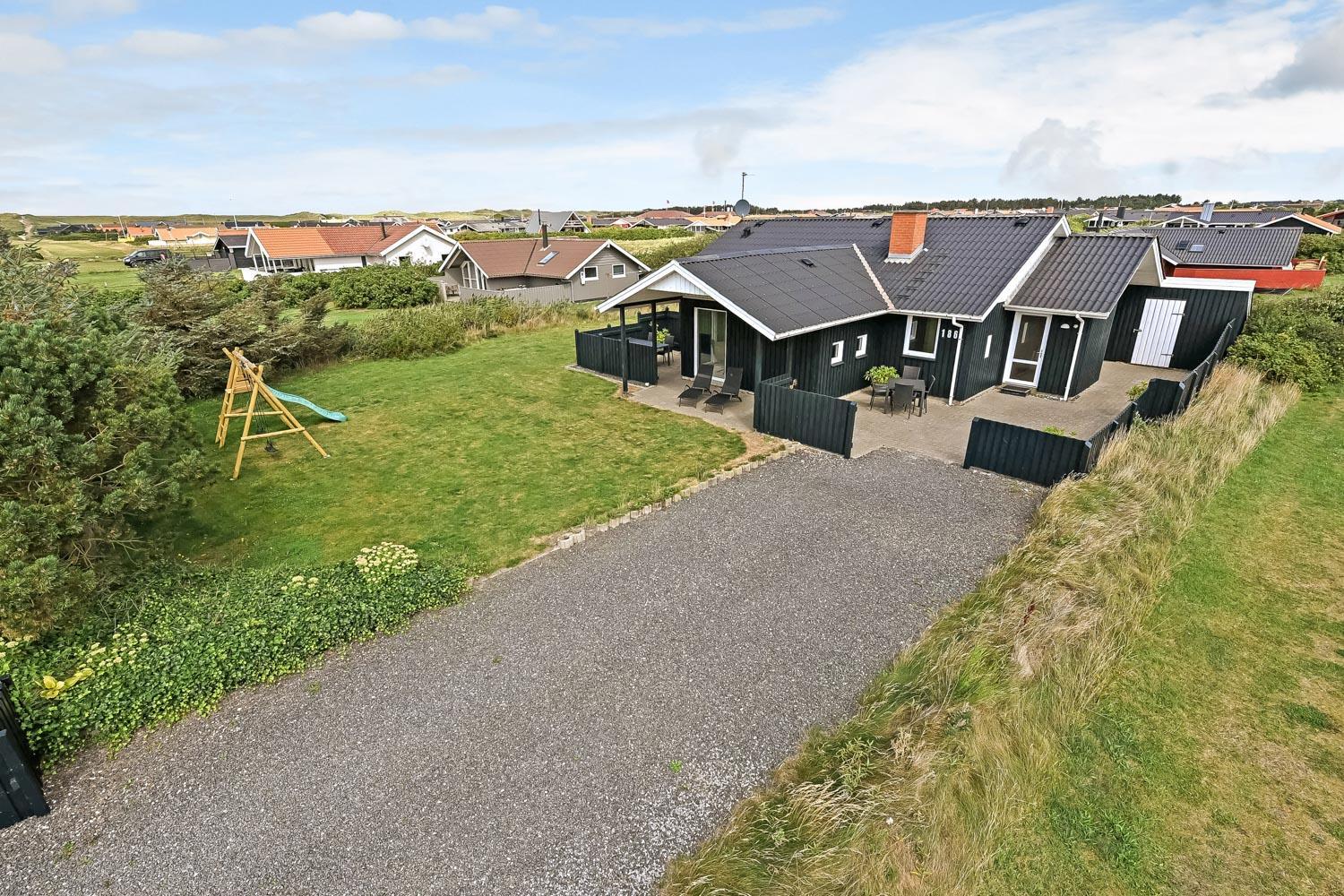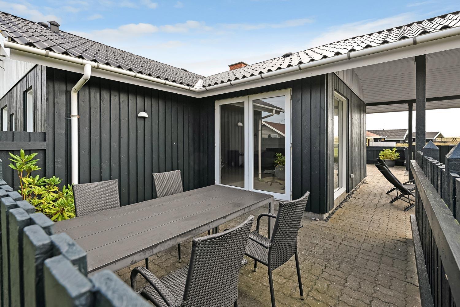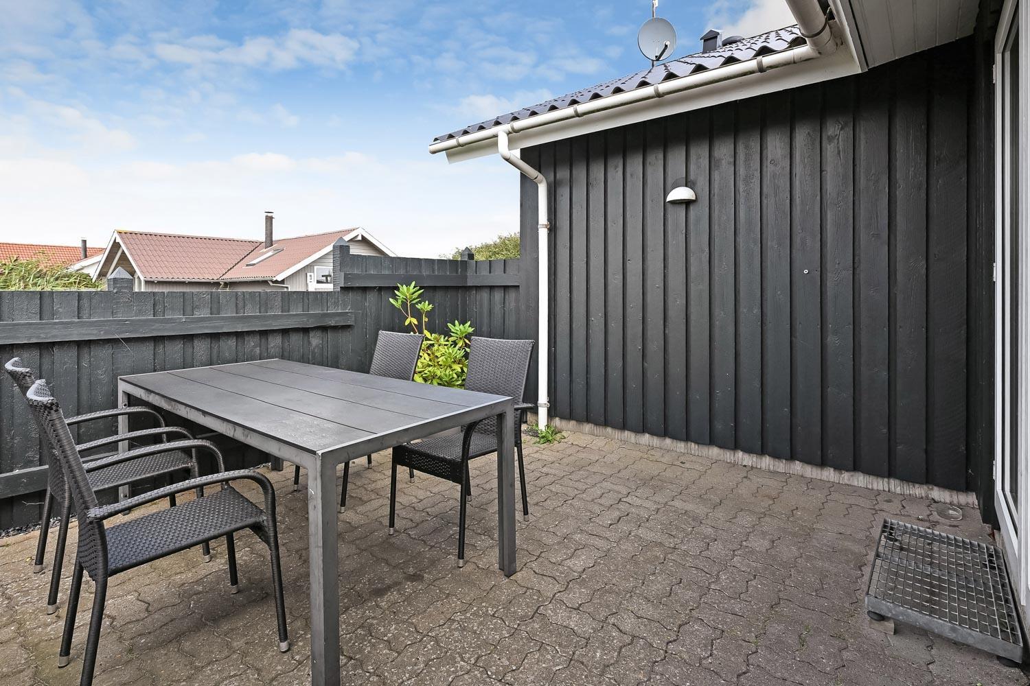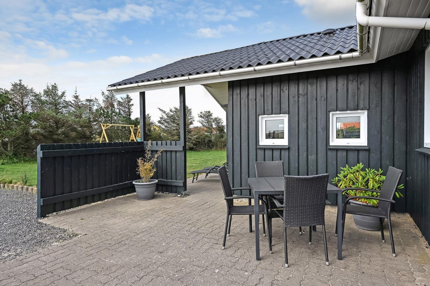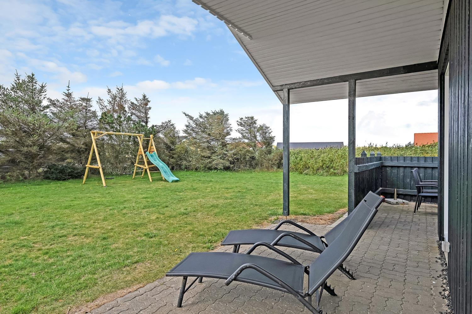 Den velholdte grund er ca. 900 m2 stor, så der er masser af mulighed for sjov og narrestreger. Der er flere dejlige terrasse. Fra Stuen er der udgang til en stor delvis overdækket terrasse med havemøbler, liggestole og grill. Fra køkkenet er der også udgang til en mindre, godt beskyttet terrasse med havemøbler. Der kan altid findes en plads i solen. Lille skur som er perfekt til opbevaring af diverse. Et utrolig dejligt hus, hvor der er tænkt på det meste og med masser af muligheder. 10 – 15 min fra huset ligger Vesterhavet, der altid invitere til en frisk gå- eller løbetur. Nyd også at områdets købmand ligger i gåafstand fra huset og som i sæsonen byder på frisk morgenbrød og her kan de daglige indkøb også klares. Også området madsted ligger tæt ved huset. Inden for 25-30 minutter kan flere aktiviteter og shoppingmuligheder nås. Så hvad enten I er til aktiv ferie eller total afslapning, danner dette rummelige feriehus en dejlig ramme både hvad angår hus, beliggenhed og omgivelser.