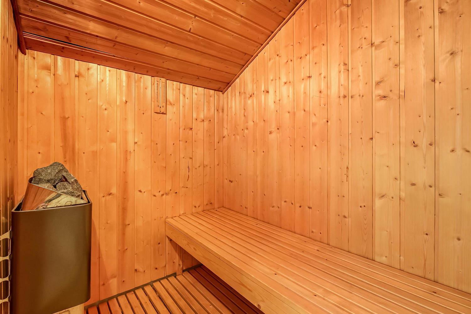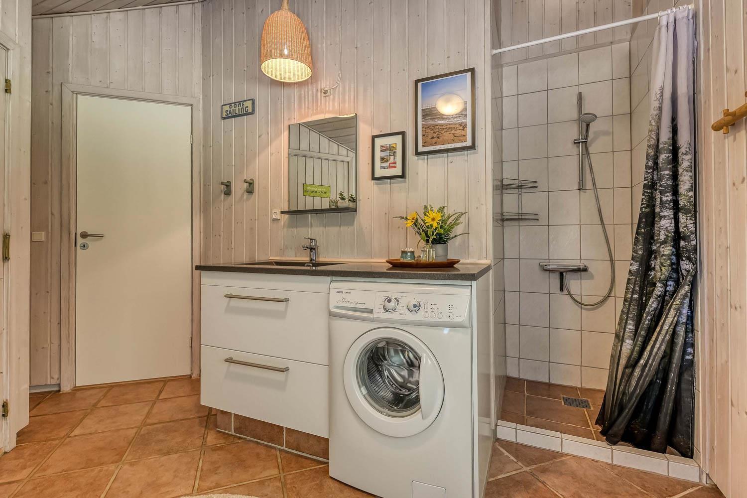 Der er to hyggelig indrettede badeværelser i huset. Det store er udstyret med toilet, bruser og gulvvarme, og direkte adgang til sauna. I hele huset er der praktiske og rengøringsvenlige gulve.