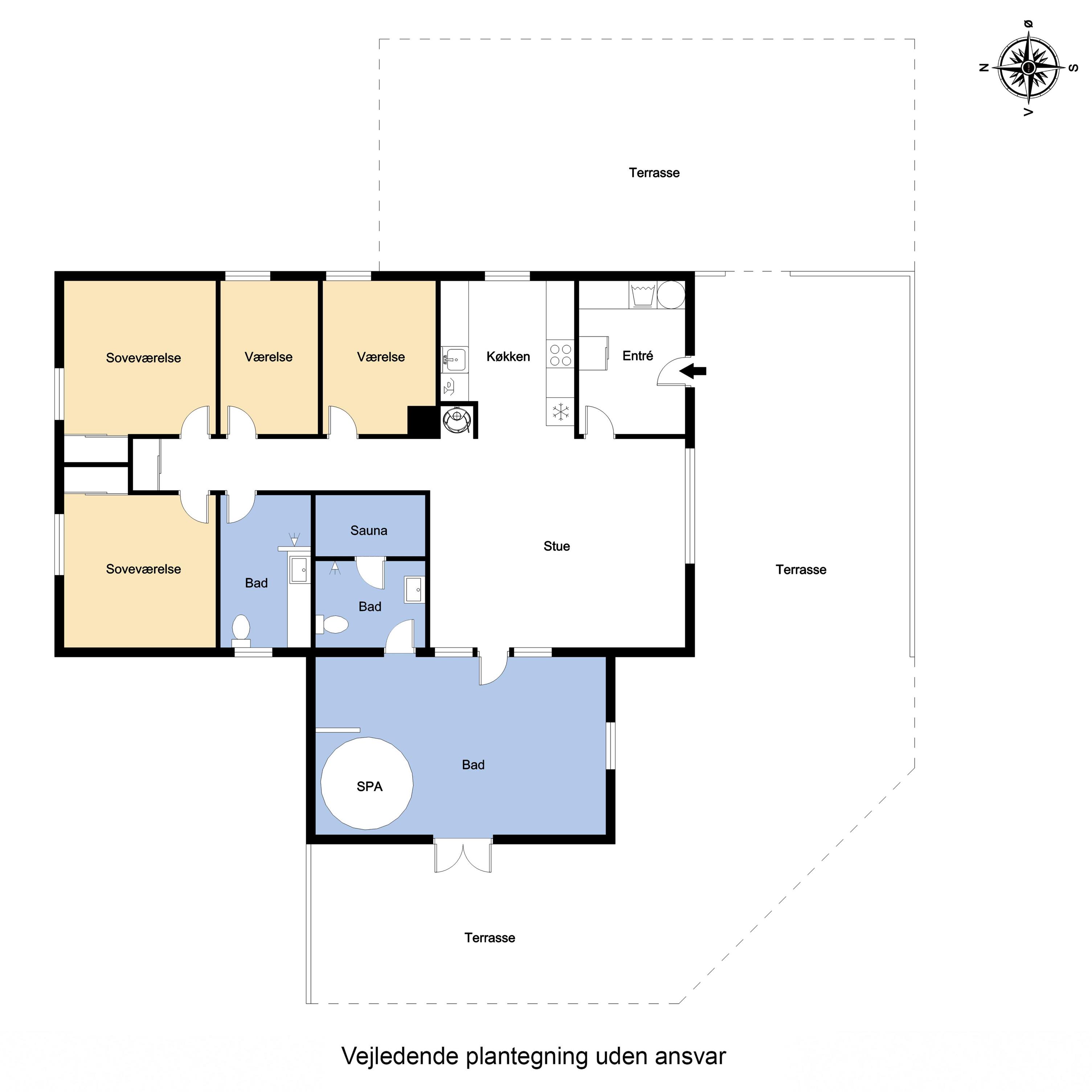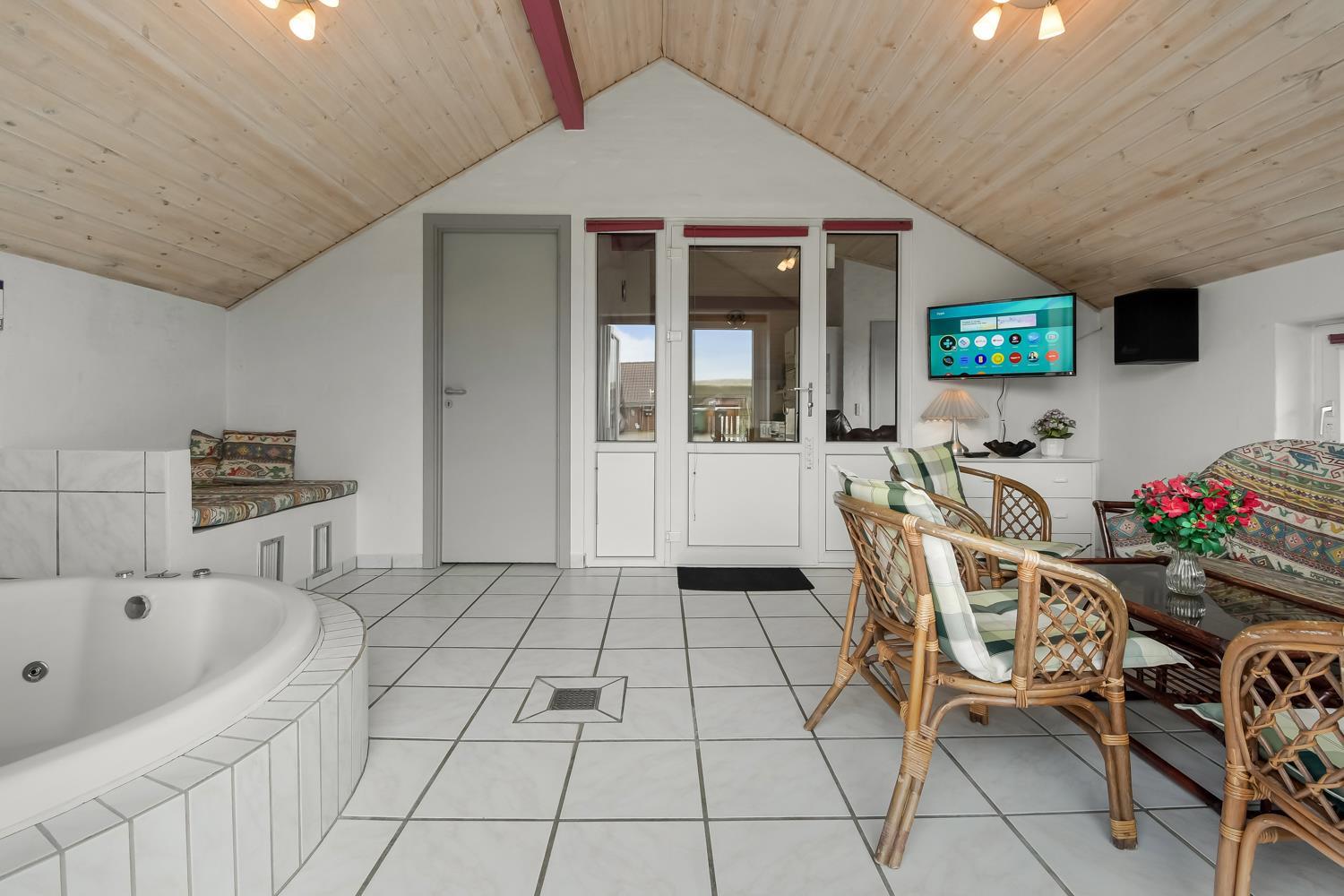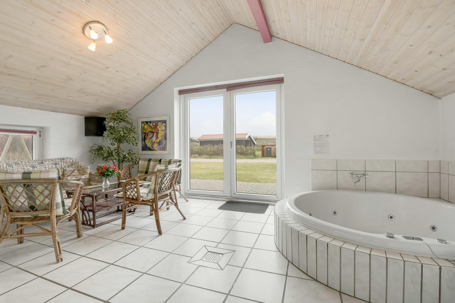 Et af husets højdepunkter er det store wellnessrum med en fire-personers whirlpool, en hyggelig krog med farve-tv og højttalere, samt direkte adgang til saunaen og det ene af husets to badeværelser – perfekt til afslapning efter en dag ved havet!
