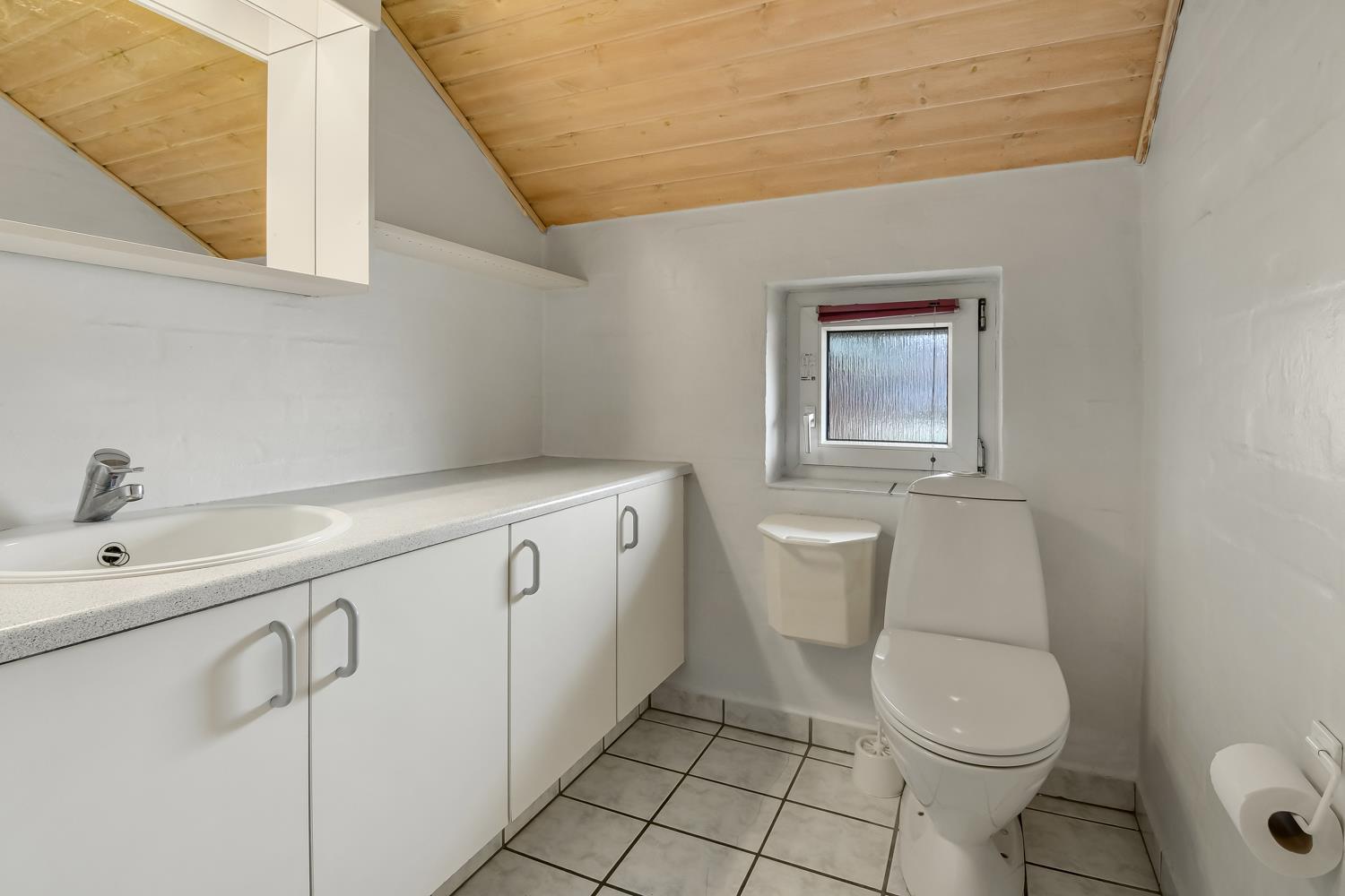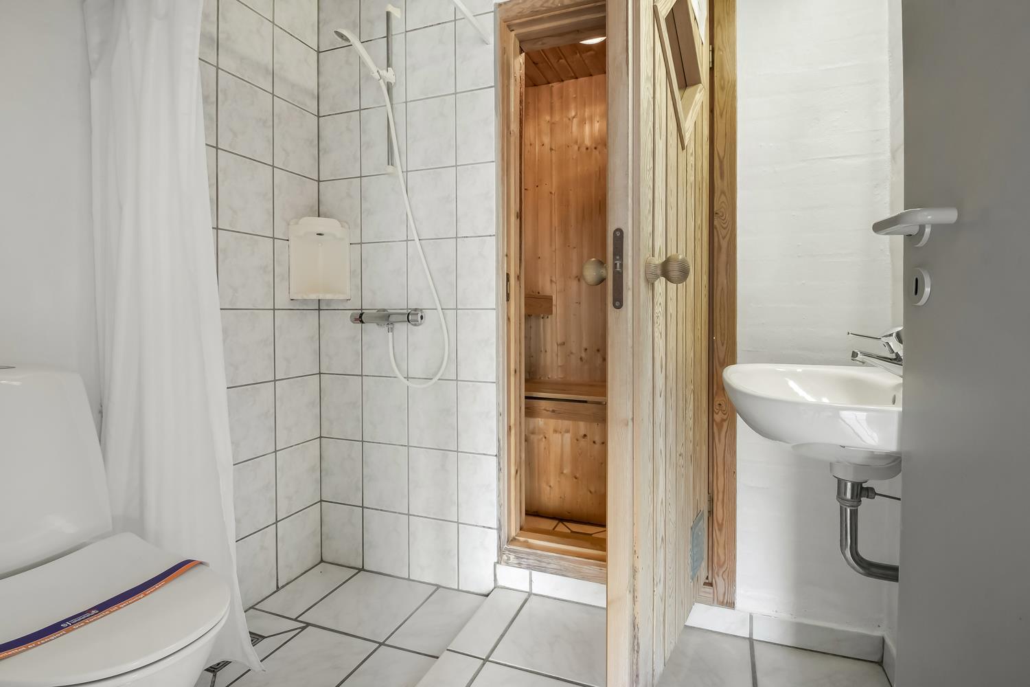 Huset har to badeværelser. Det store badeværelse er indrettet med toilet, håndvask, bruser, klinkegulv med gulvvarme og direkte adgang til saunaen. Det andet badeværelse har toilet, håndvask og bruser.