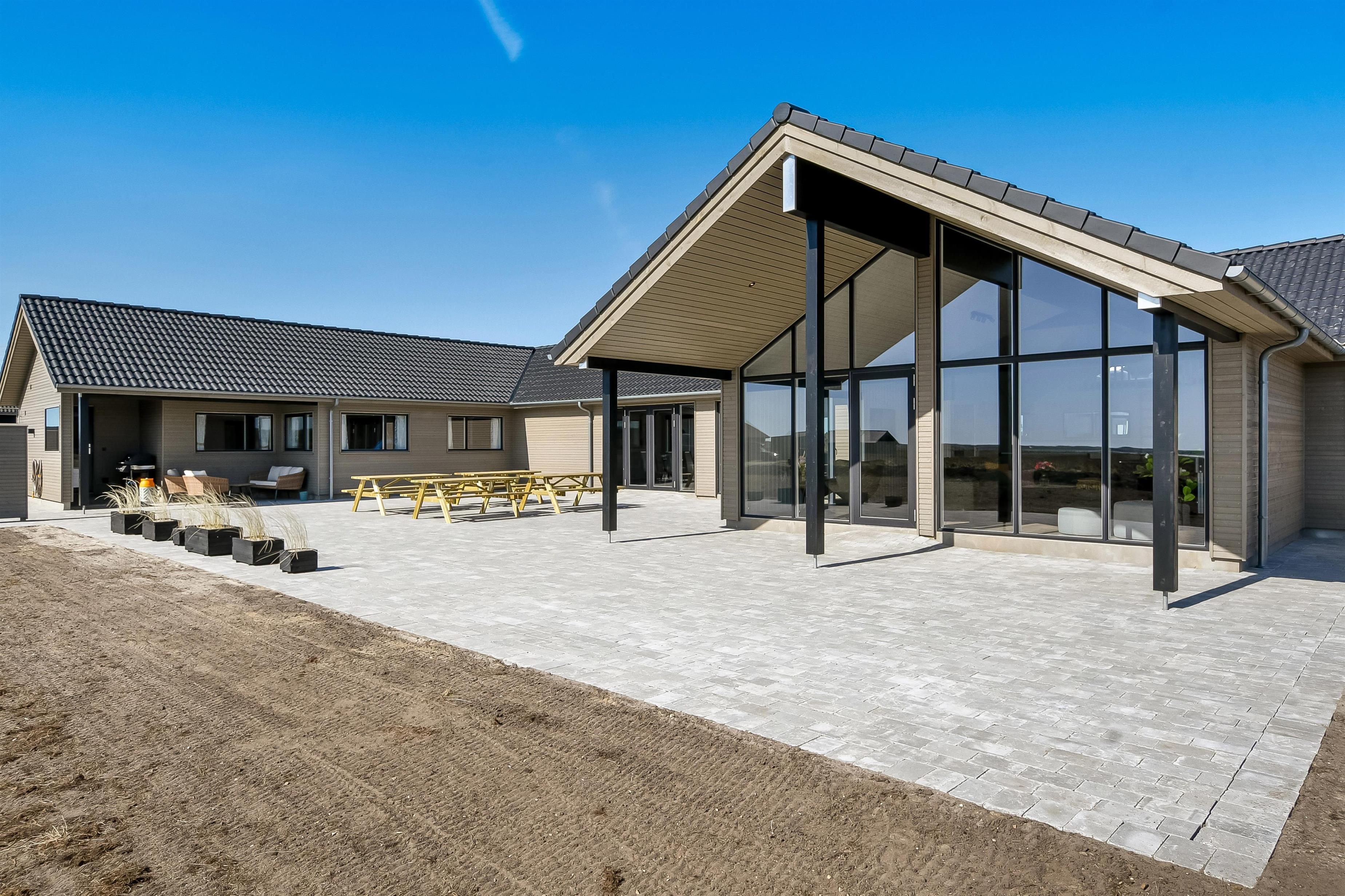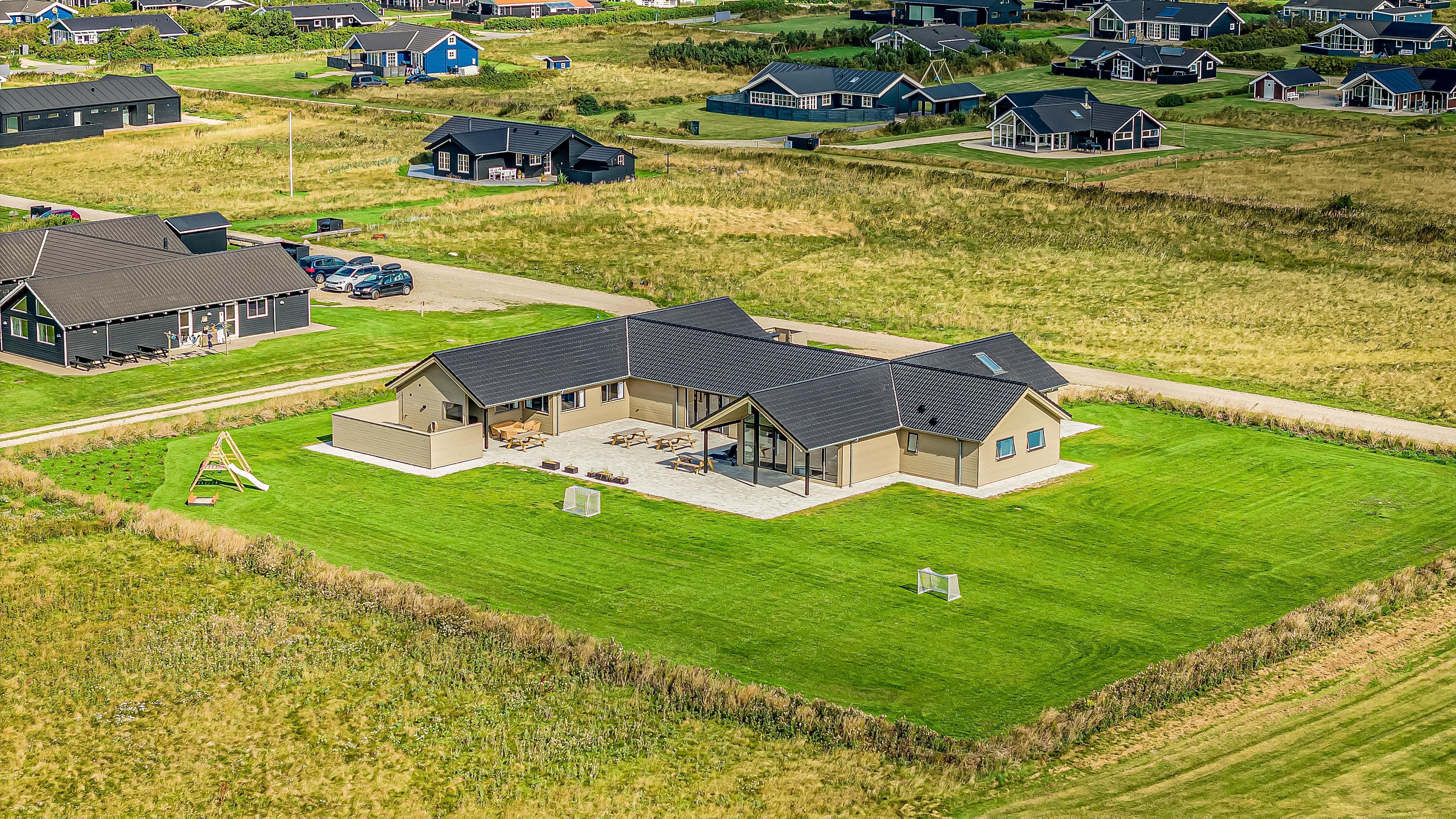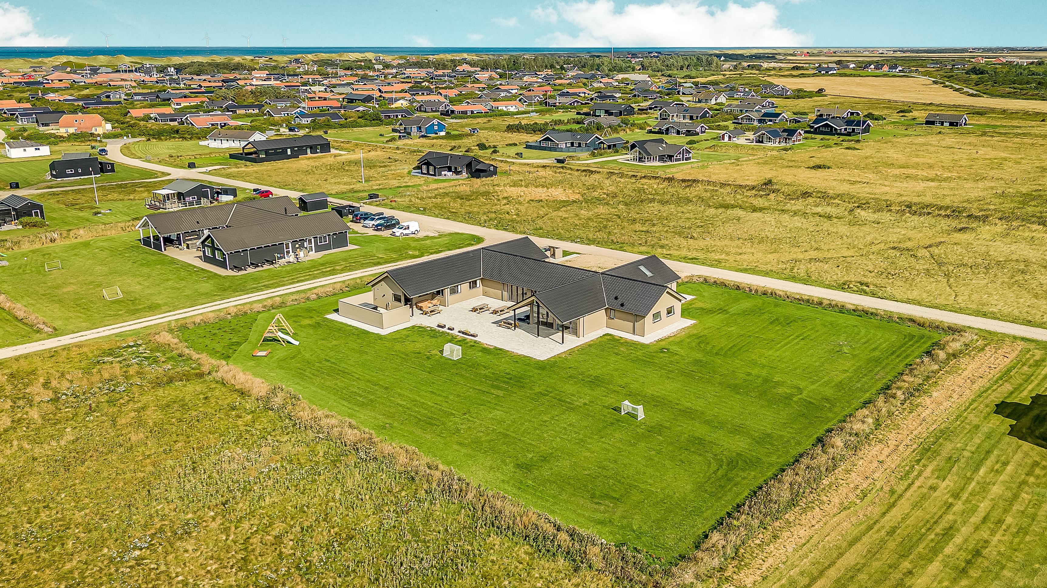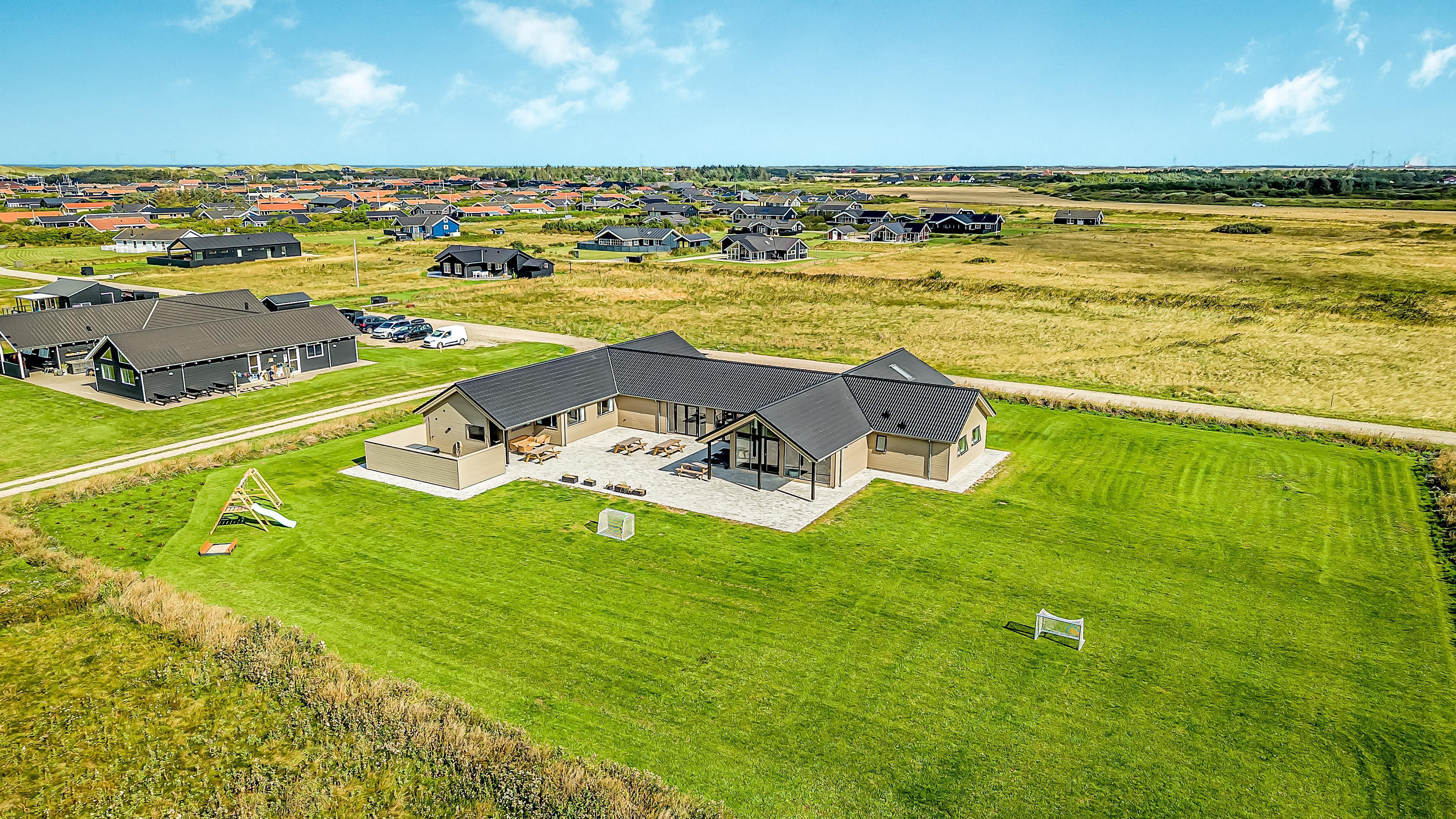 Der er masser af plads på den 3.555 m2 store grund og på det pragtfulde terrasseanlæg er der masser af muligheder for en plads i solen eller måske i skyggen, da anlægget bl.a. også indeholder et delvist overdækket areal. Der er tænkt på det meste. Stor gas grill, masser af havemøbler, loungesæt og liggestole. En frisk tur under den udendørs bruser og derefter en tur i den udendørs spa gør oplevelsen unik og specielt på de mørke aftener med den klare stjernehimmel. En unik oplevelse som er ren terapi for sjæl og krop efterfulgt af i den udendørs sauna. Så bliver det ikke meget bedre. Tag en tur til Vesterhavet, som hver dag fortæller en ny historie. Besøg de mange attraktioner og oplevelser, som nås indenfor max. 30 min. eller besøg fiskerbyen Thyborøn eller den dejlige handelsby Lemvig med masser af specialbutikker. I Sommermånederne kan de mest nødvendige indkøb klares hos købmanden i Vejlby Klit. Det perfekte rummelige hus til 26 personer beliggende i et unikt feriehusområde.