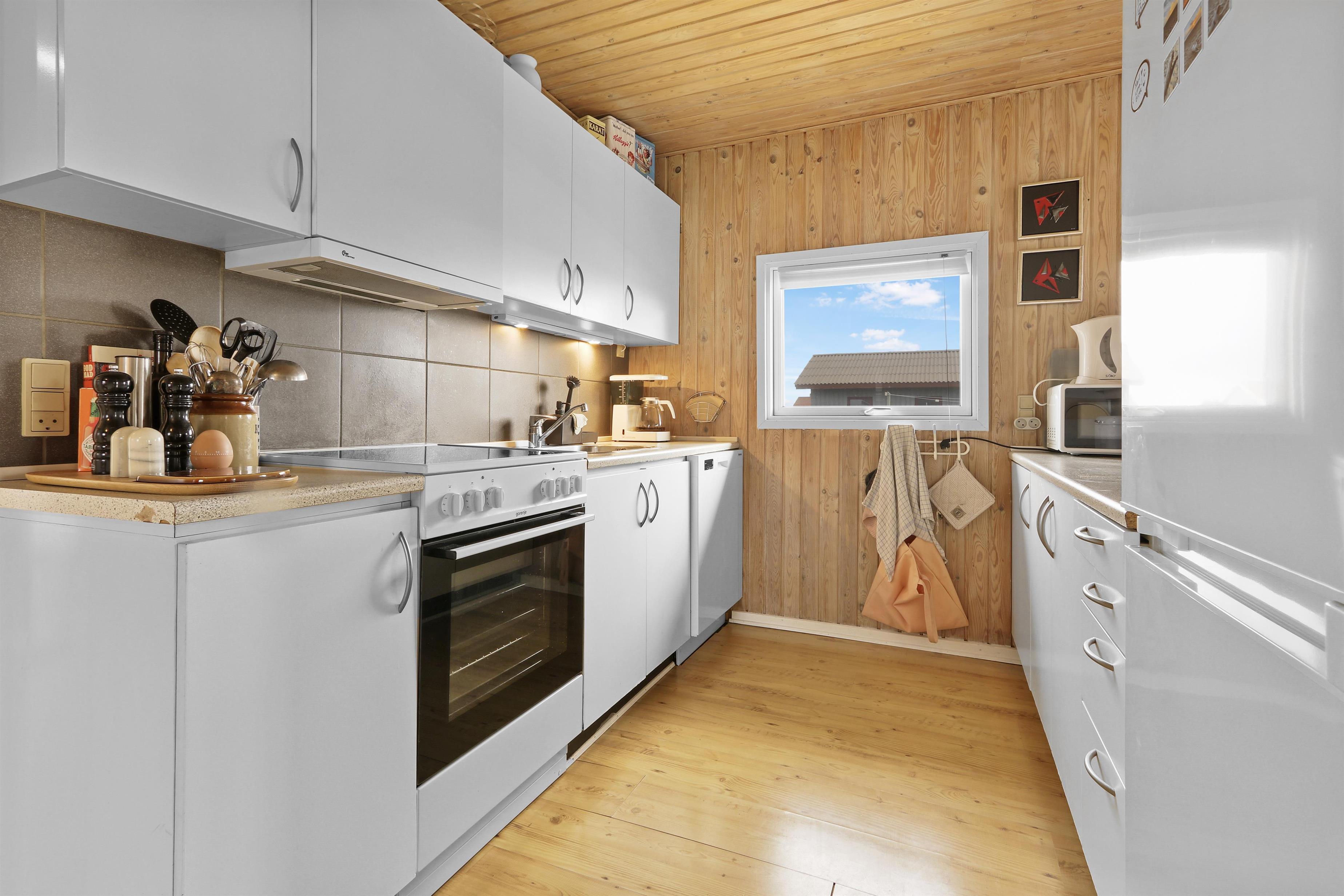 Huset har et godt indrettet køkken med opvaskemaskine, mikrobølgeovn, glaskeramisk komfur, køleskab og separat fryser på 30 liter. Stuen byder på stor sofagruppe med sofabord samt spisebord og stole. Her kan man hygge sig med brændeovnen tændt eller benytte fladskærmen med både DVD-afspiller, tyske og danske kanaler. Fra stuen er der adgang til sparummet. Sparummet er dejligt lyst hvor der er et vindue med mulighed for det naturlige lysindfald. Badeværelset har gulvvarme, bruser, toilet og håndvask. Huset har 4 soveværelser hvoraf 3 har dobbeltsenge og et enkelt har 2 enkeltsenge (de 2 enekltsenge har ikke fuld længde og er bedst til børn). Huset råder også over en varmepumpe, som gør huset mere miljøvenligt og billigere at varme op. Herudover er der også en vaskemaskine og tørretumbler i huset. Obligatorisk slutrengøring