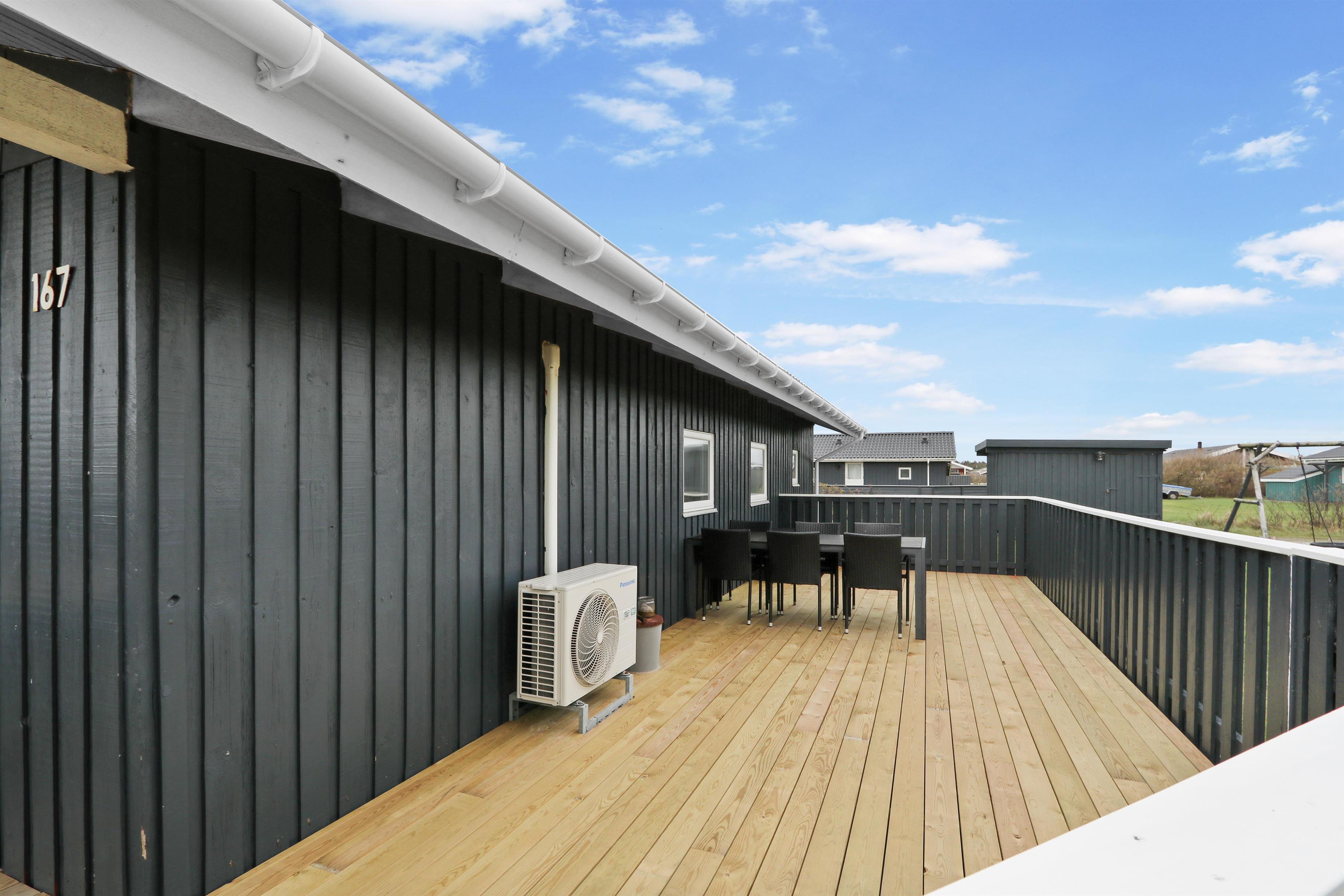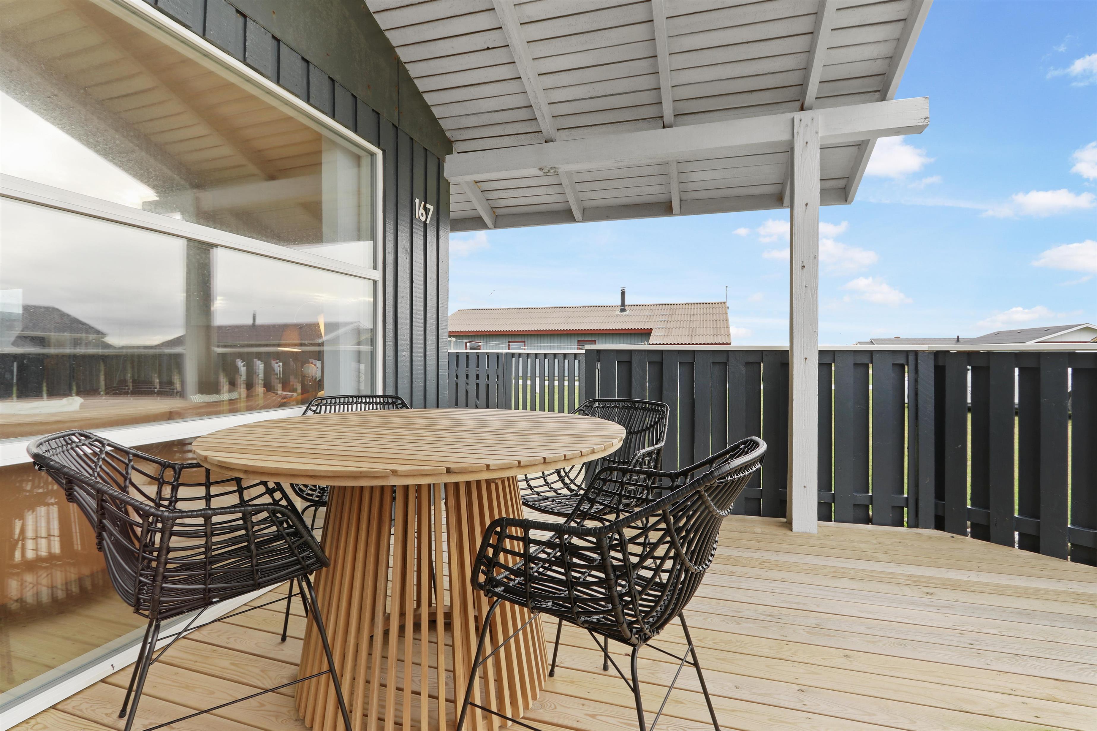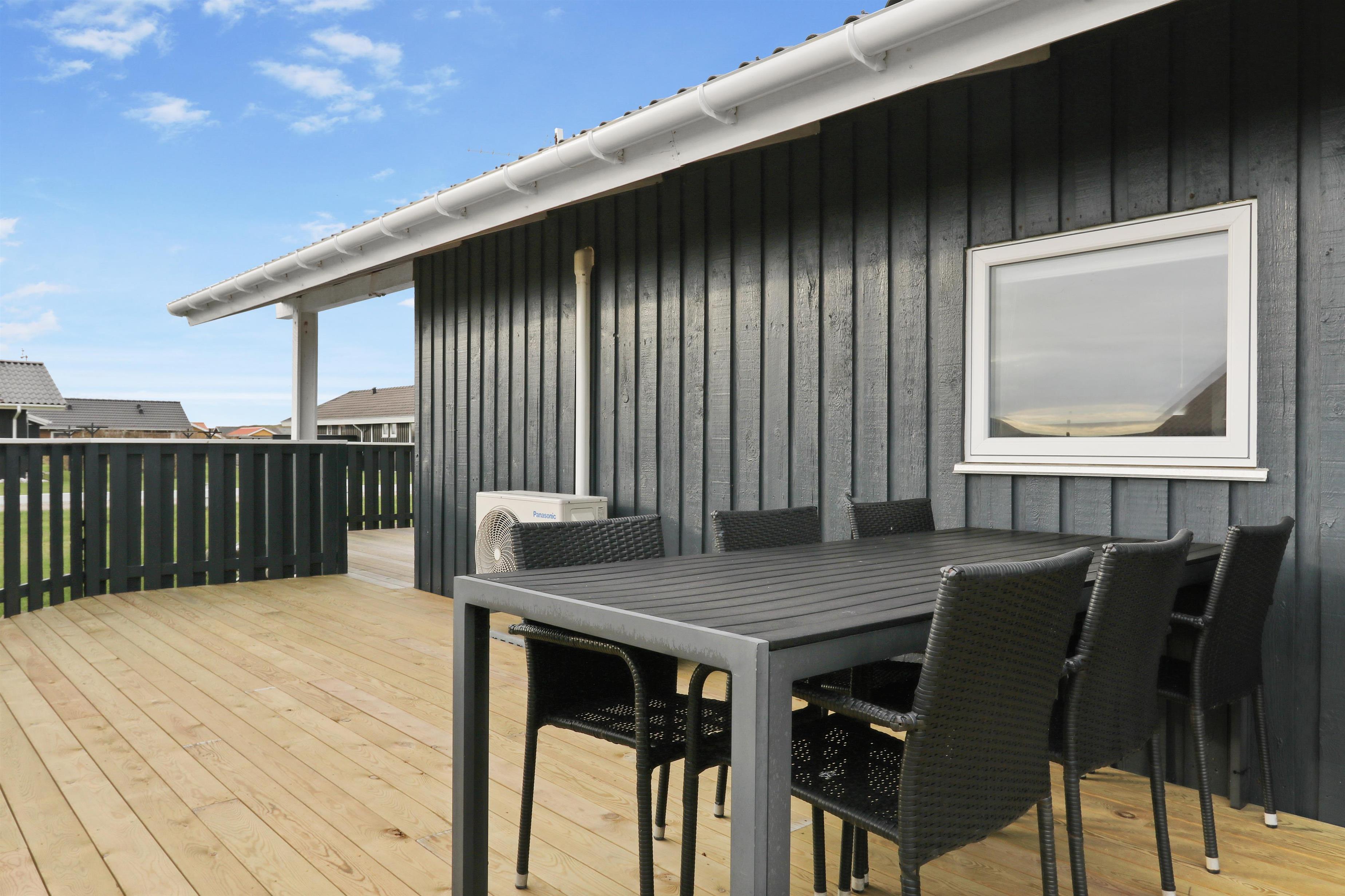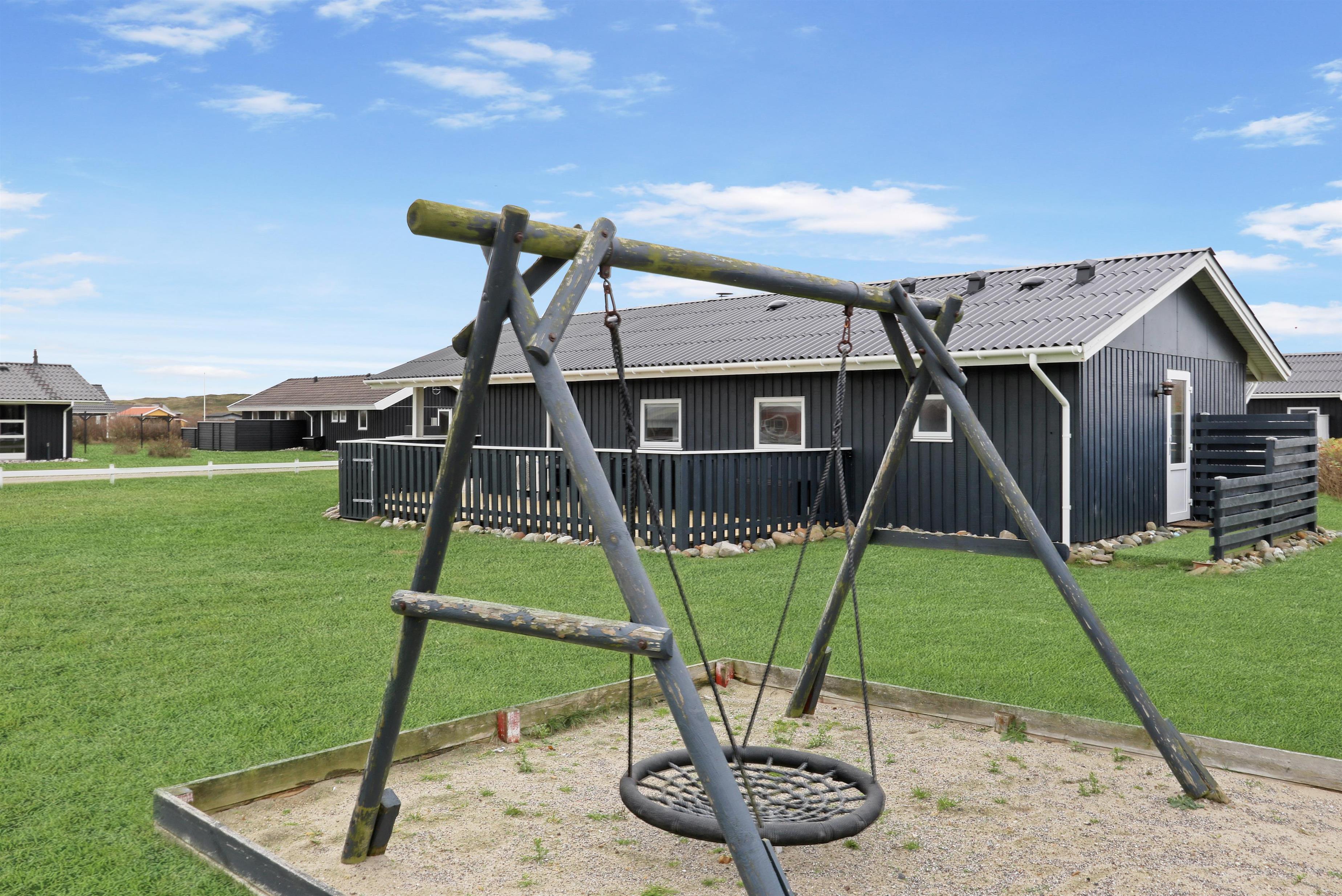 Fra stuen kan man gå direkte ud på den sydvendte træterrasse, som er delvis overdækket og beskyttet af indhegningen. Terrassen går også øst om huset, så der er flere muligheder for at finde gode steder til at benytte grillen eller havemøblerne, som hører til huset. I haven er der både gynger og sandkasse, som er skønt for de mindste. Der er kun 350 meter til Vesterhavet og her har man mange muligheder for afslappende aktiviteter: Her kan man bade, lede efter rav, flyve med drage, bygge sandslotte, vandre eller løbe en lang tur. Foretrækker man udsigt over lidt roligere vande så ligger Ferring Sø kun 350 meter væk. Området er ideelt til vandreture og een af favoritturene er vandringen til Bovbjerg Fyr og tilbage igen.