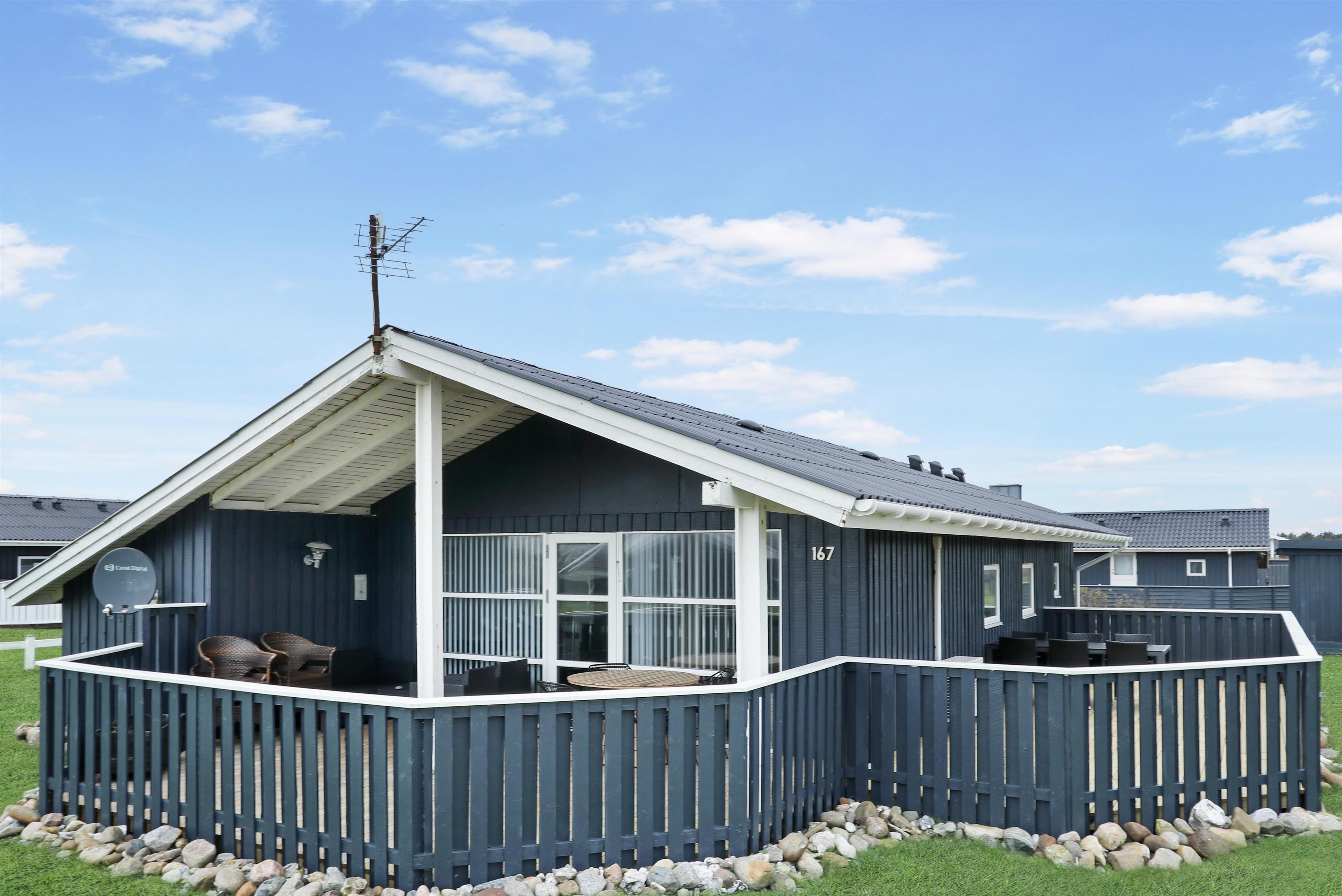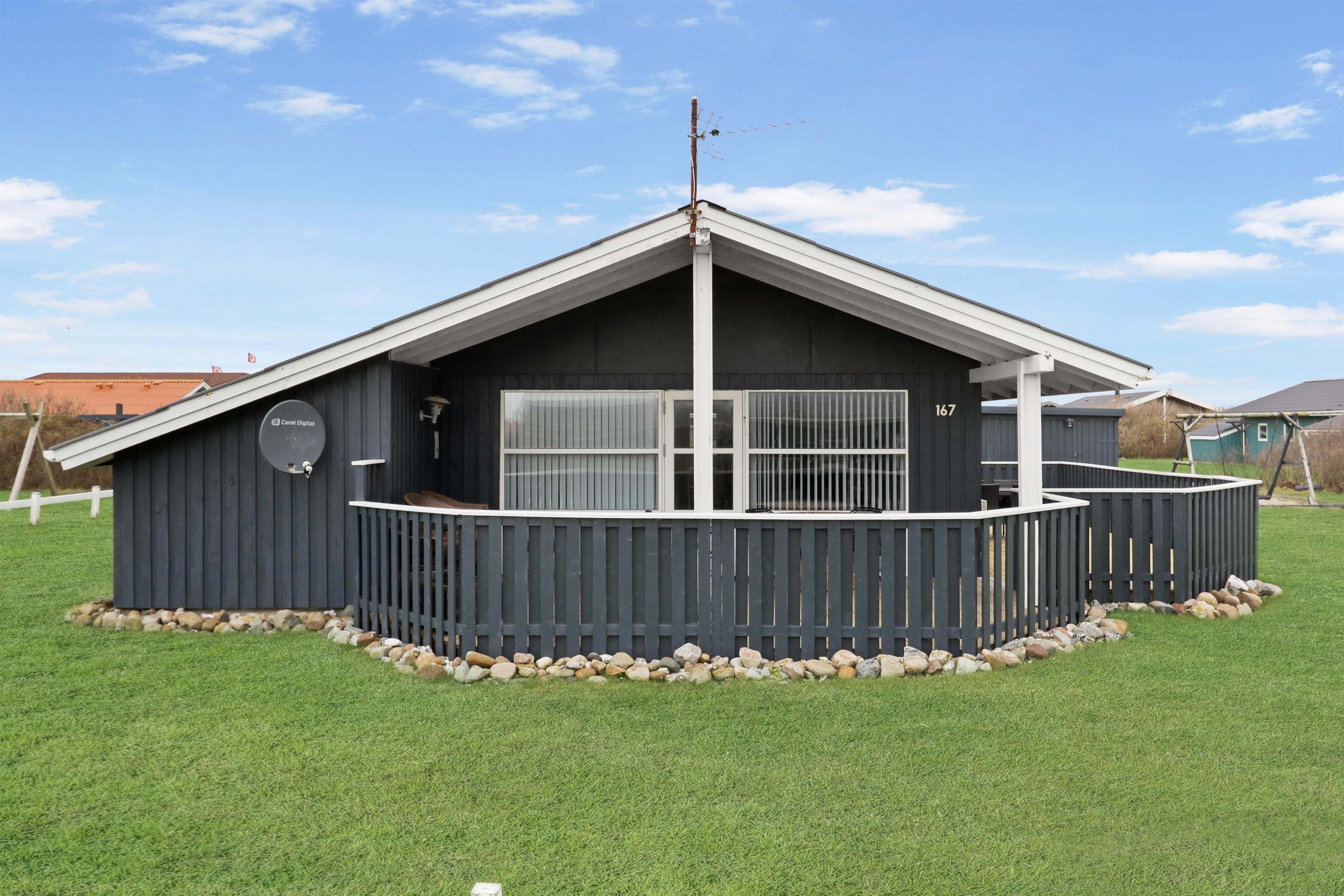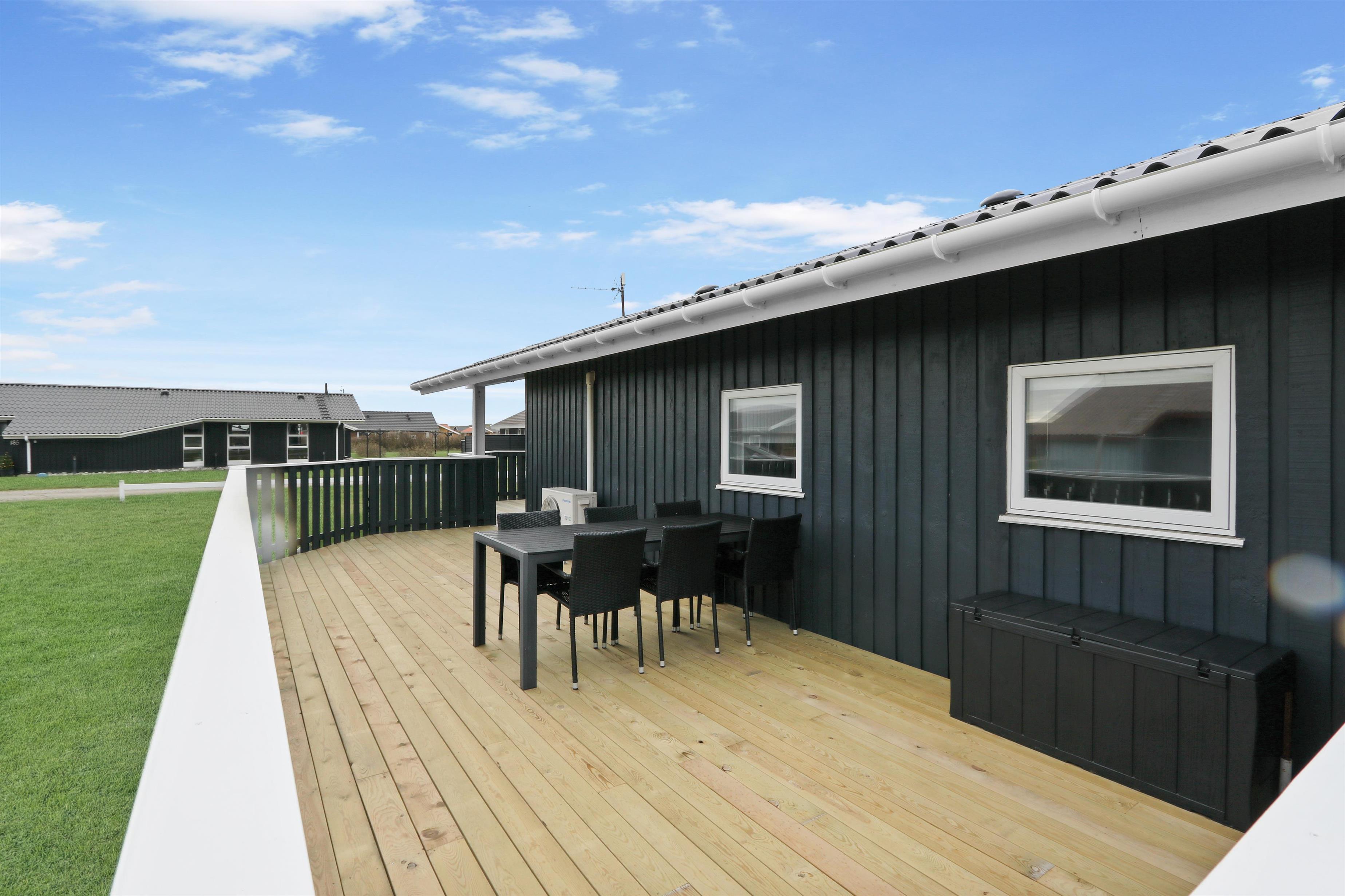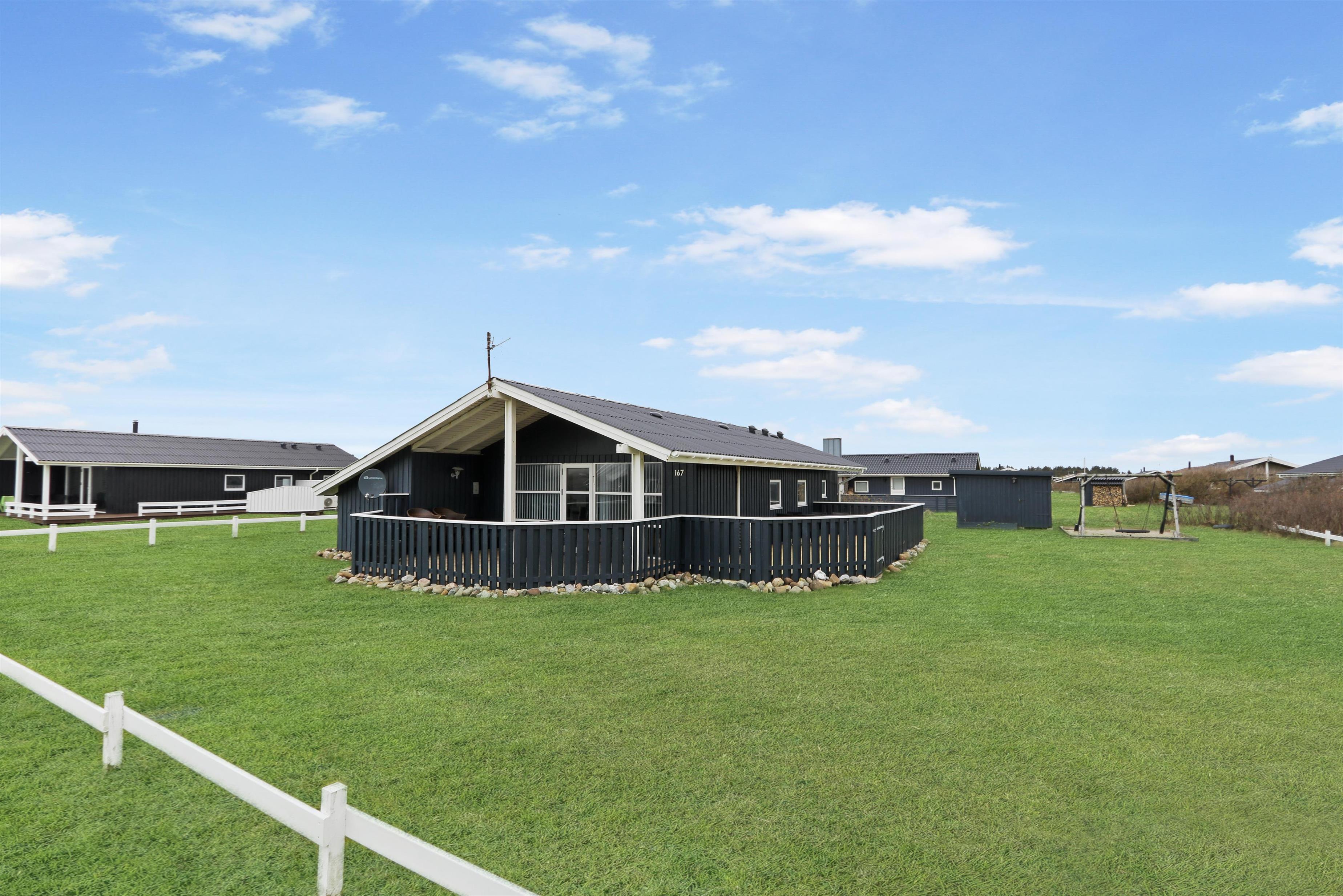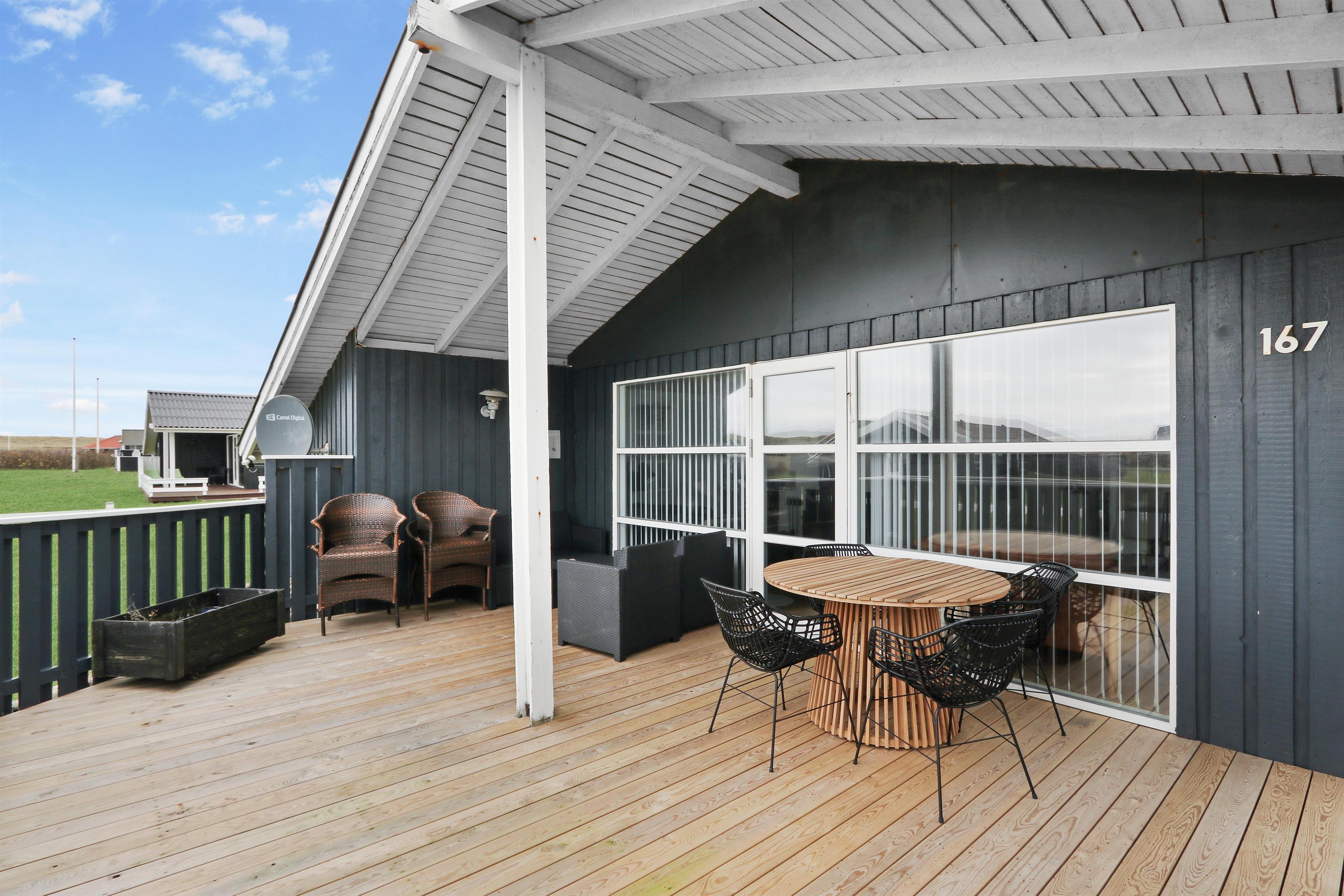 Fra stuen kan man gå direkte ud på den sydvendte træterrasse, som er delvis overdækket og beskyttet af indhegningen. Terrassen går også øst om huset, så der er flere muligheder for at finde gode steder til at benytte grillen eller havemøblerne, som hører til huset. I haven er der både gynger og sandkasse, som er skønt for de mindste. Der er kun 350 meter til Vesterhavet og her har man mange muligheder for afslappende aktiviteter: Her kan man bade, lede efter rav, flyve med drage, bygge sandslotte, vandre eller løbe en lang tur. Foretrækker man udsigt over lidt roligere vande så ligger Ferring Sø kun 350 meter væk. Området er ideelt til vandreture og een af favoritturene er vandringen til Bovbjerg Fyr og tilbage igen.