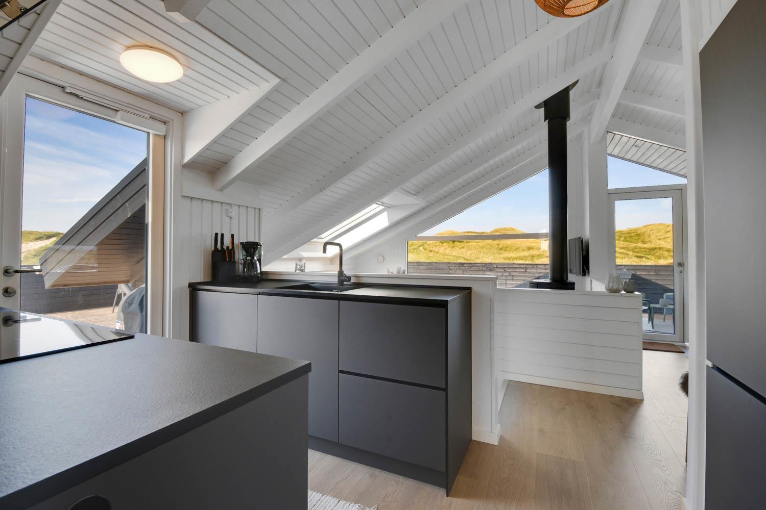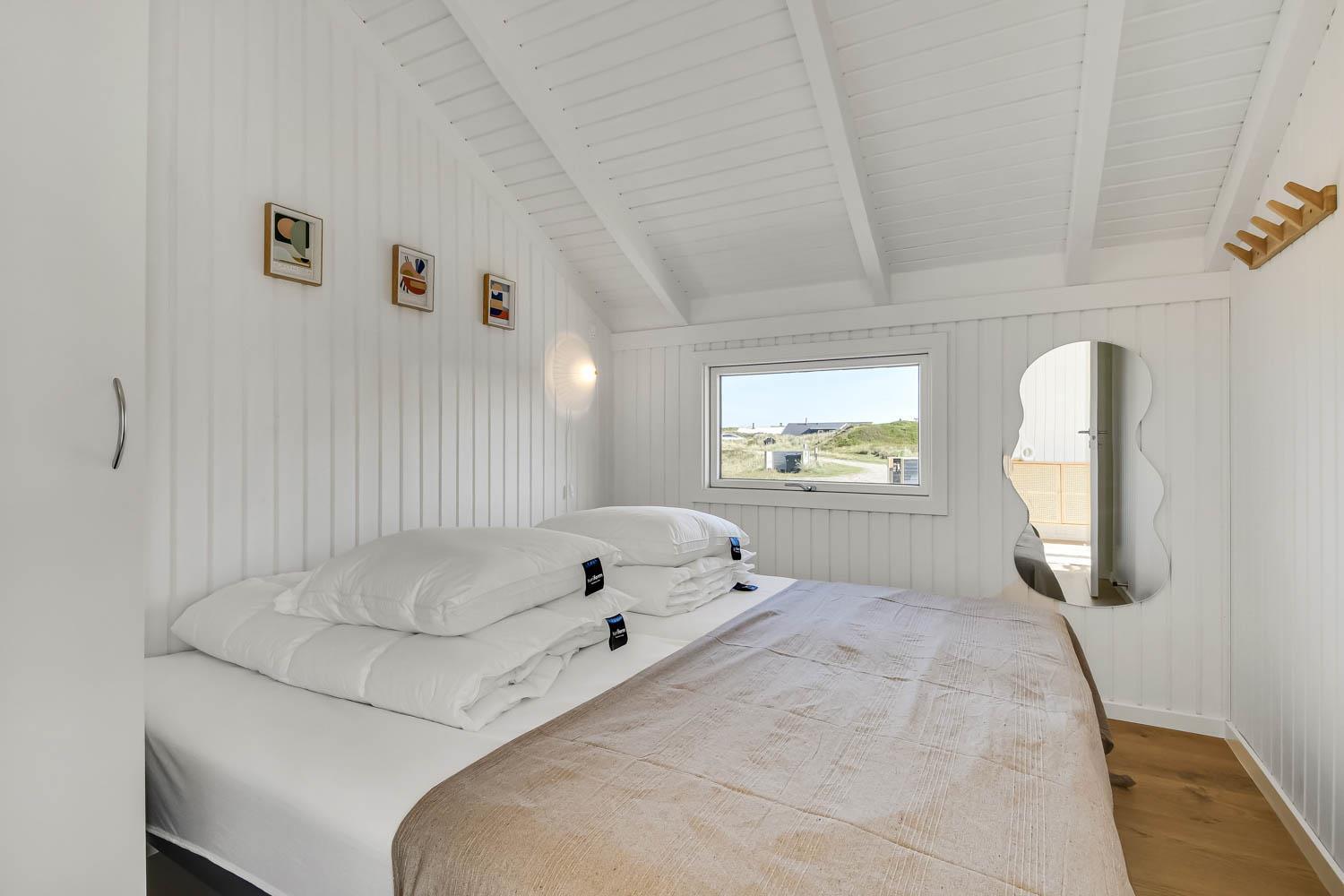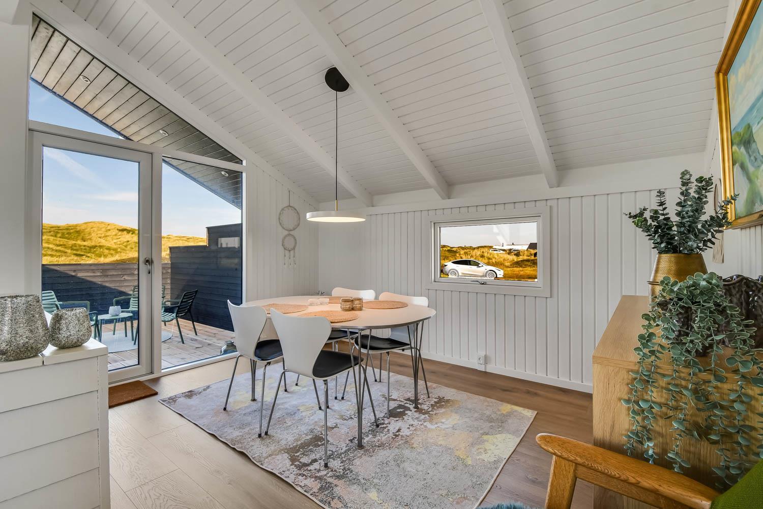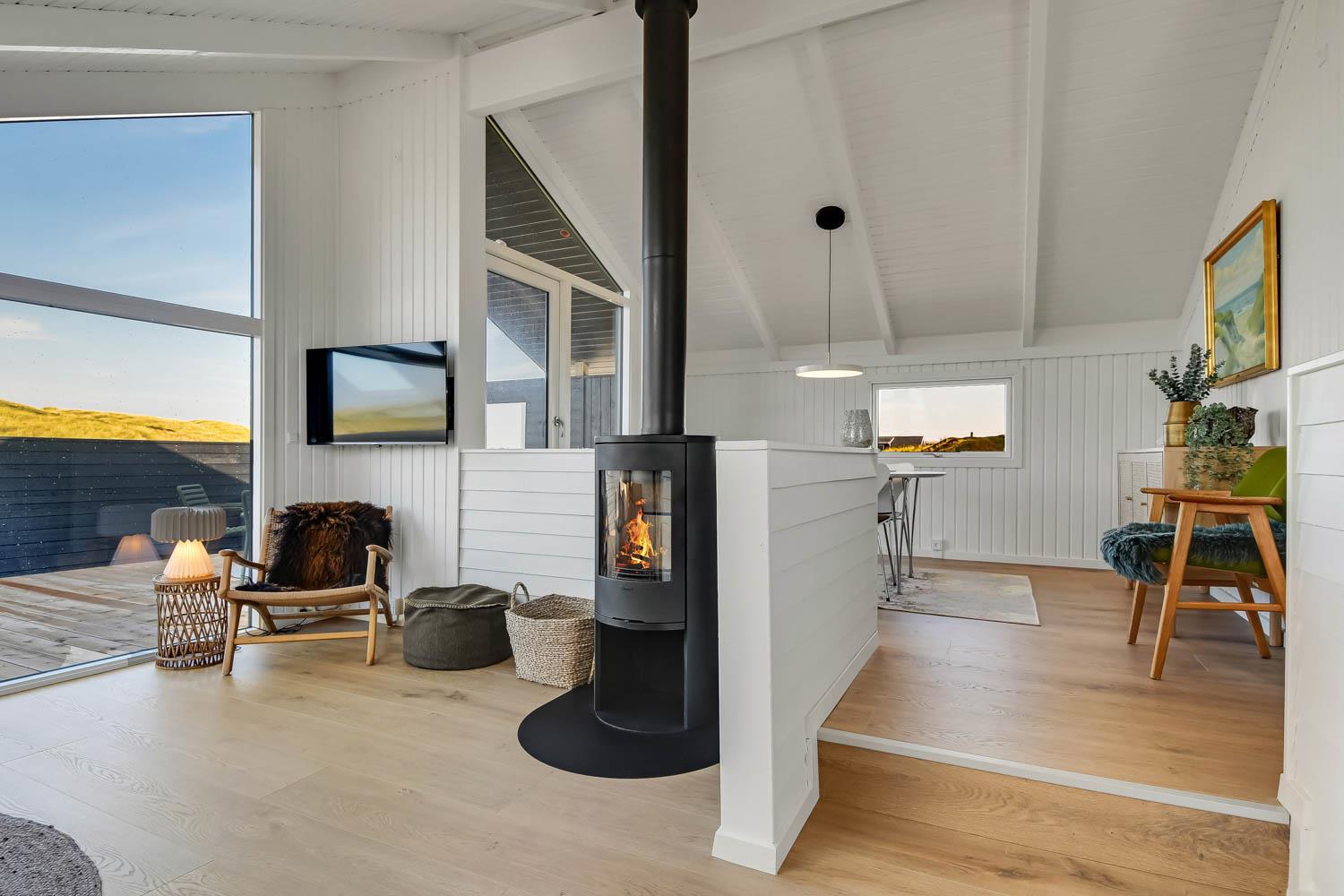 Allerede når bilen rammer grusvejen, med få meter til huset, bliver det klart at husets beliggenhed er noget ganske særligt. Huset er 106 m2 og har 4 dejlige soverum; 1DS + 1DS + 1DS + 2S. Helt nye og gode senge. I hjertet af huset findes et stort veludstyret køkken/alrum med alt i service/køkkengrej og alt i hårde hvidevarer. Det åbne køkken er bl.a med glaskeramisk komfur, emhætte, køle-/fryseskab, mikroovn og opvaskemaskine. Der er linoleumsgulv og udgang til terrassen i køkkenafdelingen. Nyd og bliv betaget af at kigge ud af vinduerne og nyd udsigten til klitterne ved Vesterhavet. Slap af i de flotte lædermøbler. Se TV på husets smart-TV som har indbygget danske og tyske TV-programmer, radio og mulighed for streaming tjenester via Chromecast, brændeovn og varmepumpe som begge sørger for en behagelig varme også i den kolde tid og samtidig er medvirkende til en reduceret forbrugsafregning. Der er linoleumsgulve i hele huset, som også er særdeles rengøringsvenlige. Der er udgang til det unikke terrasse anlæg, hvor der er udendørs vildmarksspa. 2 badeværelser begge med toilet, håndvask, bruser, gulvvarme og klinkegulv. Vaskemaskine er der naturligvis også i huset. Huset lejes ikke ud til ungdomsgrupper og der må max bo 6 personer i huset. Ikke rygerhus. Husdyr ikke tilladt. Obligatorisk slutrengøring