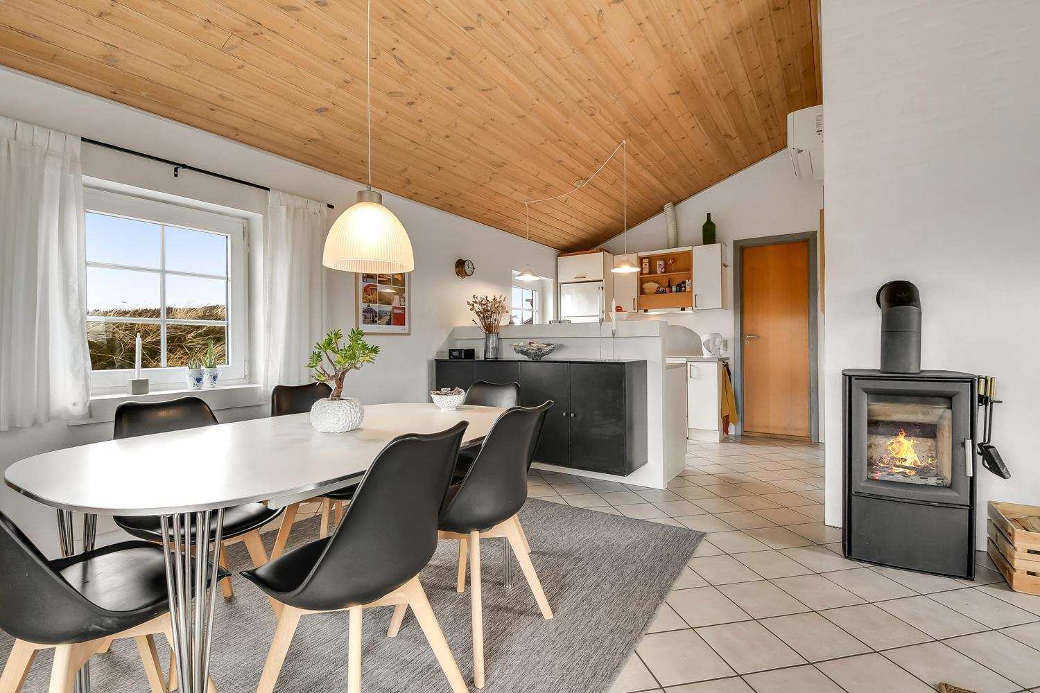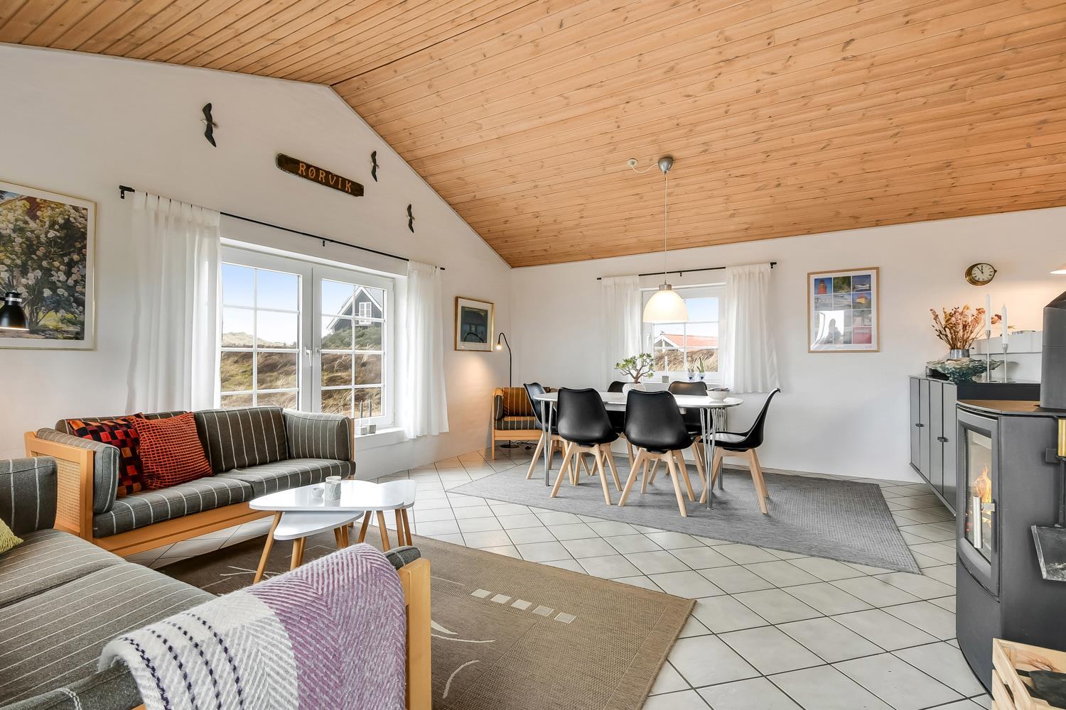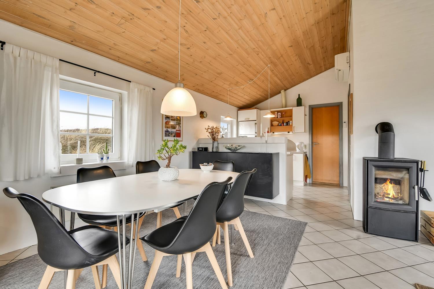 Dette smagfuldt indrettede feriehus i 2 etager er beliggende ideelt ved yderste klitrække blot 150 m fra Vesterhavet. Huset er meget smagfuldt indrettet og fremstår lyst og venligt. Hyggeligt indrettet stue som er kombineret med et velindrettet køkken som er indrettet med elkomfur, køleskab med frostboks, mikroovn og opvaskemaskine. Stuen er godt indrettet med dejlige møbler, spisebord, F-TV med parabol samt med mulighed for streaming af egne programmer, PlayStation 3 med spil og en dejlig brændeovn som giver en behagelig varme også på de kolde årstider. 3 soverum med DS + DS + 4K. Flot badeværelse med toilet, håndvask, bruser, spa, vaskemaskine, tørretumbler og adgang til sauna, flisegulv med gulvvarme. I entreen er der trappe til 1. sal hvor der findes en lille hyggelig stue med ekstra TV og trægulve, herfra er der en fantastisk udsigt over området og de høje klitter ved Vesterhavet fra den lille altan. Husdyr tilladt. Ikke rygerhus.