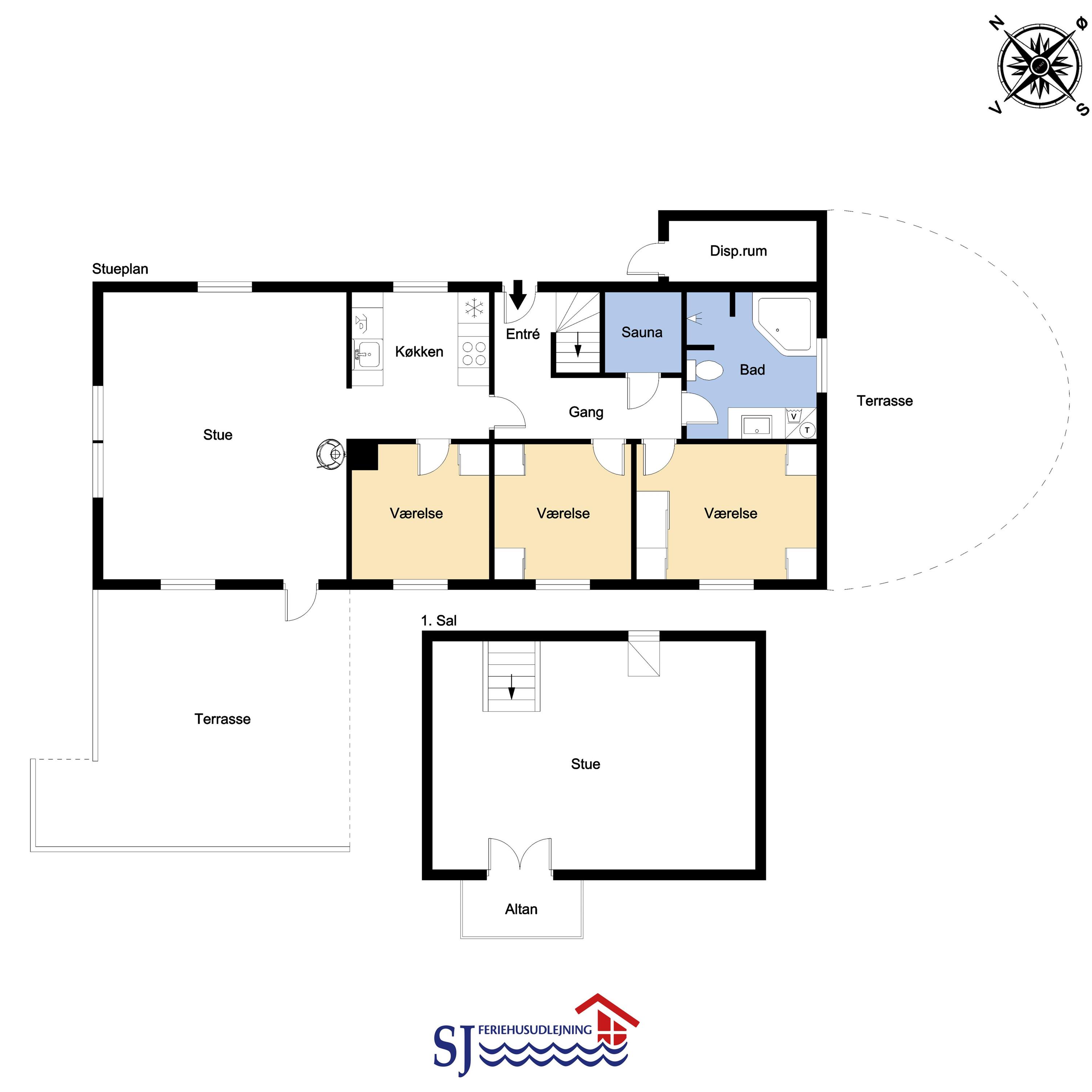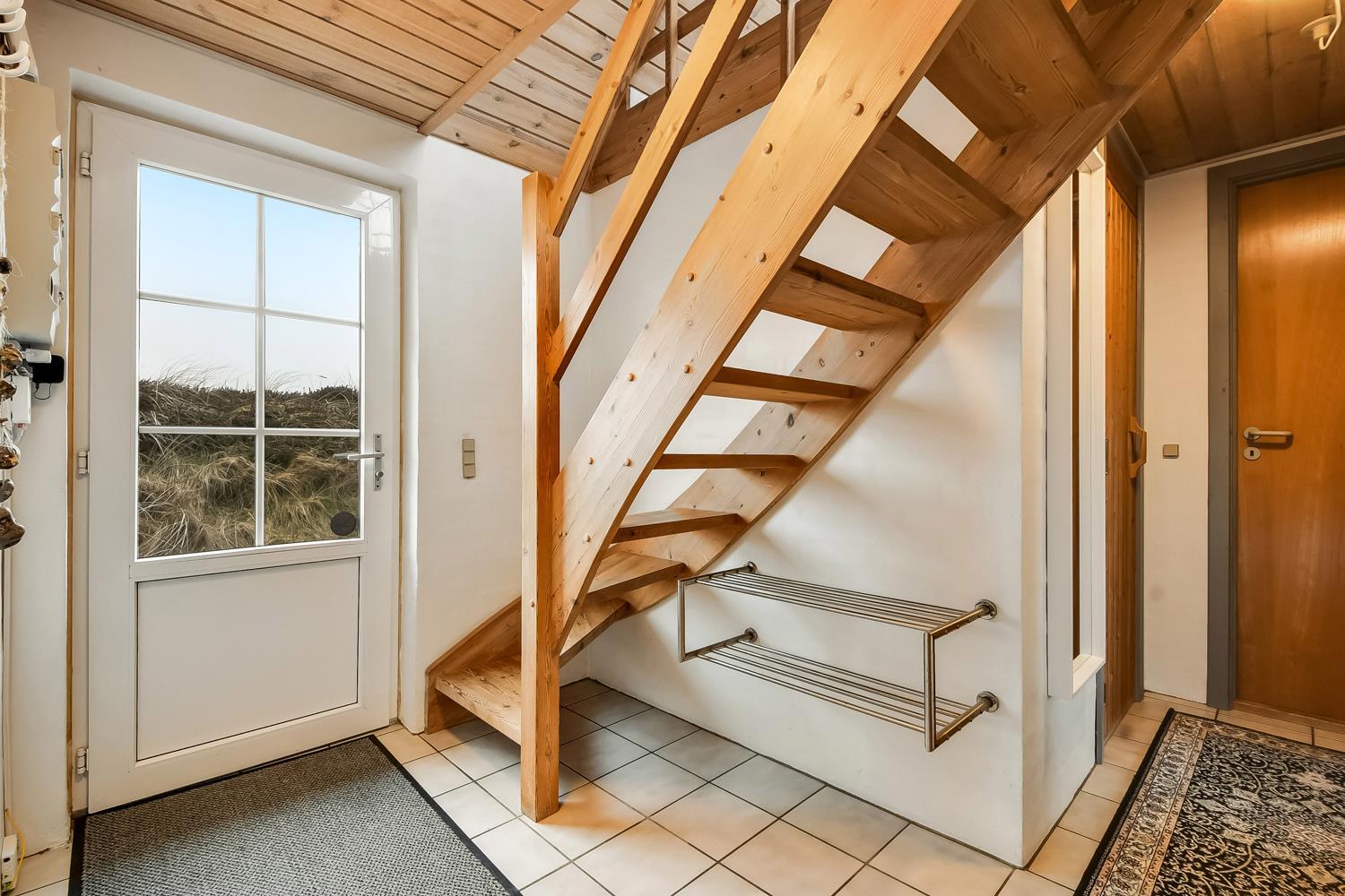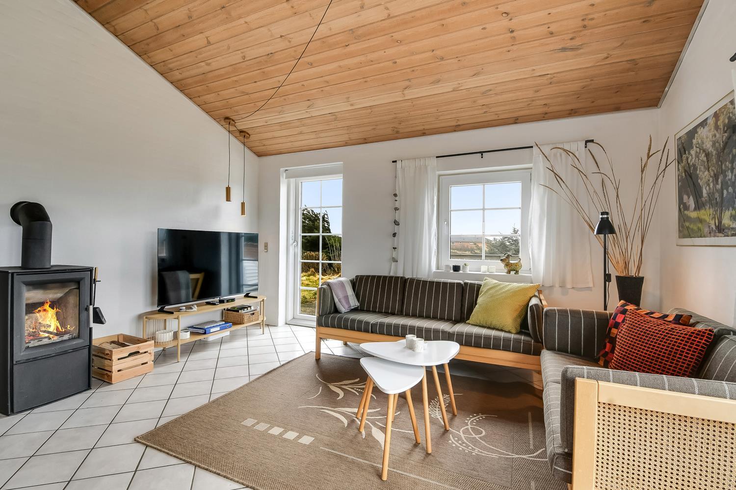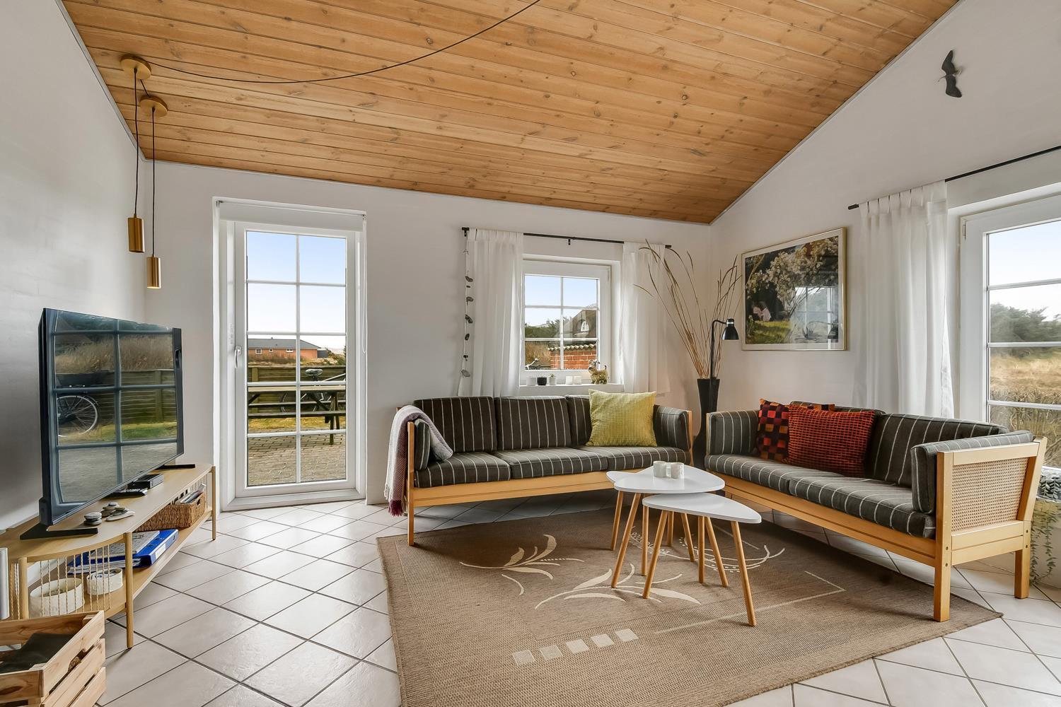 Dette smagfuldt indrettede feriehus i 2 etager er beliggende ideelt ved yderste klitrække blot 150 m fra Vesterhavet. Huset er meget smagfuldt indrettet og fremstår lyst og venligt. Hyggeligt indrettet stue som er kombineret med et velindrettet køkken som er indrettet med elkomfur, køleskab med frostboks, mikroovn og opvaskemaskine. Stuen er godt indrettet med dejlige møbler, spisebord, F-TV med parabol samt med mulighed for streaming af egne programmer, PlayStation 3 med spil og en dejlig brændeovn som giver en behagelig varme også på de kolde årstider. 3 soverum med DS + DS + 4K. Flot badeværelse med toilet, håndvask, bruser, spa, vaskemaskine, tørretumbler og adgang til sauna, flisegulv med gulvvarme. I entreen er der trappe til 1. sal hvor der findes en lille hyggelig stue med ekstra TV og trægulve, herfra er der en fantastisk udsigt over området og de høje klitter ved Vesterhavet fra den lille altan. Husdyr tilladt. Ikke rygerhus.