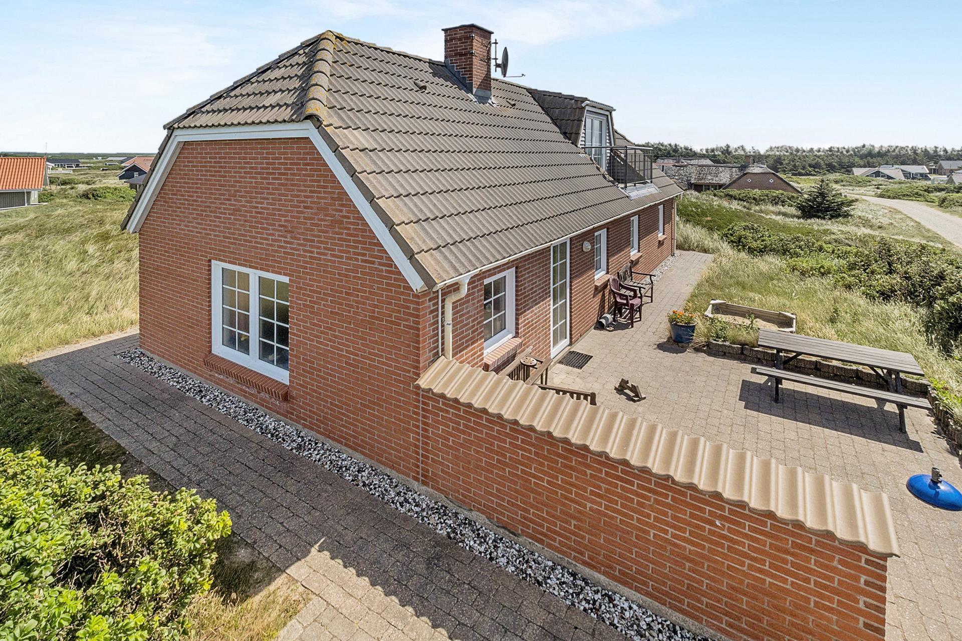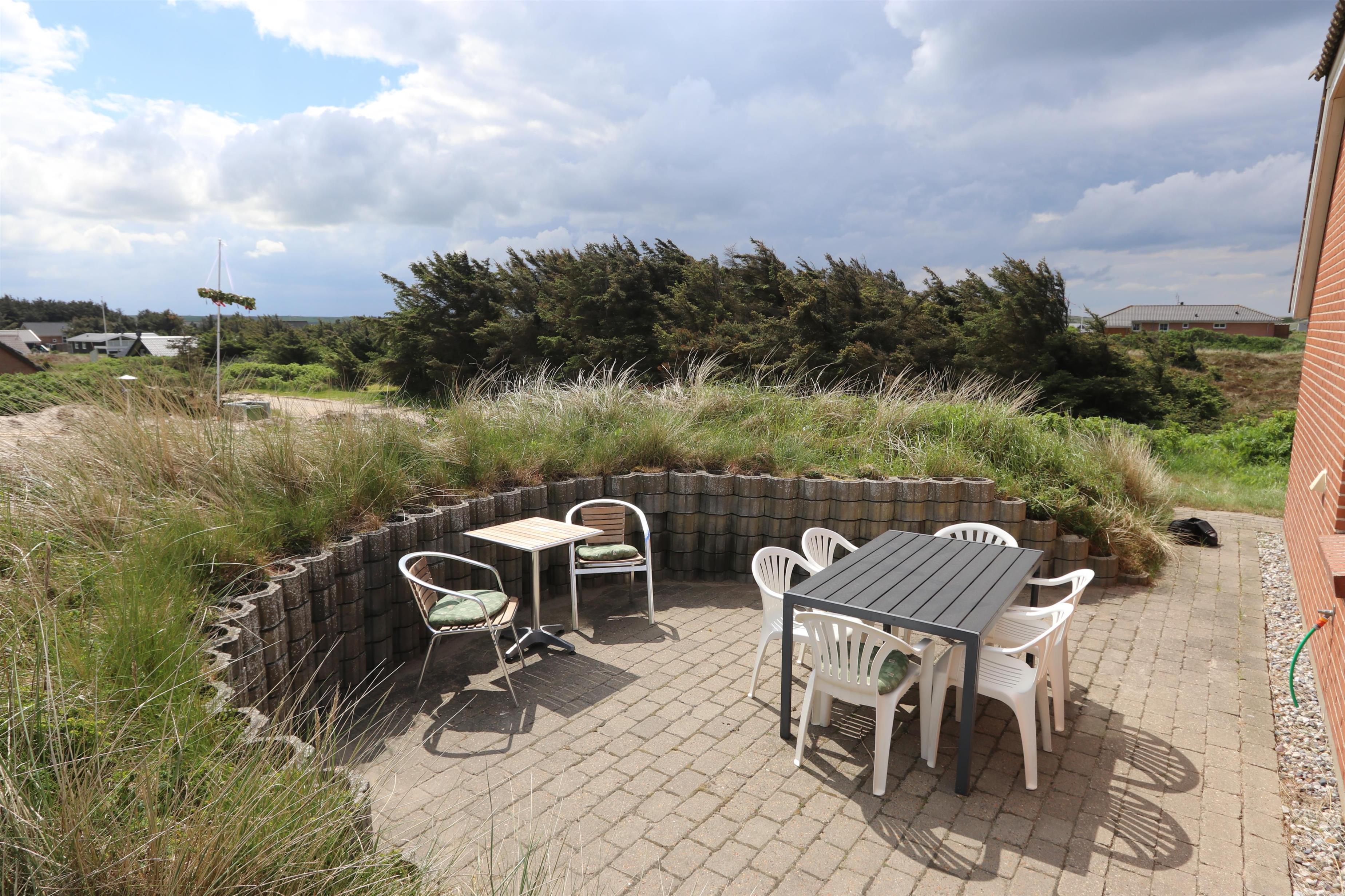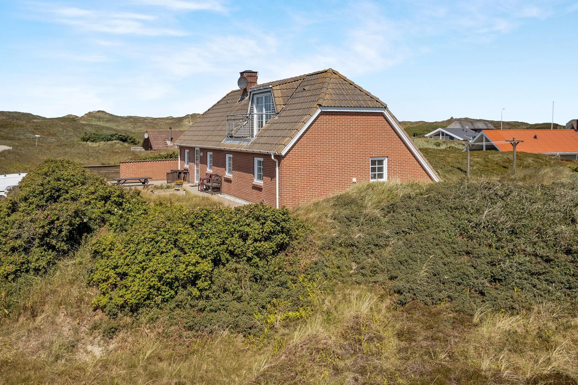 Huset er beliggende på en høj og ugenert naturgrund ved den yderste klitrække og blot 150 m til det dejlige Vesterhav. Huset har en dejlig sydvendt terrasse med læ mur mod vest og en hyggelig østvendt gryde terrasse gravet ind i klitten, herfra kan man nyde solen fra tidlig morgen. Havemøbler og liggestole er en selvfølgelighed. På 1. sal er der en balkon, hvorfra man har udsigt over det bølgende klitlandskab, feriehusområdet og retning mod Vesterhavet. Husets beliggenhed tæt på Vesterhavet byder på mange muligheder, I kan f.eks. vandre, løbe eller cykle en tur i området, eller besøge den dejlige sandstrand ved Vesterhavet, som indbyder til mange forskellige aktiviteter såsom lystfiskeri, badning, bygge sandslotte, finde rav eller flyve med drager. Alt i alt et særdeles attraktivt feriehus – uanset årstiden.