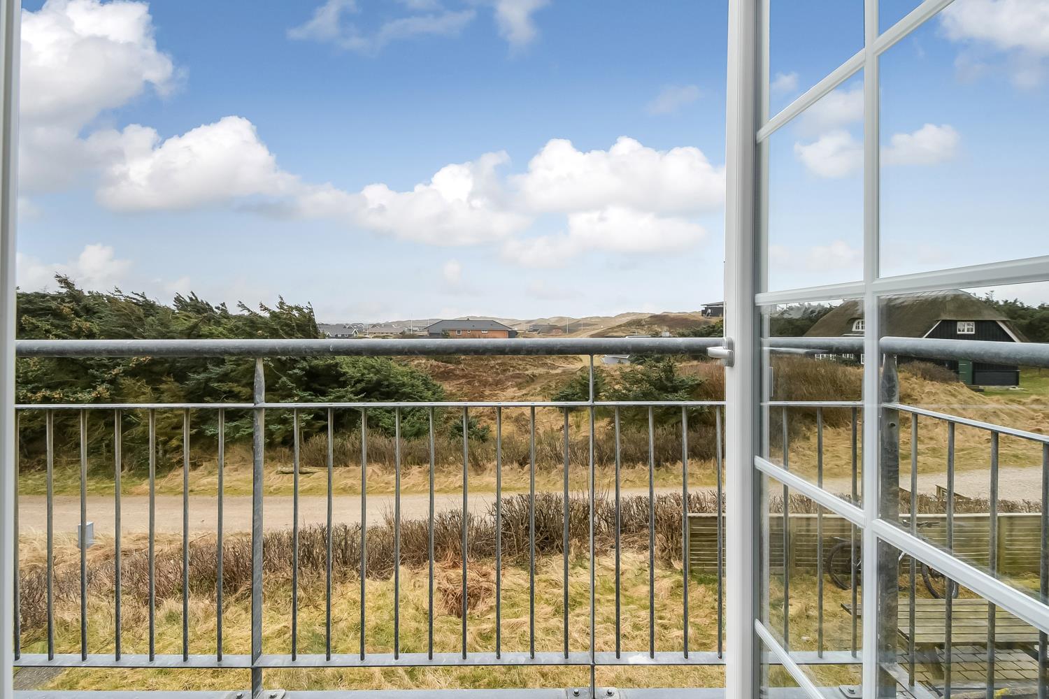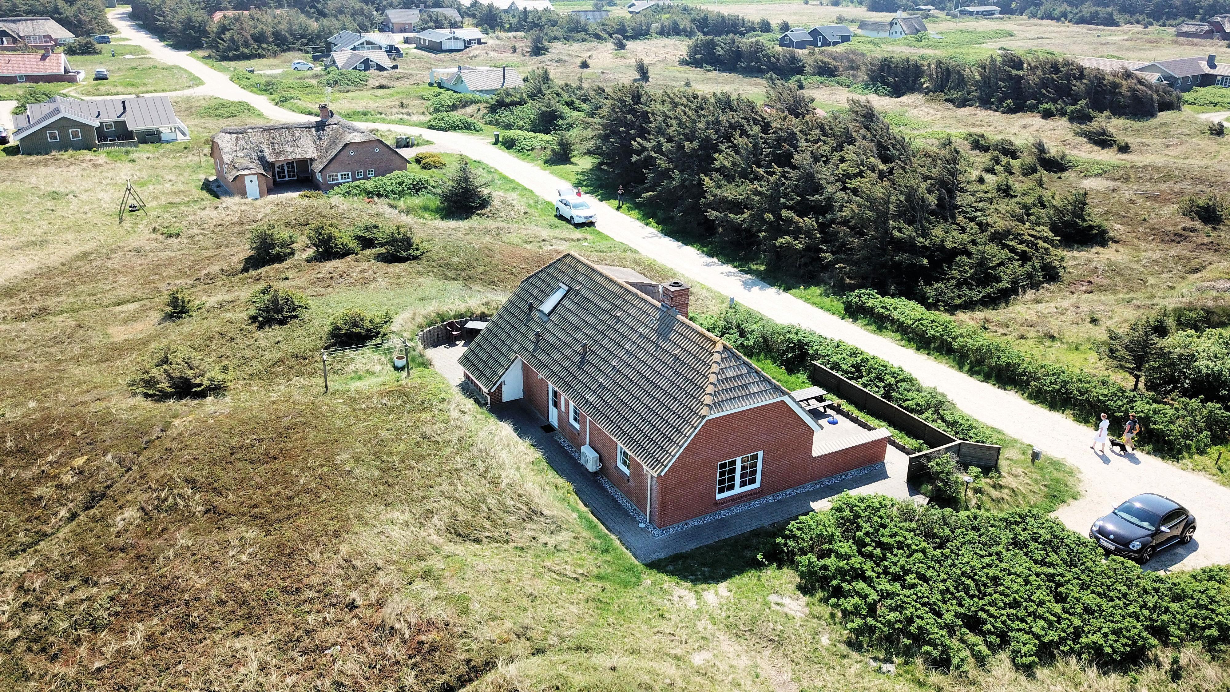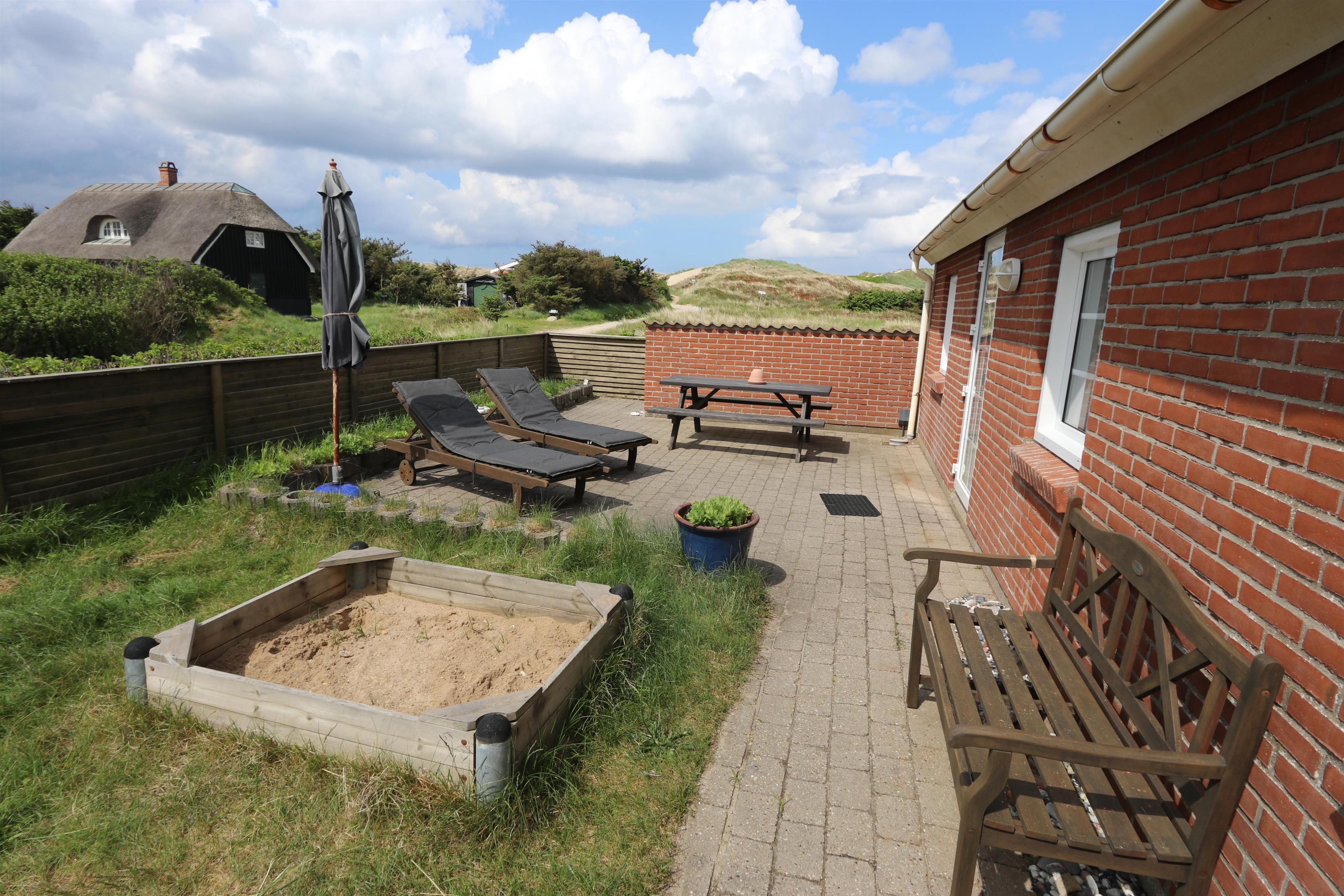 Huset er beliggende på en høj og ugenert naturgrund ved den yderste klitrække og blot 150 m til det dejlige Vesterhav. Huset har en dejlig sydvendt terrasse med læ mur mod vest og en hyggelig østvendt gryde terrasse gravet ind i klitten, herfra kan man nyde solen fra tidlig morgen. Havemøbler og liggestole er en selvfølgelighed. På 1. sal er der en balkon, hvorfra man har udsigt over det bølgende klitlandskab, feriehusområdet og retning mod Vesterhavet. Husets beliggenhed tæt på Vesterhavet byder på mange muligheder, I kan f.eks. vandre, løbe eller cykle en tur i området, eller besøge den dejlige sandstrand ved Vesterhavet, som indbyder til mange forskellige aktiviteter såsom lystfiskeri, badning, bygge sandslotte, finde rav eller flyve med drager. Alt i alt et særdeles attraktivt feriehus – uanset årstiden.