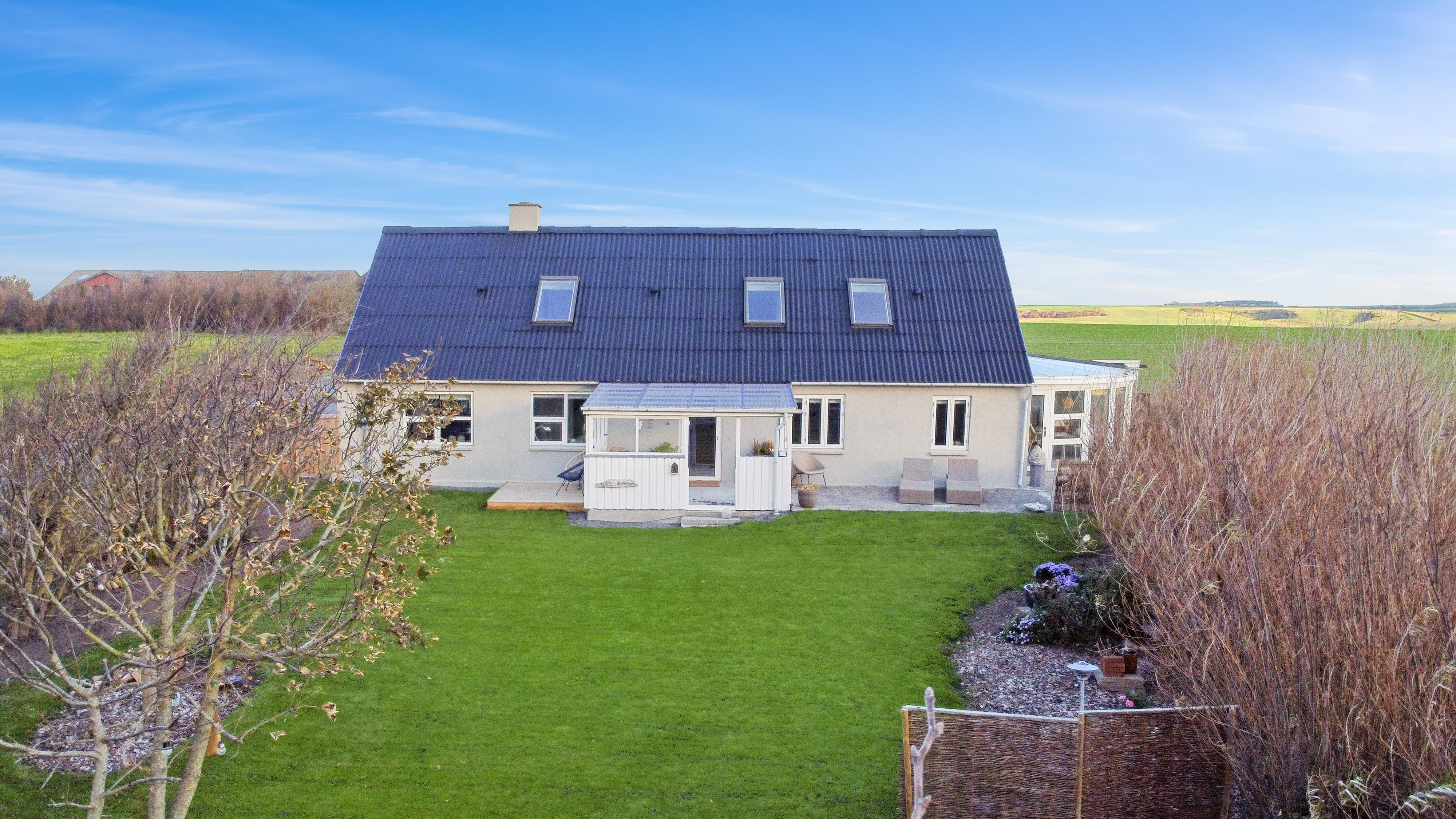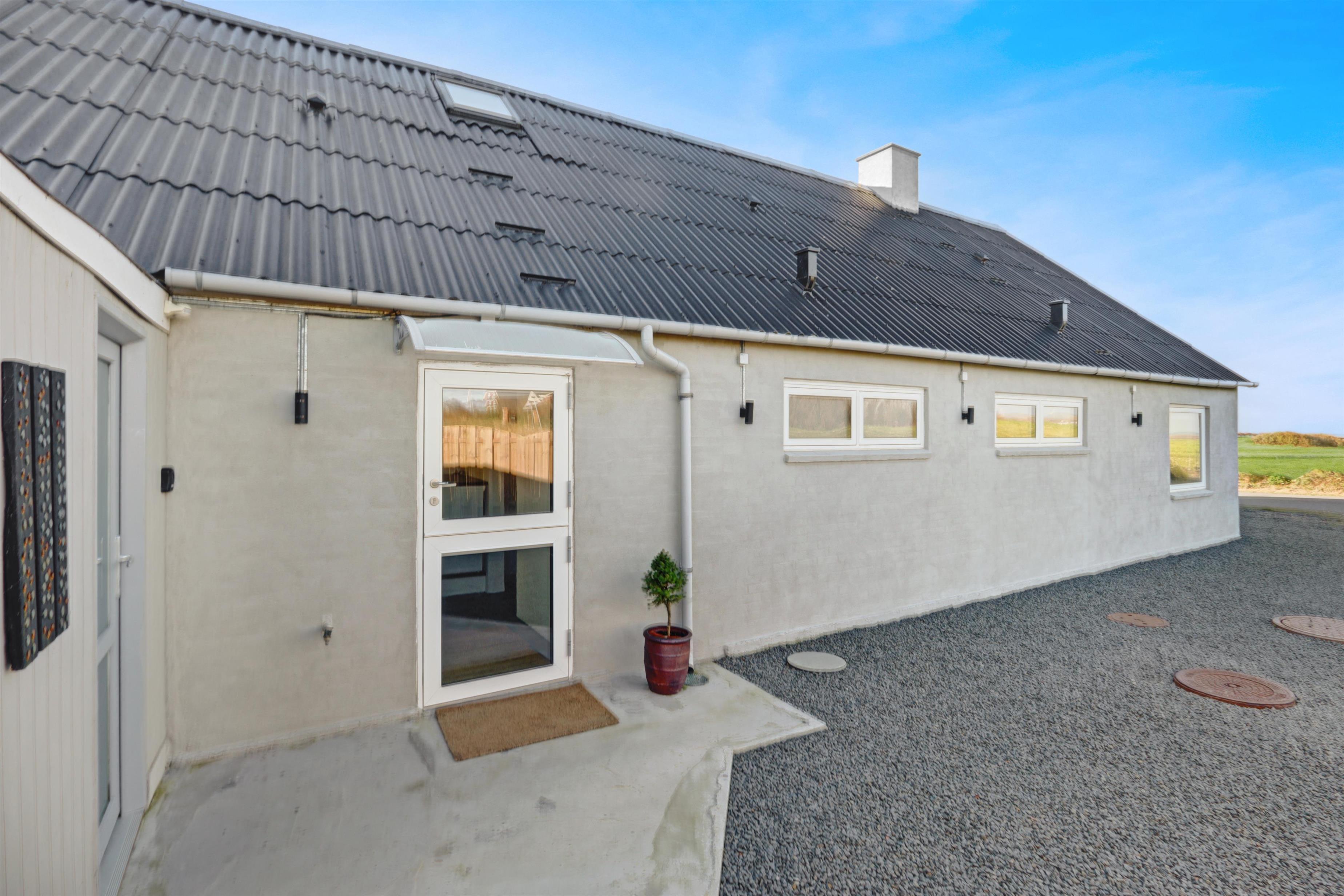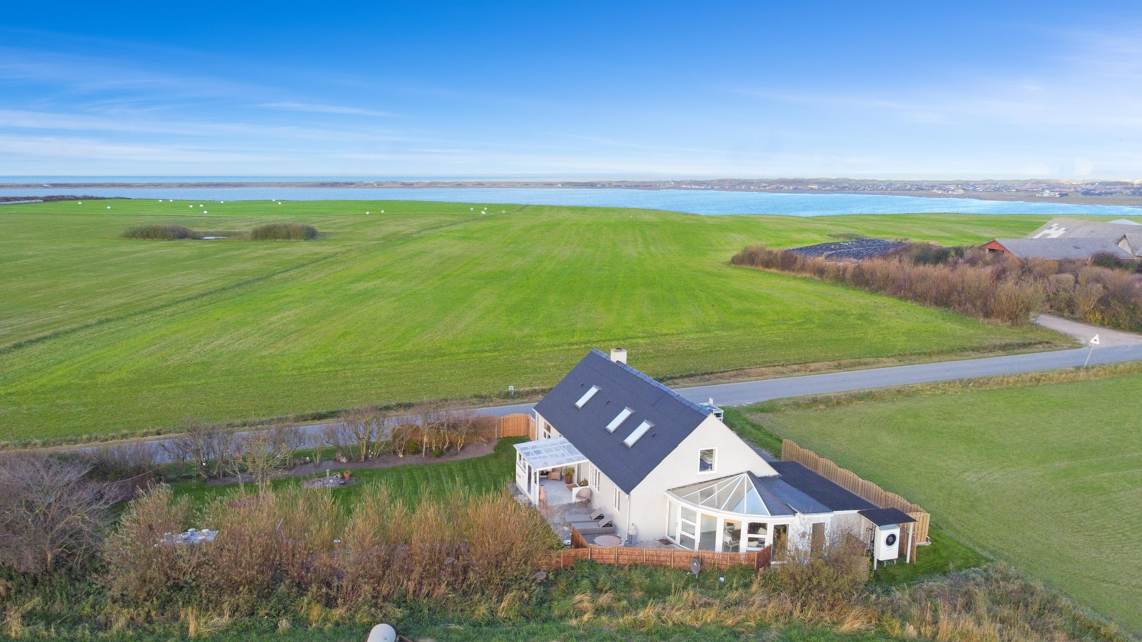 Huset er beliggende på en 802 m2 grund med flere gode terrasser hvor der altid er mulighed for at finde læ, der er en overdækket terrasse, hvor man kan forlænge de kølige aftner. Der er havemøbler, solvogne og grill som kan flyttes rundt efter behov. Grunden er omgivet af buske og træer som giver gode læmuligheder. Huset ligger ca. 2250 m fra Vesterhavet og indkøb sommersæson. Eller 10 min kørsel til gode indkøbsmuligheder. Der findes en have med masser af charme. Ønsker man at bo fantastisk med en flot udsigt og helt for sig selv så er dette hus det perfekte valg.