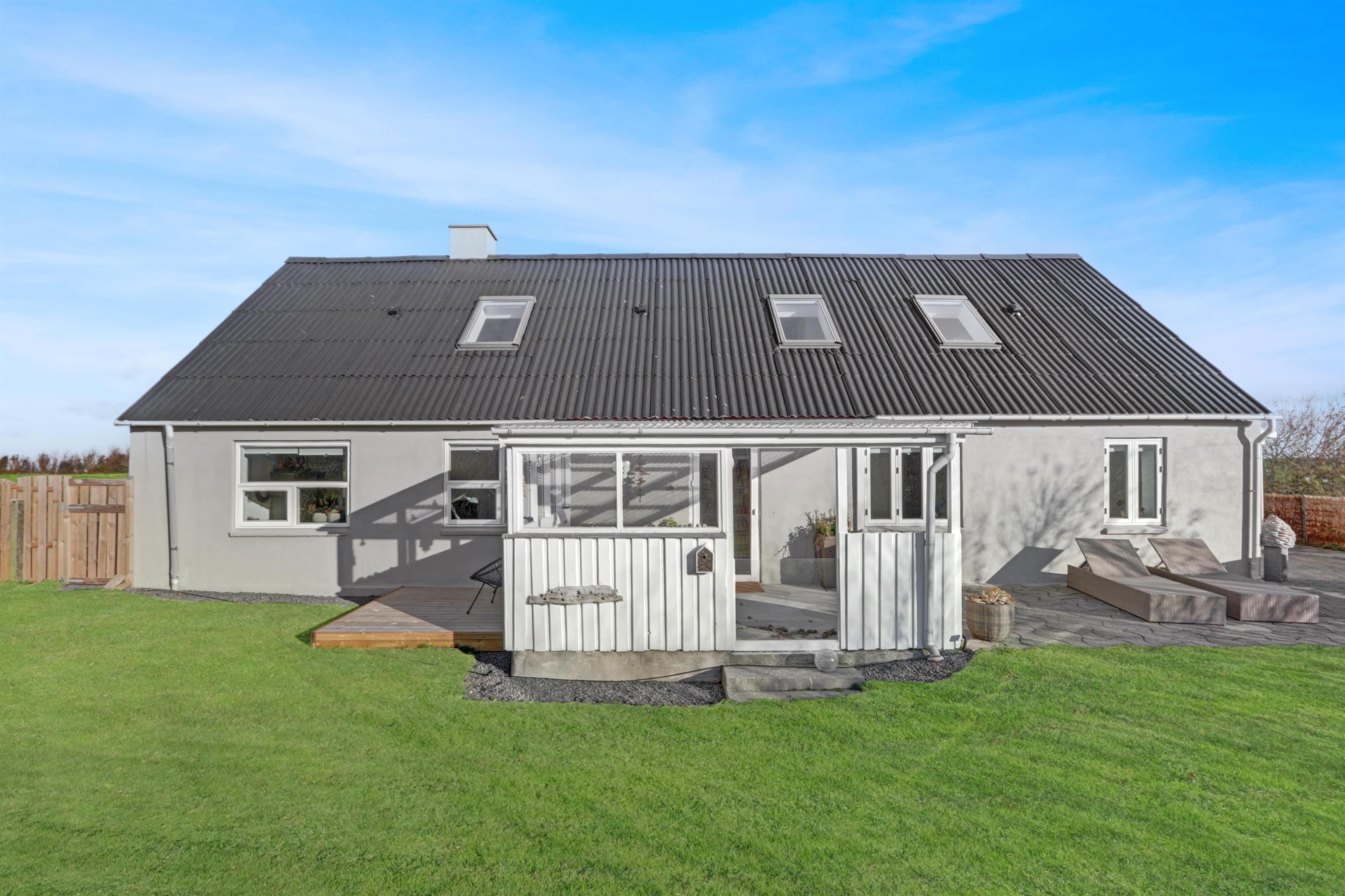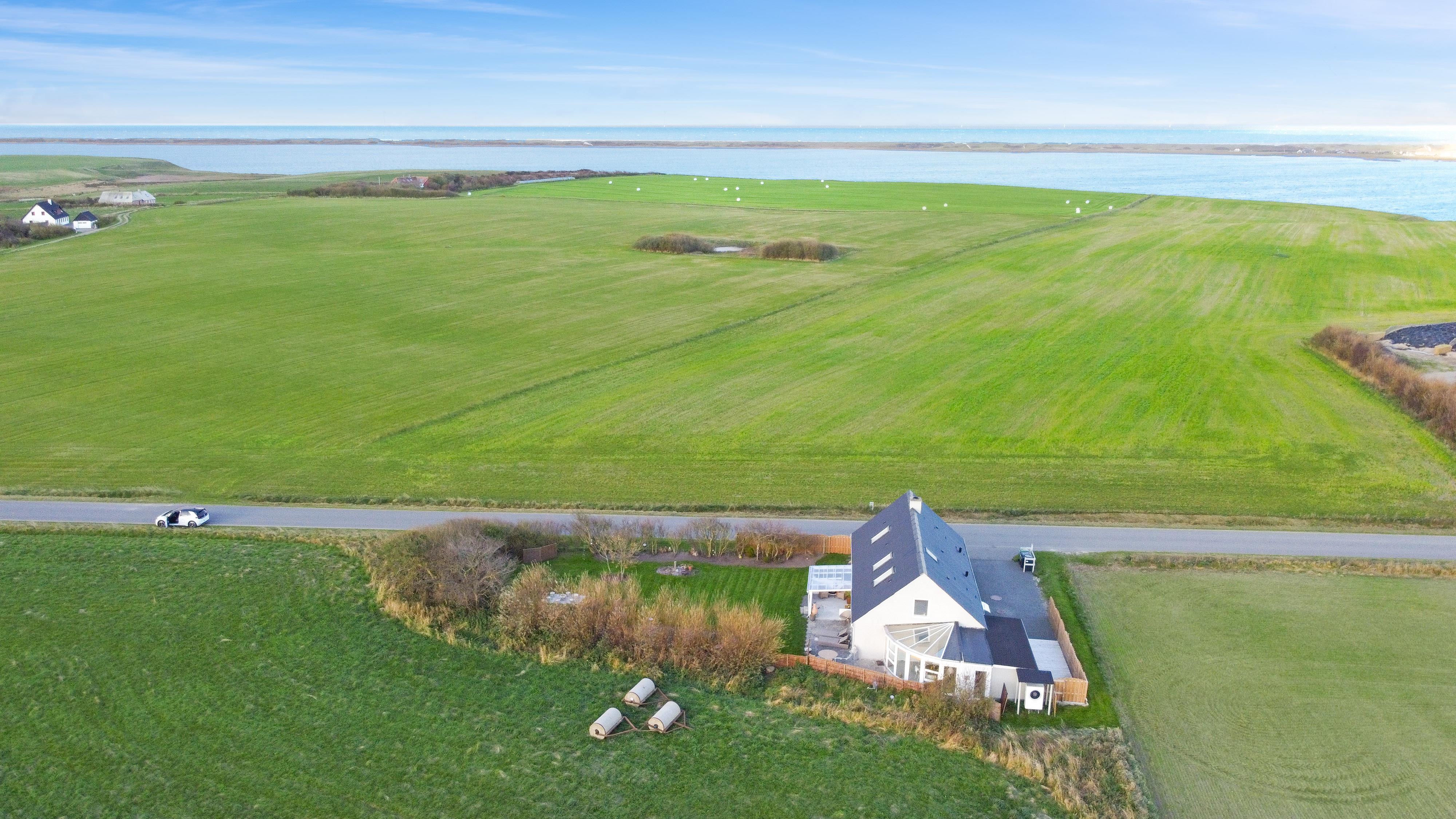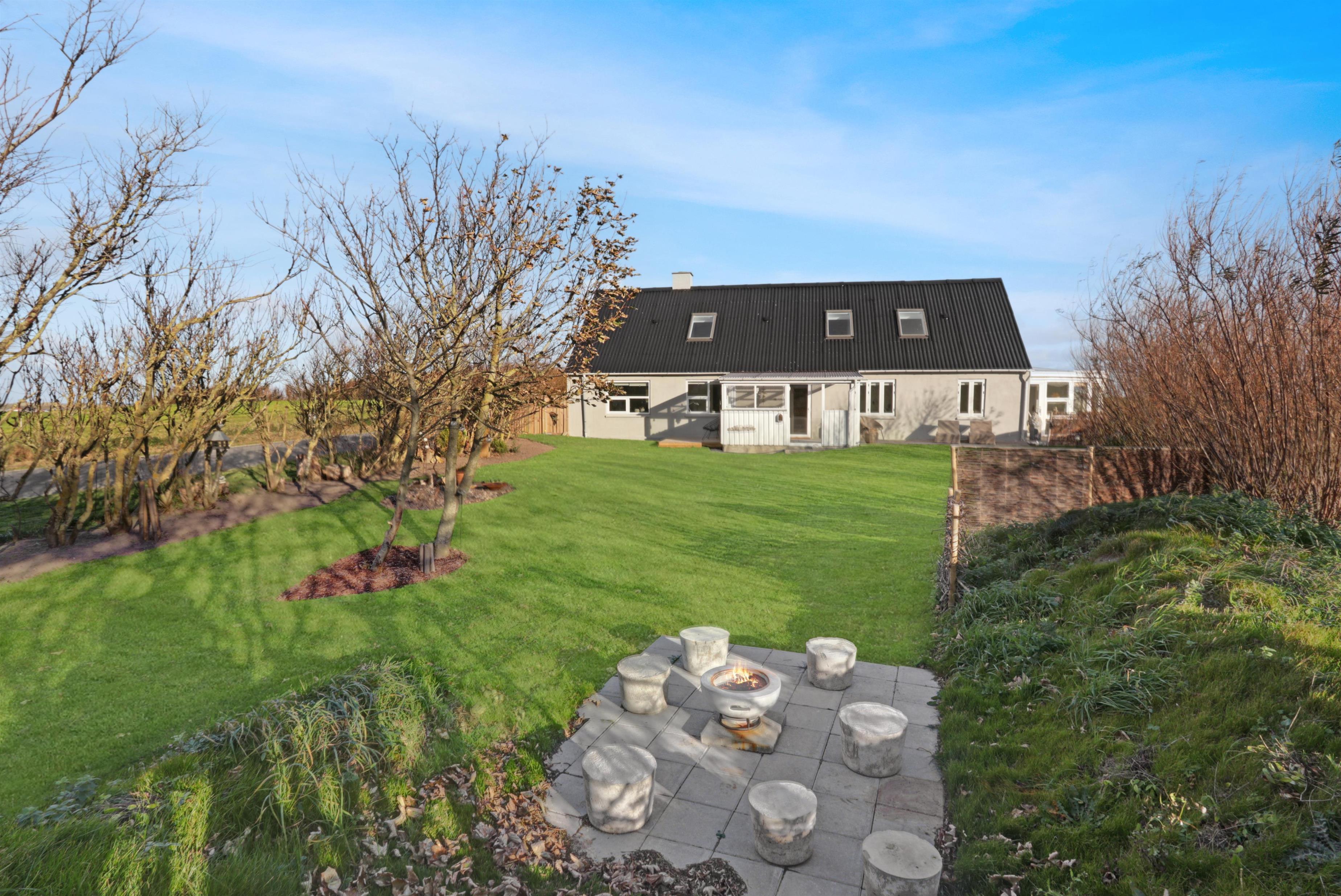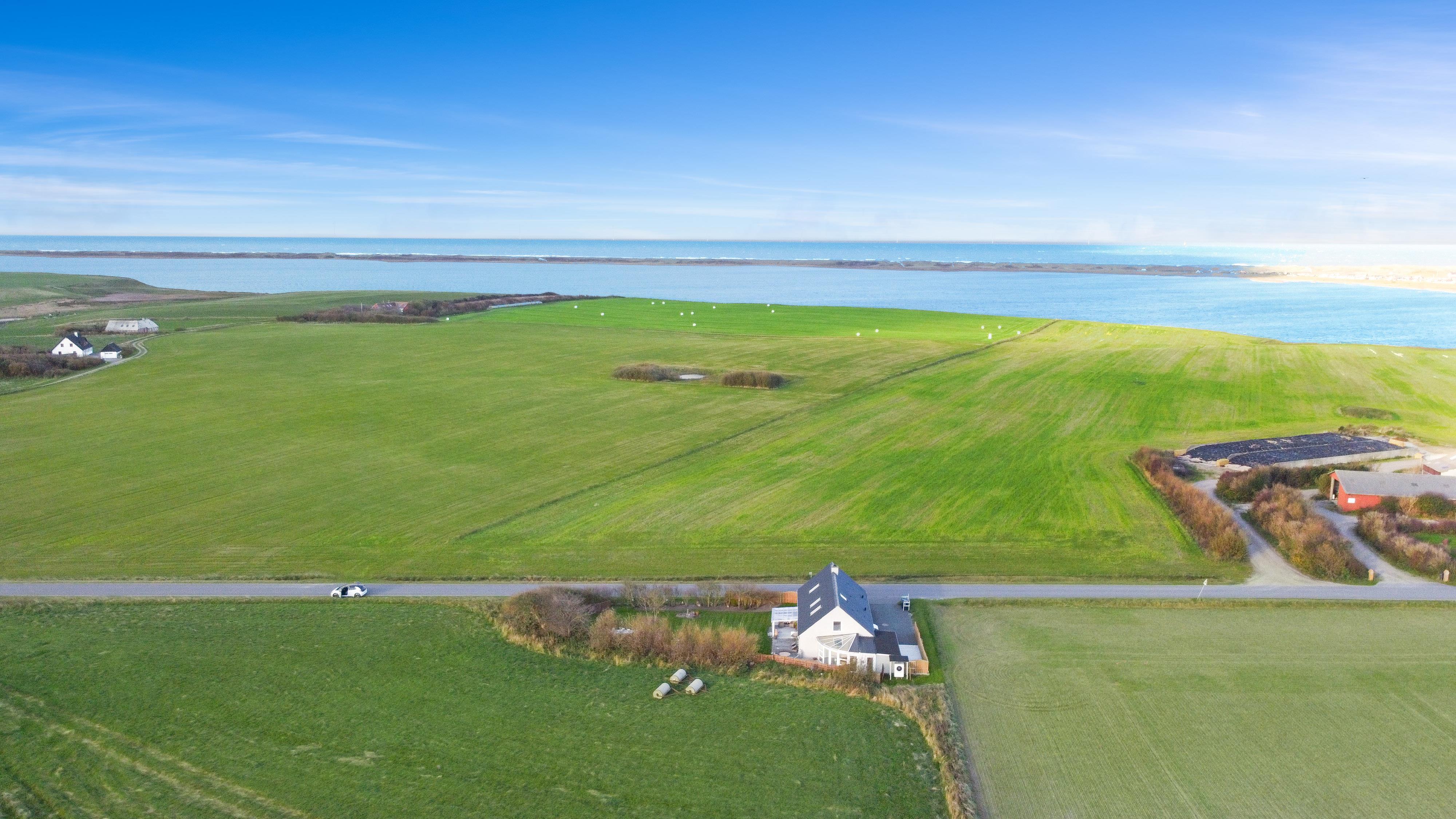 Huset er beliggende på en 802 m2 grund med flere gode terrasser hvor der altid er mulighed for at finde læ, der er en overdækket terrasse, hvor man kan forlænge de kølige aftner. Der er havemøbler, solvogne og grill som kan flyttes rundt efter behov. Grunden er omgivet af buske og træer som giver gode læmuligheder. Huset ligger ca. 2250 m fra Vesterhavet og indkøb sommersæson. Eller 10 min kørsel til gode indkøbsmuligheder. Der findes en have med masser af charme. Ønsker man at bo fantastisk med en flot udsigt og helt for sig selv så er dette hus det perfekte valg.