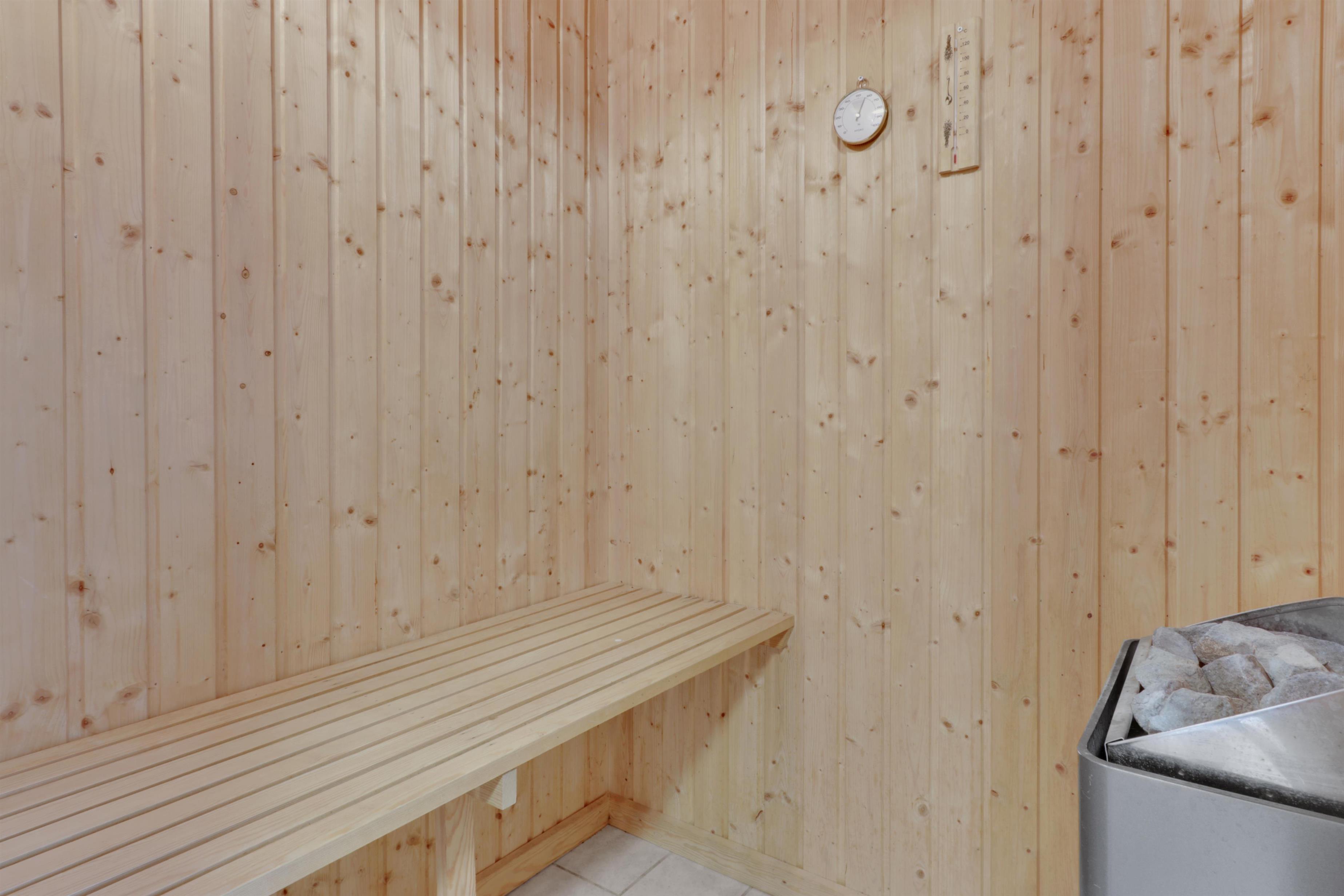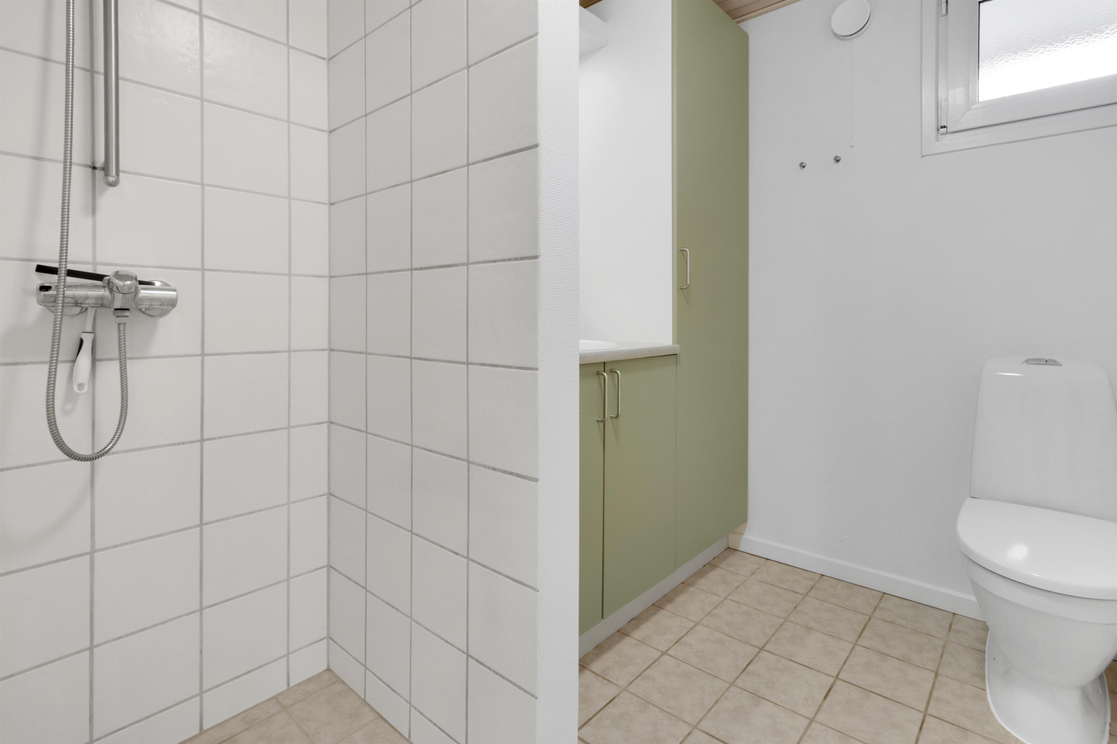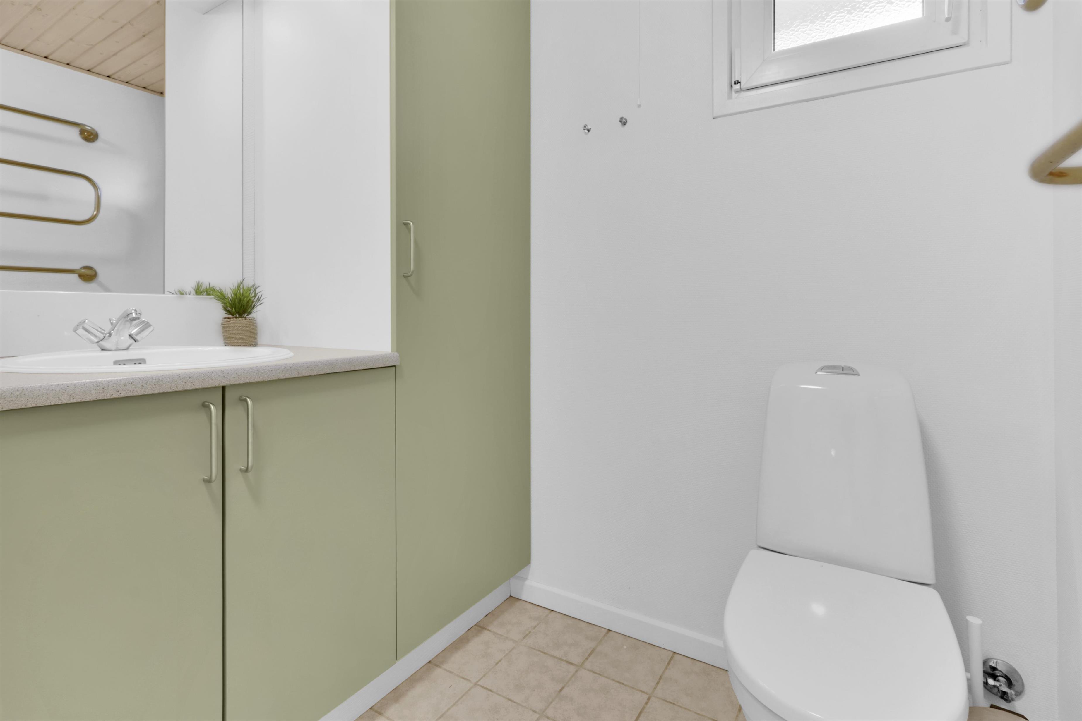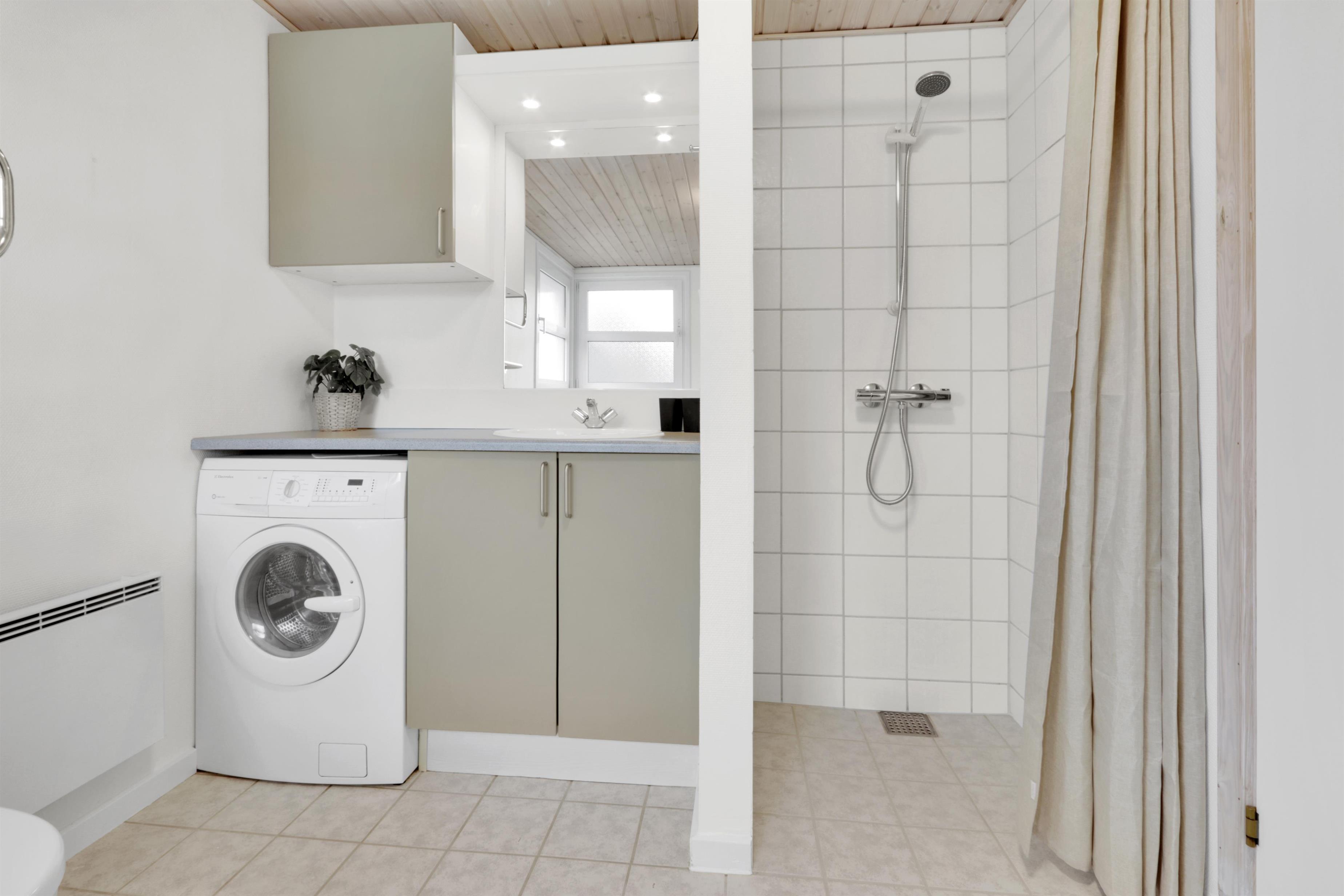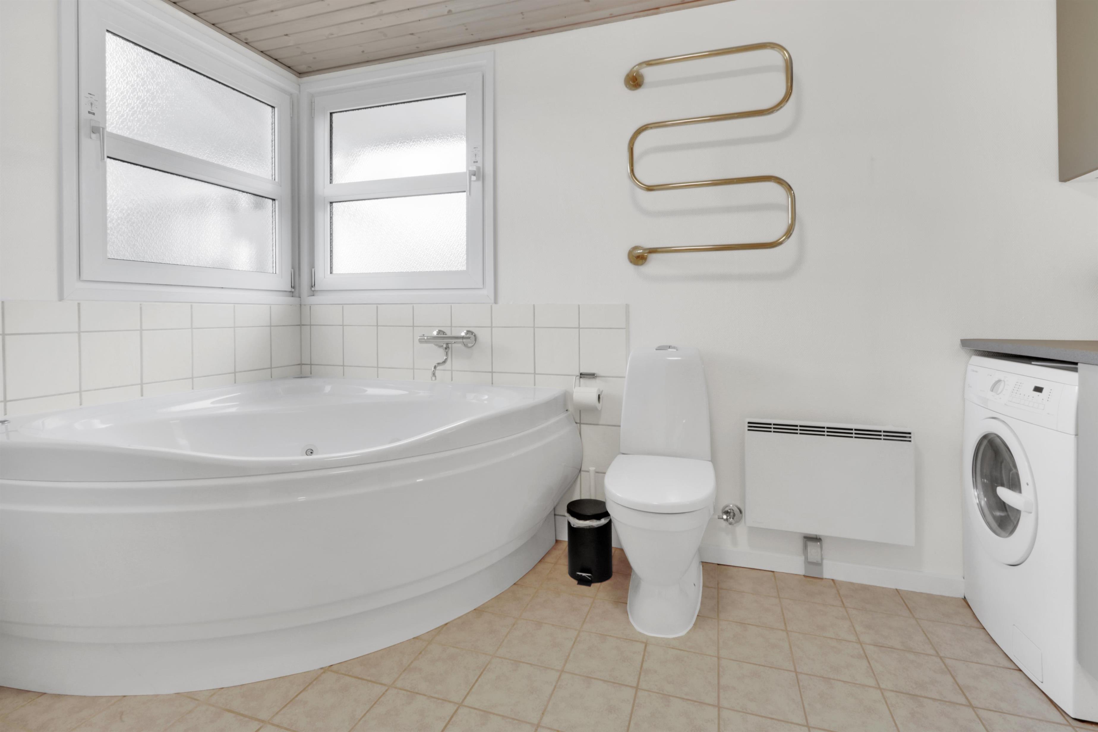 Huset har to moderne badeværelser, begge med toilet, håndvask, bruser og gulvvarme. Det store badeværelse byder desuden på et afslappende spabad, sauna samt en praktisk vaskemaskine. Overalt i huset er der rengøringsvenlige gulve.