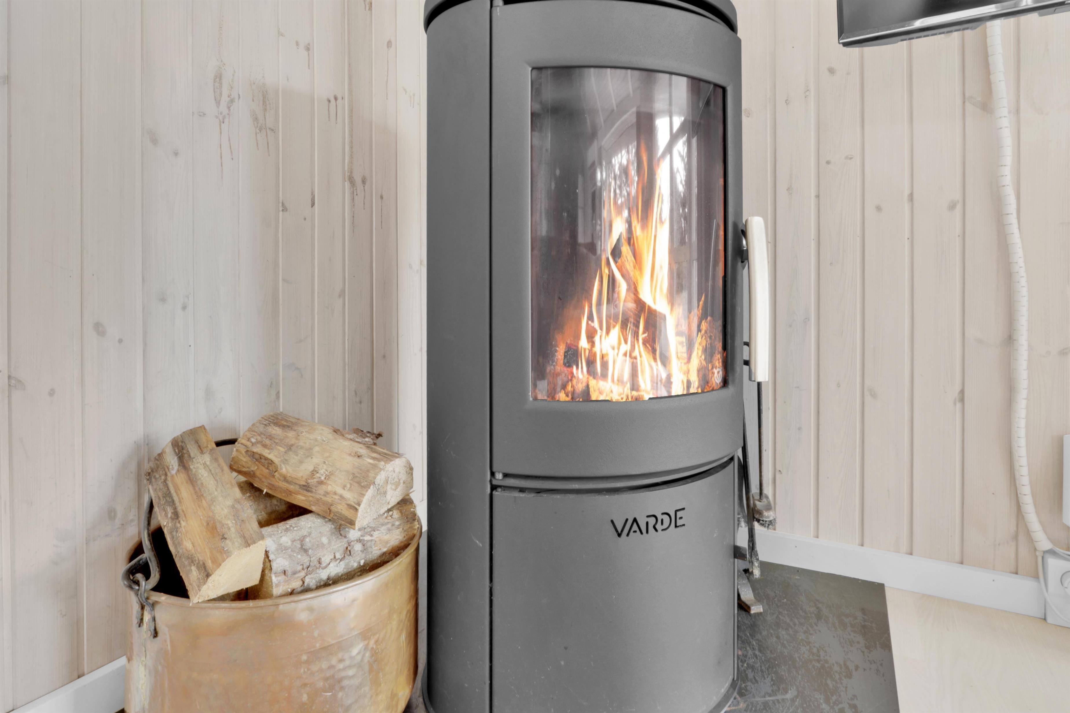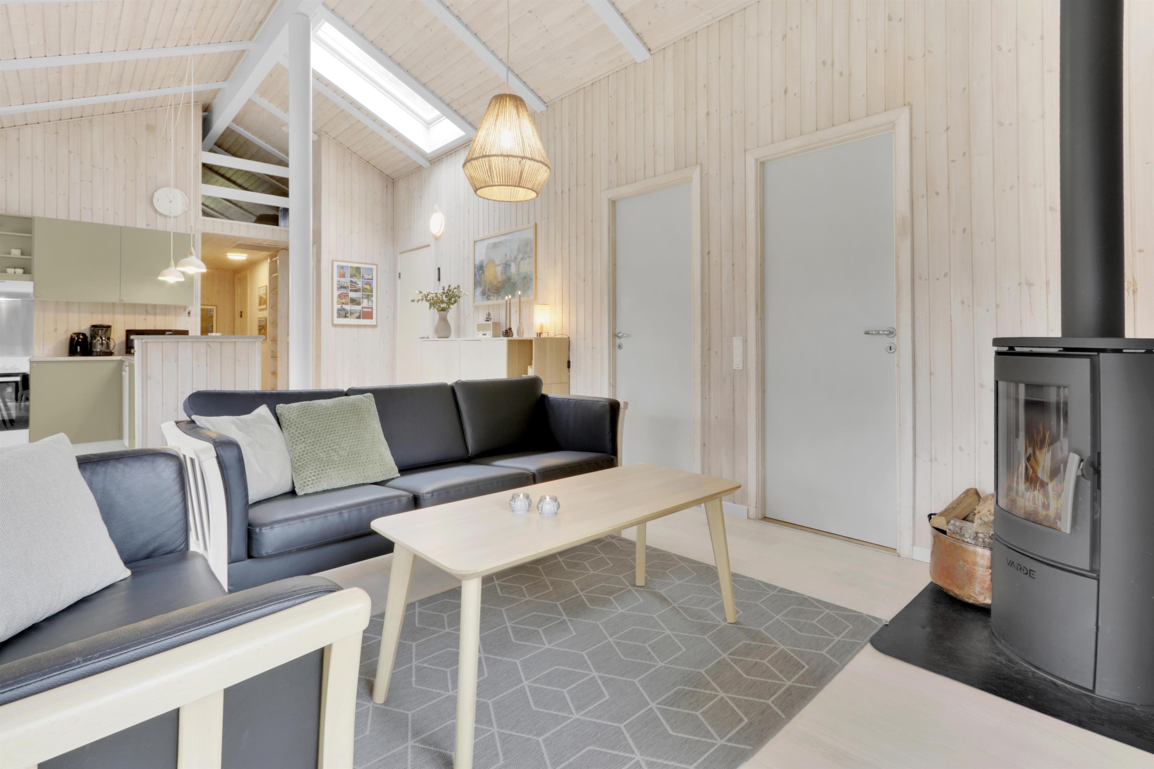 Den lyse og venlige opholdsstue indbyder til afslapning med komfortable lædermøbler, en knitrende brændeovn og et TV med danske og tyske kanaler. En effektiv varmepumpe sikrer et behageligt indeklima året rundt.