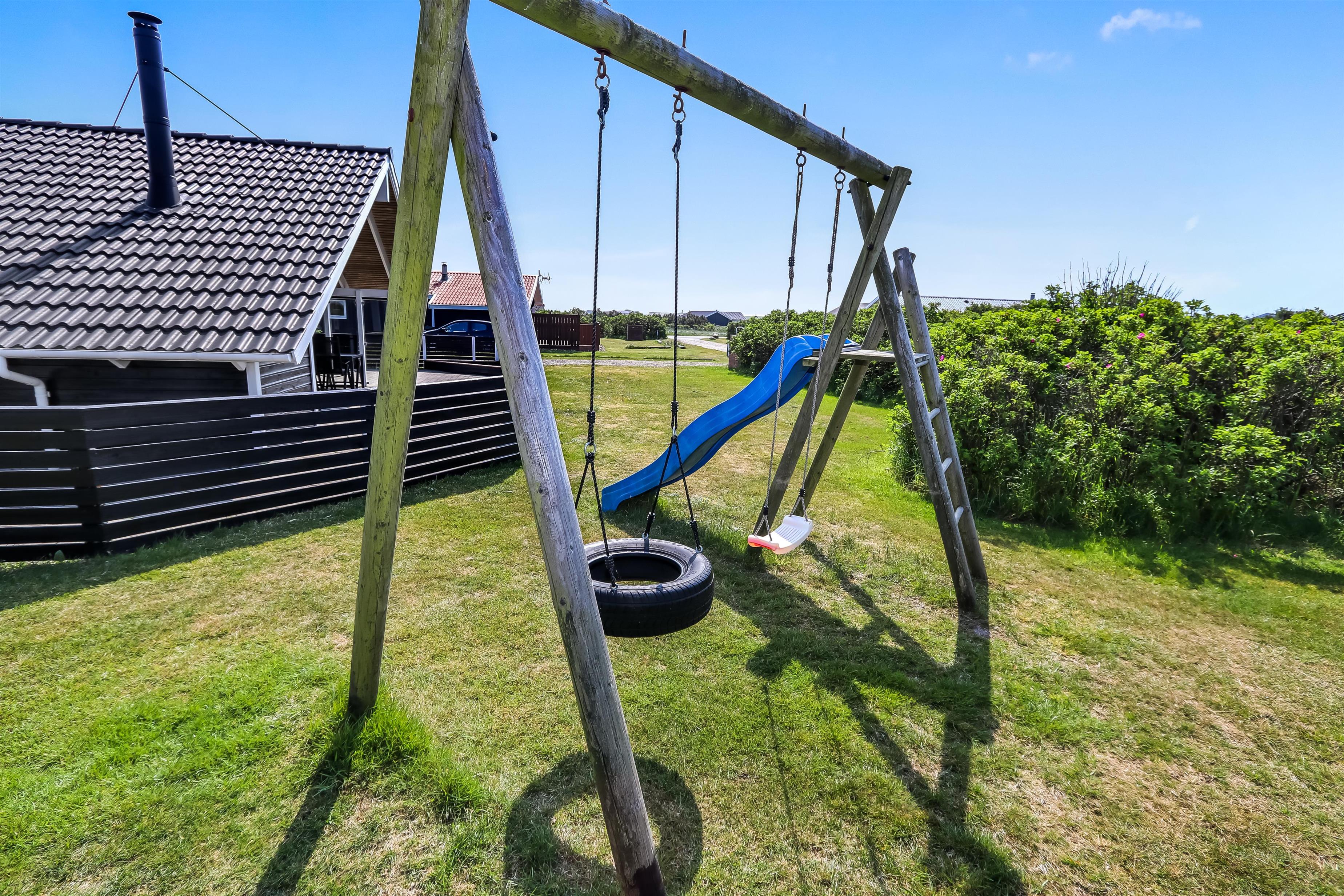 Fra opholdsstuen er der direkte udgang til en, dejlig, indhegnet, vestvendt terrasse med havemøbler, liggestole og grill og altid en plads at finde i solen. Den 1.200m2 grund er velholdt og giver masser af muligheder for leg og boldspil. I gåafstand fra huset findes desuden boldbane og legeplads. Huset ligger kun 400m fra Ferring sø og 450 fra Vesterhavet, så der er rig mulighed for en varieret tur i området. Restaurant og købmand har sæsonåbnet og ligger ligeledes i gåafstand fra huset. Inden for 5 minutter i bil til Harboøre, kan flere aktiviteter og shopping muligheder nås. Så hvad enten I er til aktiv ferie eller total afslapning, danner dette dejlige feriehus en perfekt ramme både hvad angår hus, beliggenhed og omgivelser.