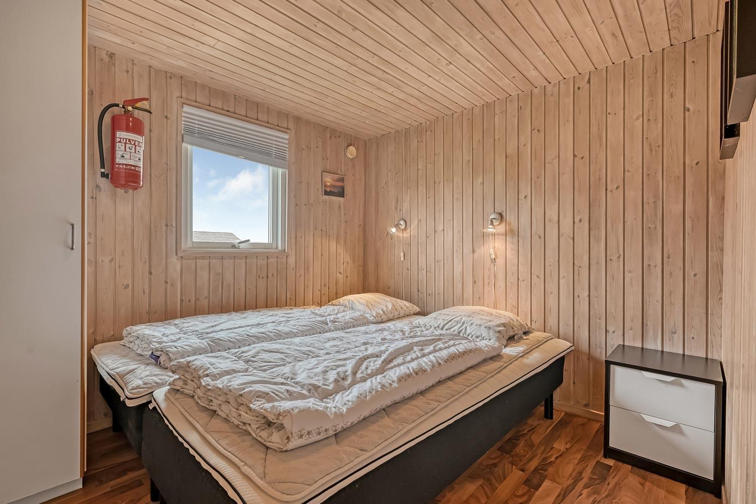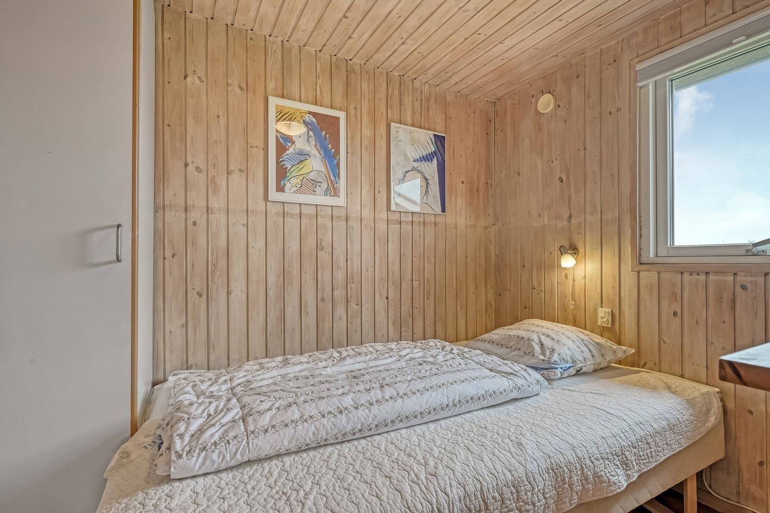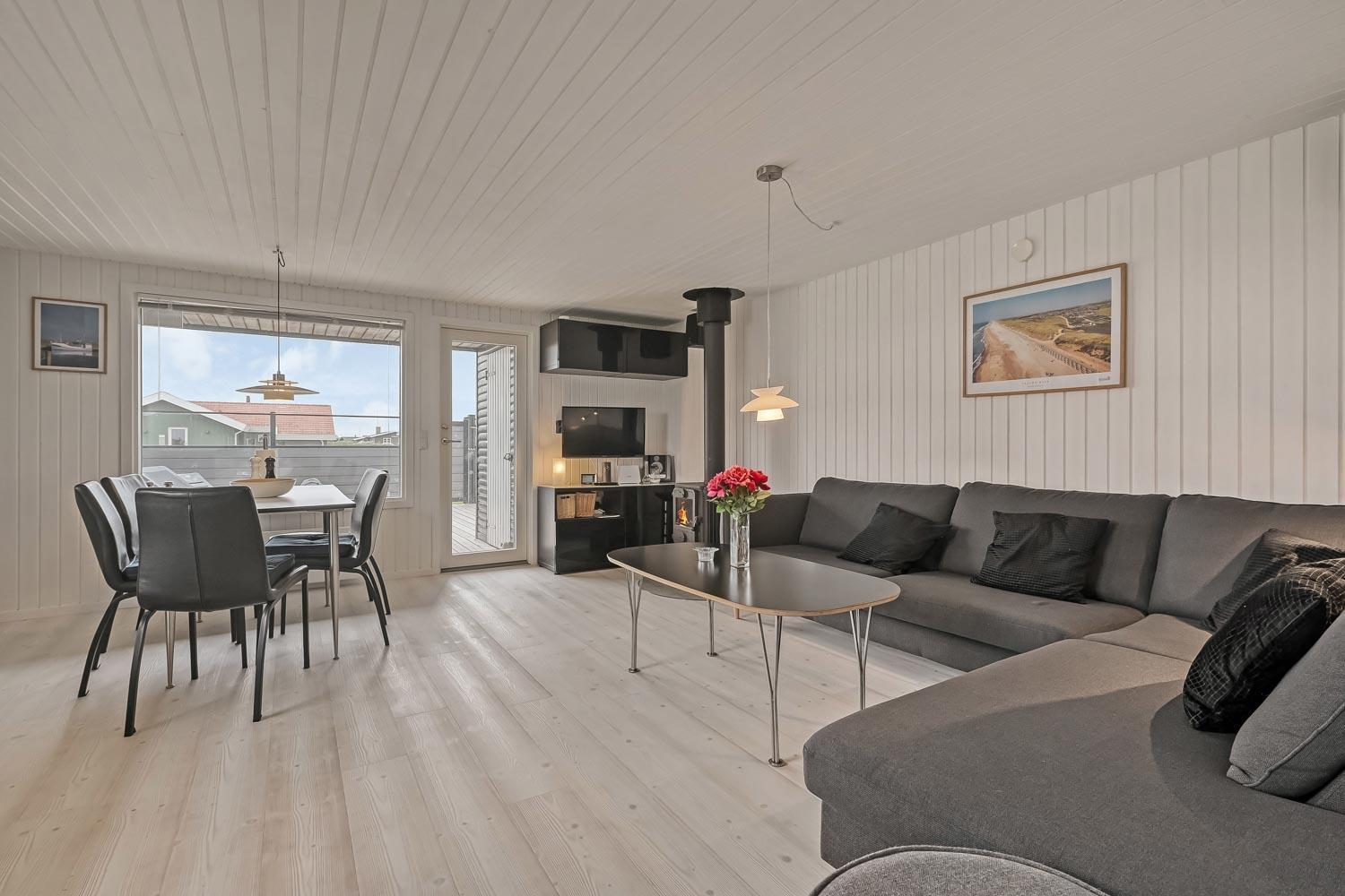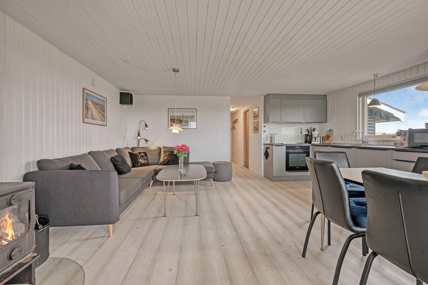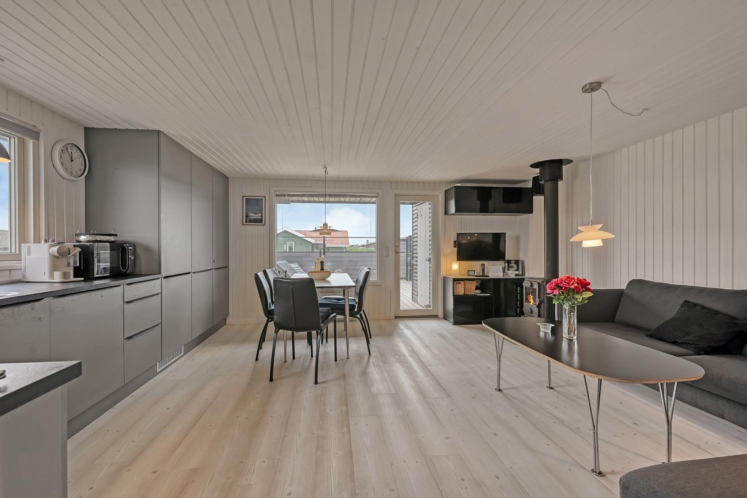 Flot træferiehus på 63 m2 fra 1994 og er siden løbende renoveret. Husets største rum er et åbent køkken og opholdsstue med paketgulv fra 2025. Stuen er hyggeligt indrettet med hjørnesofa, TV med danske og tyske kanaler, spillekonsol samt mulighed for at streame via chromecast til egne streamingtjenester. Spiseafdeling med udsyn på terrassen gennem det store vindue, som giver et godt lysindfald. I stuen er der også en brændeovn, som bidrager til energivenlig opvarmning af huset. Det åbne køkkenhjørne er udstyret med det nødvendige køkkengrej samt glaskeramisk kogeplade, indbygninsgovn, emhætte, mikrobølgeovn, køle-/fryseskab og opvaskemaskine. Køkkenalrummet byder på at man kan samles hele familien på et sted. Fra køkkenalrummet er der adgang til gangen, hvorfra man kommer ud i husets 3 soveværelser (2S, 1DS, 1DS) og badeværelse. Badeværelset er med toilet, håndvask, bruser, spa, sauna og klinkegulv med gulvvarme. (Sauna udgår i 2026) Ikke ryger hus. Max 1 husdyr tilladt.