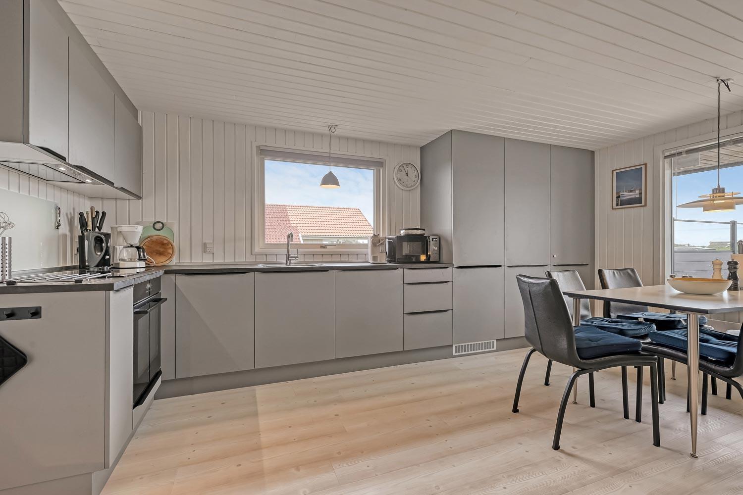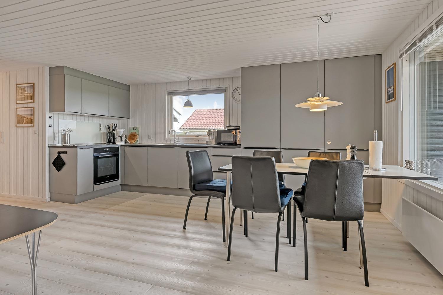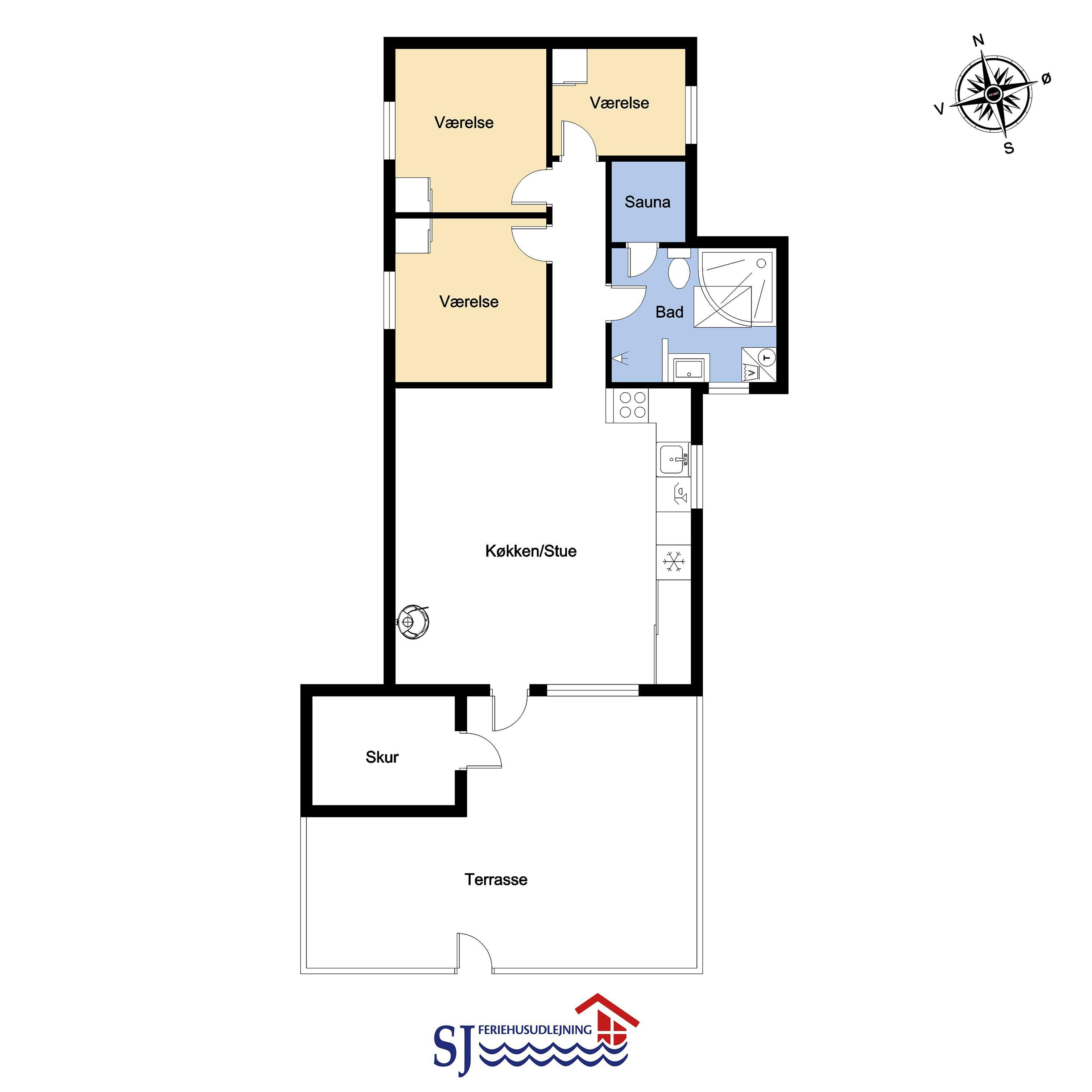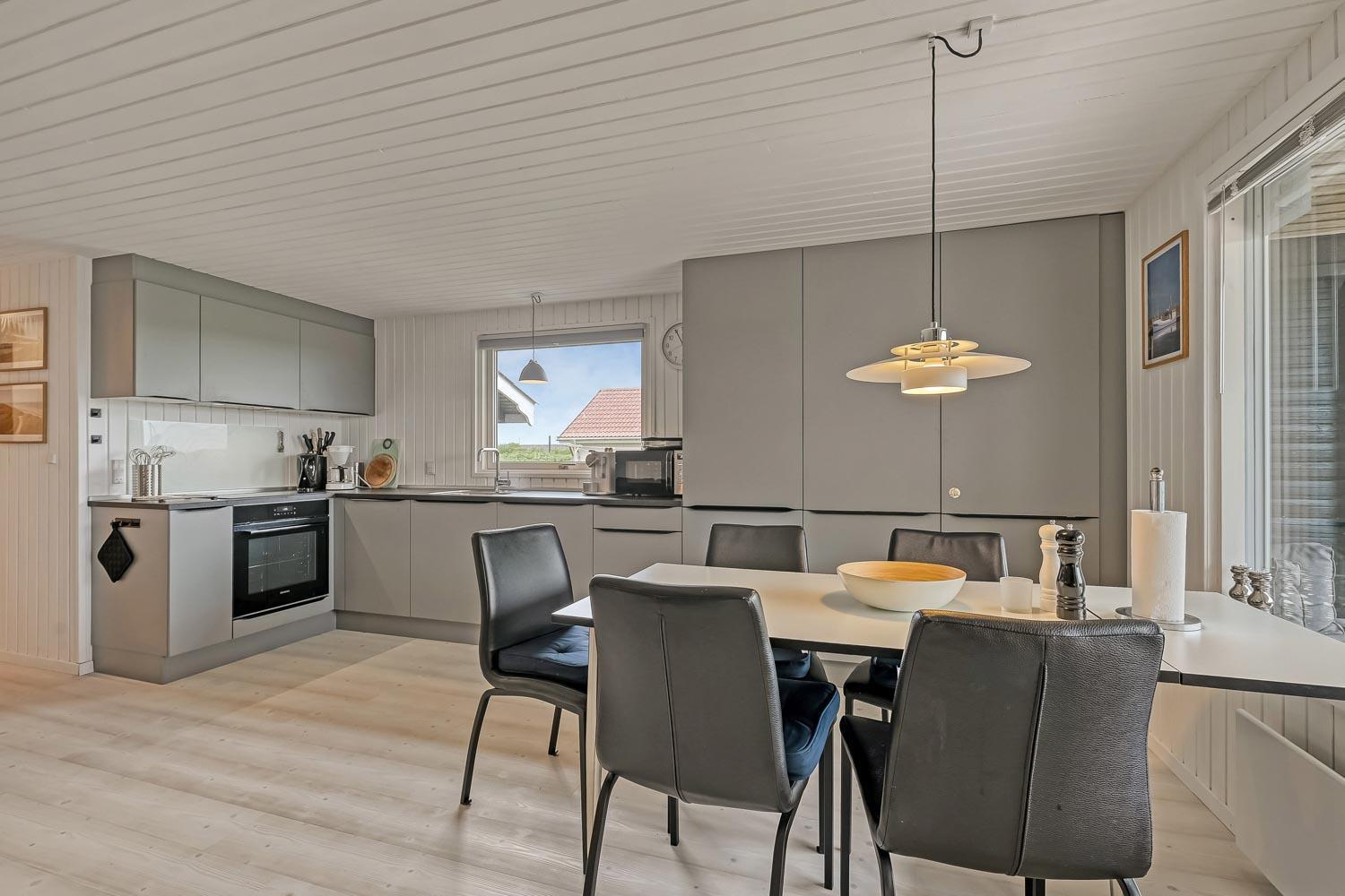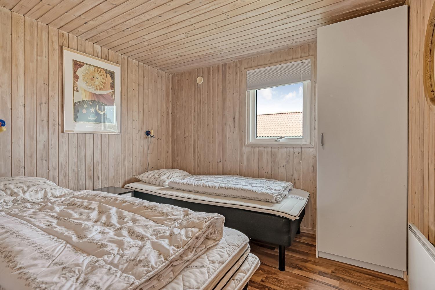 Flot træferiehus på 63 m2 fra 1994 og er siden løbende renoveret. Husets største rum er et åbent køkken og opholdsstue med paketgulv fra 2025. Stuen er hyggeligt indrettet med hjørnesofa, TV med danske og tyske kanaler, spillekonsol samt mulighed for at streame via chromecast til egne streamingtjenester. Spiseafdeling med udsyn på terrassen gennem det store vindue, som giver et godt lysindfald. I stuen er der også en brændeovn, som bidrager til energivenlig opvarmning af huset. Det åbne køkkenhjørne er udstyret med det nødvendige køkkengrej samt glaskeramisk kogeplade, indbygninsgovn, emhætte, mikrobølgeovn, køle-/fryseskab og opvaskemaskine. Køkkenalrummet byder på at man kan samles hele familien på et sted. Fra køkkenalrummet er der adgang til gangen, hvorfra man kommer ud i husets 3 soveværelser (2S, 1DS, 1DS) og badeværelse. Badeværelset er med toilet, håndvask, bruser, spa, sauna og klinkegulv med gulvvarme. (Sauna udgår i 2026) Ikke ryger hus. Max 1 husdyr tilladt.