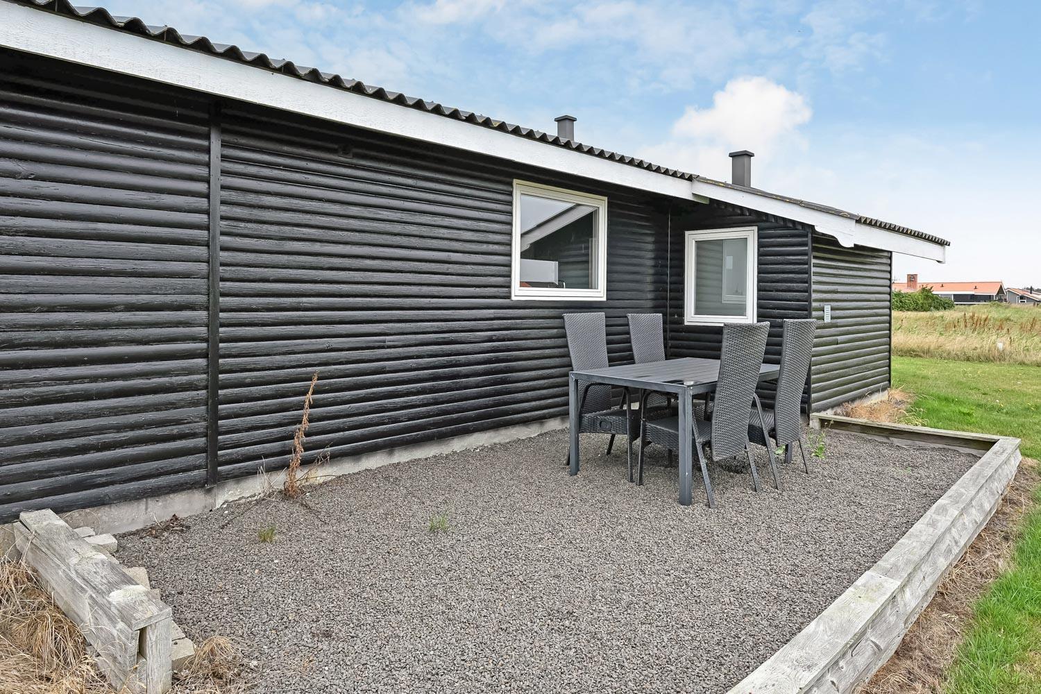 Hyggeligt lille feriehus i træ med træterrasse beliggende i Vejlby Klit ikke langt fra Vesterhavet. Huset giver plads til 5 personer og er derfor velegnet til den lille familie eller par. Max 1 husdyr er tilladt. Gratis internetforbindelse (fiber).