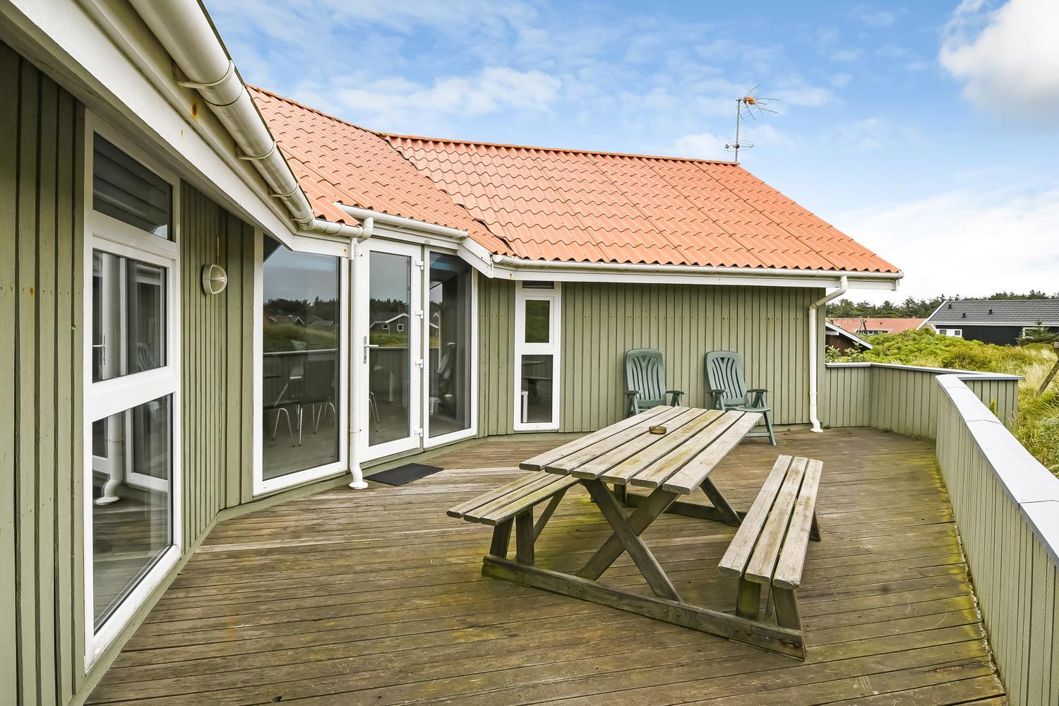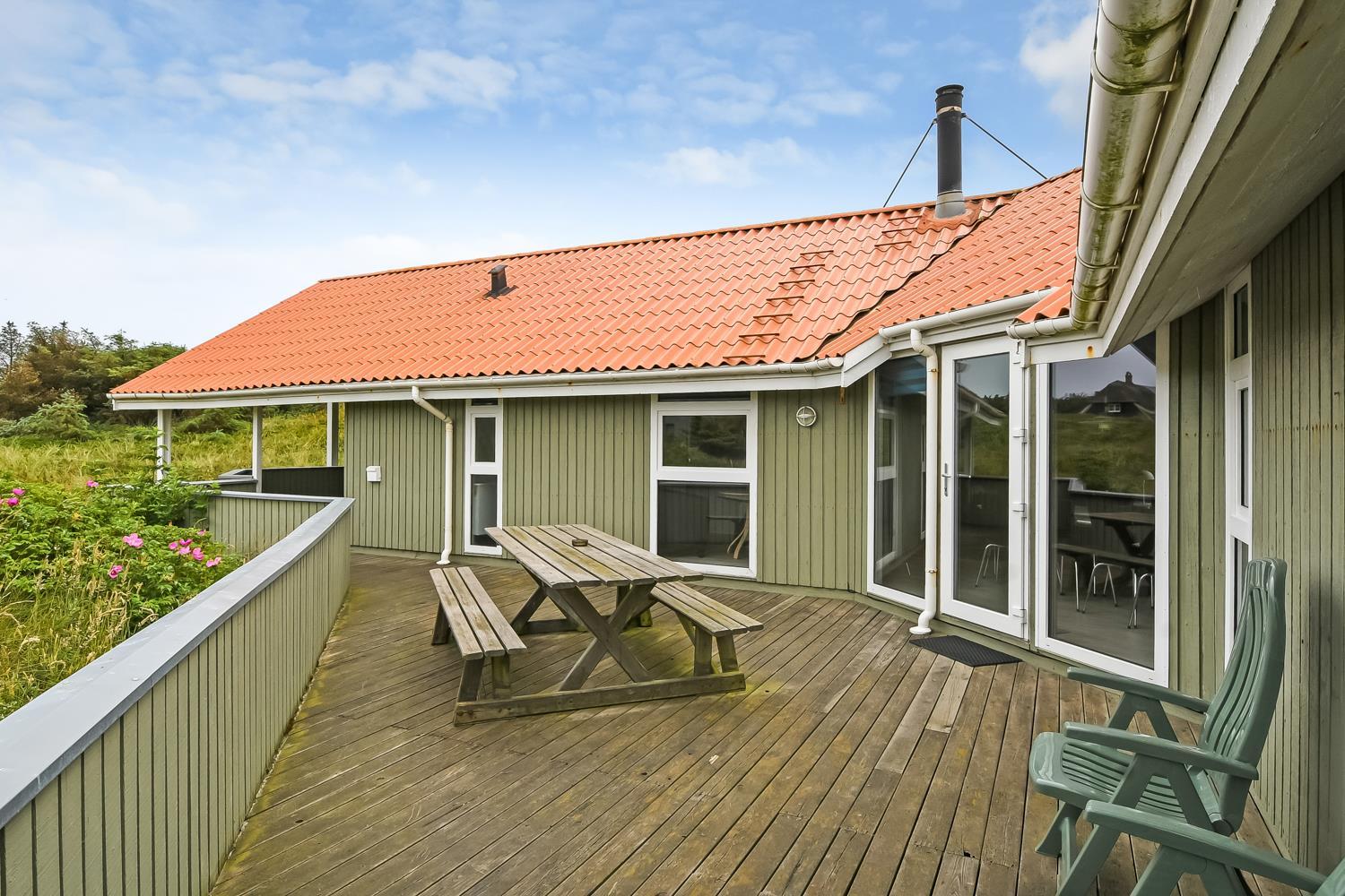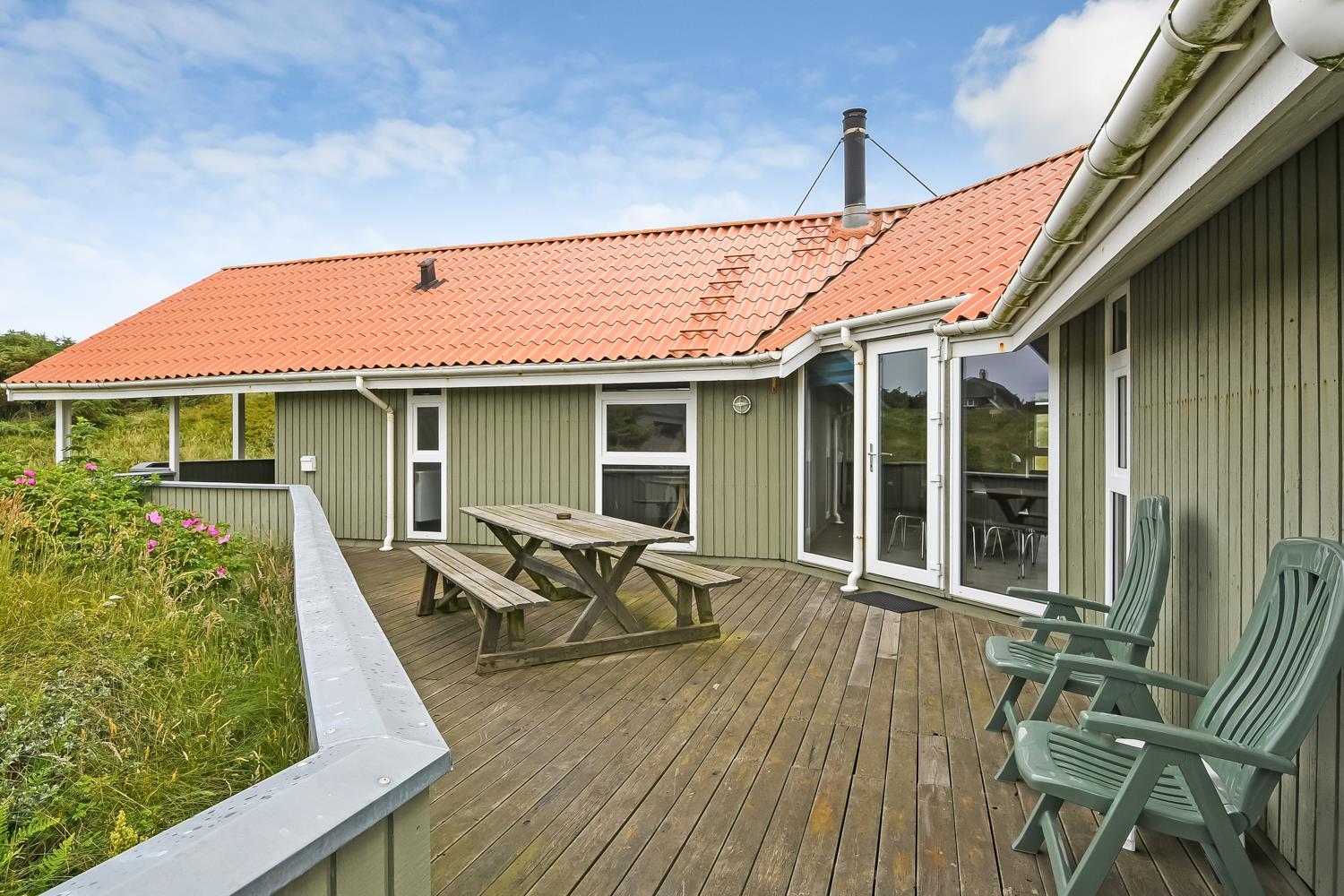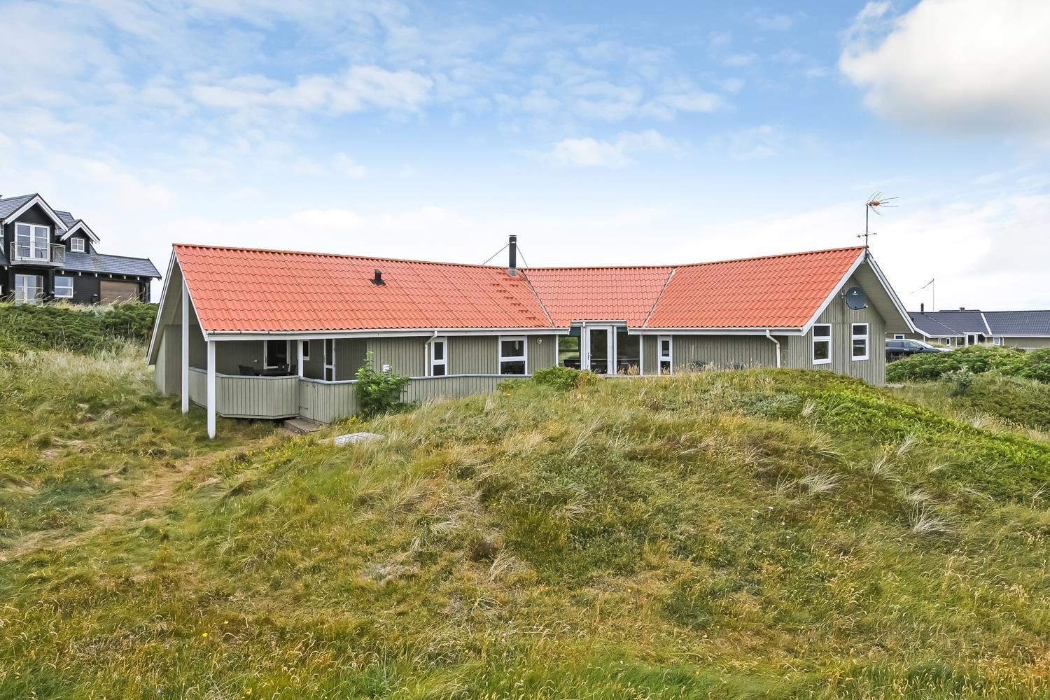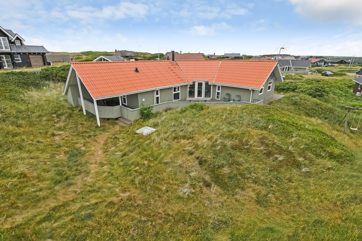 Dejligt, rummeligt feriehus beliggende på dejlig kuperet klitgrund kun 160 meter fra Vesterhavet. Hertil kommer indelukket, sydvendt terrasse med mulighed for at sidde under halvtaget, hvis det ønskes. Huset er særdeles velegnet til 2 familier og børnevenligt med blandt andet puslebord, barnestol, barneseng, gynger og sandkasse.