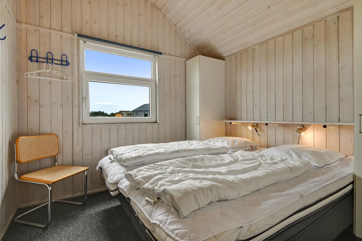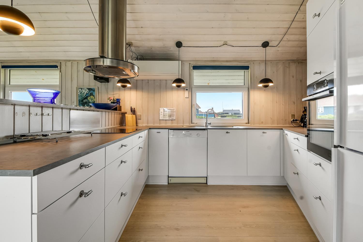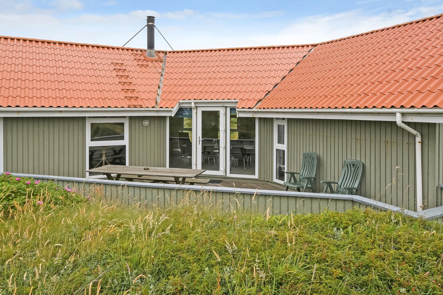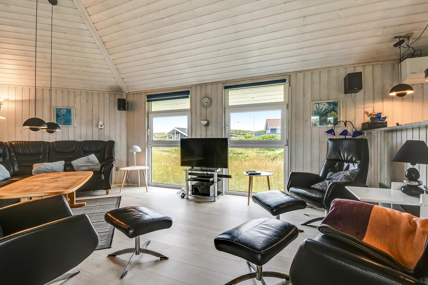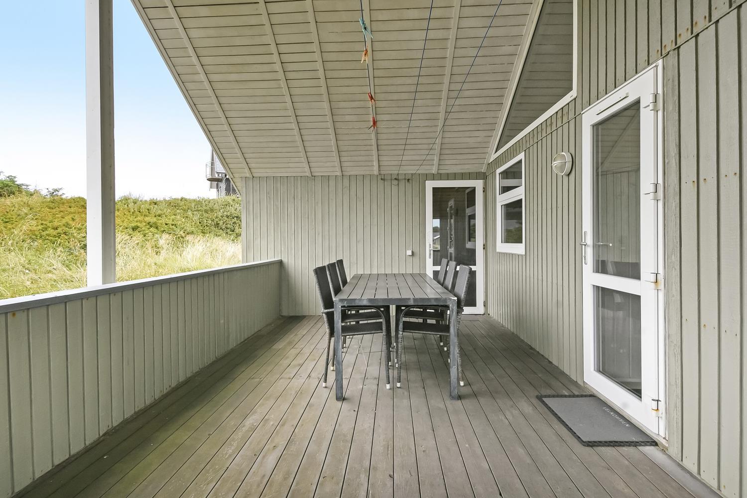 Dejligt, rummeligt feriehus beliggende på dejlig kuperet klitgrund kun 160 meter fra Vesterhavet. Hertil kommer indelukket, sydvendt terrasse med mulighed for at sidde under halvtaget, hvis det ønskes. Huset er særdeles velegnet til 2 familier og børnevenligt med blandt andet puslebord, barnestol, barneseng, gynger og sandkasse.