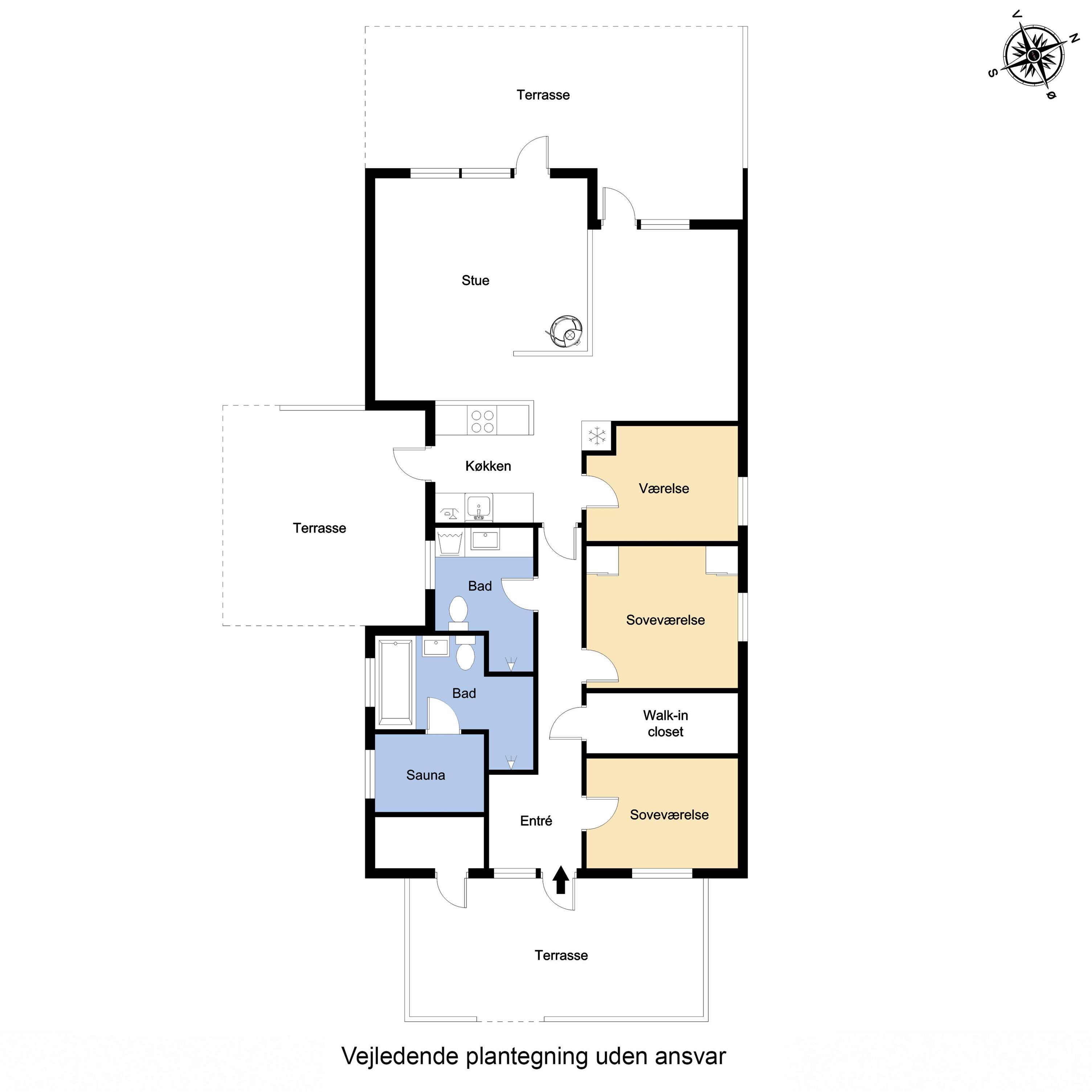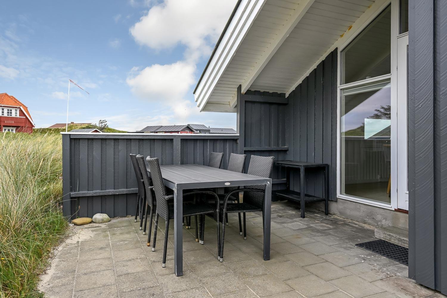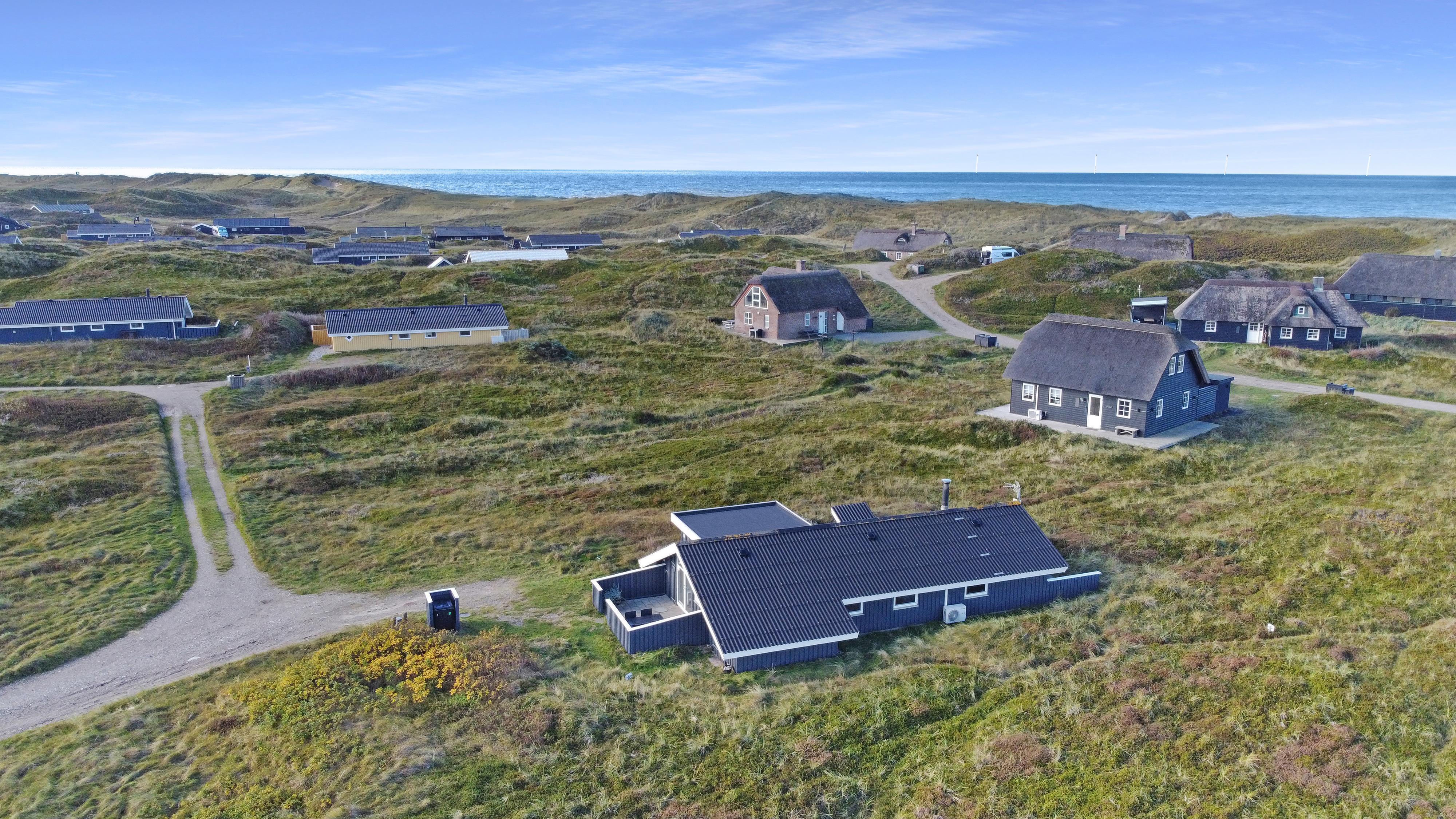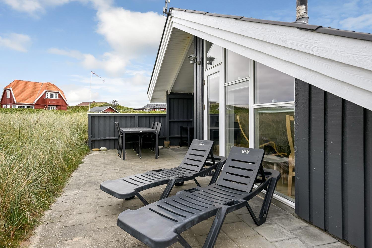 Huset ligger på en 1.354 m2 stor klitgrund. Der er udgang til tre dejlige terrasser. Den største terrasse mod vest er delvis overdækket. Der er havemøbler og solvogne til rådighed. Fra terrasserne kan man høre havet bruse, mens man nyder udsigten til de høje klitter. Et utrolig dejligt hus, hvor der er tænkt på det meste og med masser af muligheder. Strand og Vesterhavet er kun 5 minutters gang fra huset, og naturen inviterer altid til en frisk gå- eller løbetur. Alternativt kan I tage madpakke med og gå den flotte tur på 10 km rundt om Ferring Sø. Købmanden i Vejlby Klit har sæsonåbent og ligger 1,5 km fra huset i bil (eller 1 km på cykel eller til fods via en sti til Viktoriavej). I sæsonen byder købmanden på frisk morgenbrød, og her kan de daglige indkøb også klares. Overfor købmanden ligger ”Café John Wayne”, hvor man kan nyde et dejligt måltid, et glas øl eller vin, en kop kaffe, eller en is – enten udendørs eller indendørs. Kulturelle seværdigheder, shopping, og diverse sportsaktiviteter kan nås i bil på max. ca. 20 min. Fra den lokale togstation ”Victoria Street Station” kan I tage toget mod enten Lemvig eller Thyborøn og derved opleve en af Danmarks kønneste togstrækninger. Hvad enten I er til aktiv ferie eller total afslapning, danner dette flotte feriehus en dejlig ramme både hvad angår hus, beliggenhed og omgivelser.