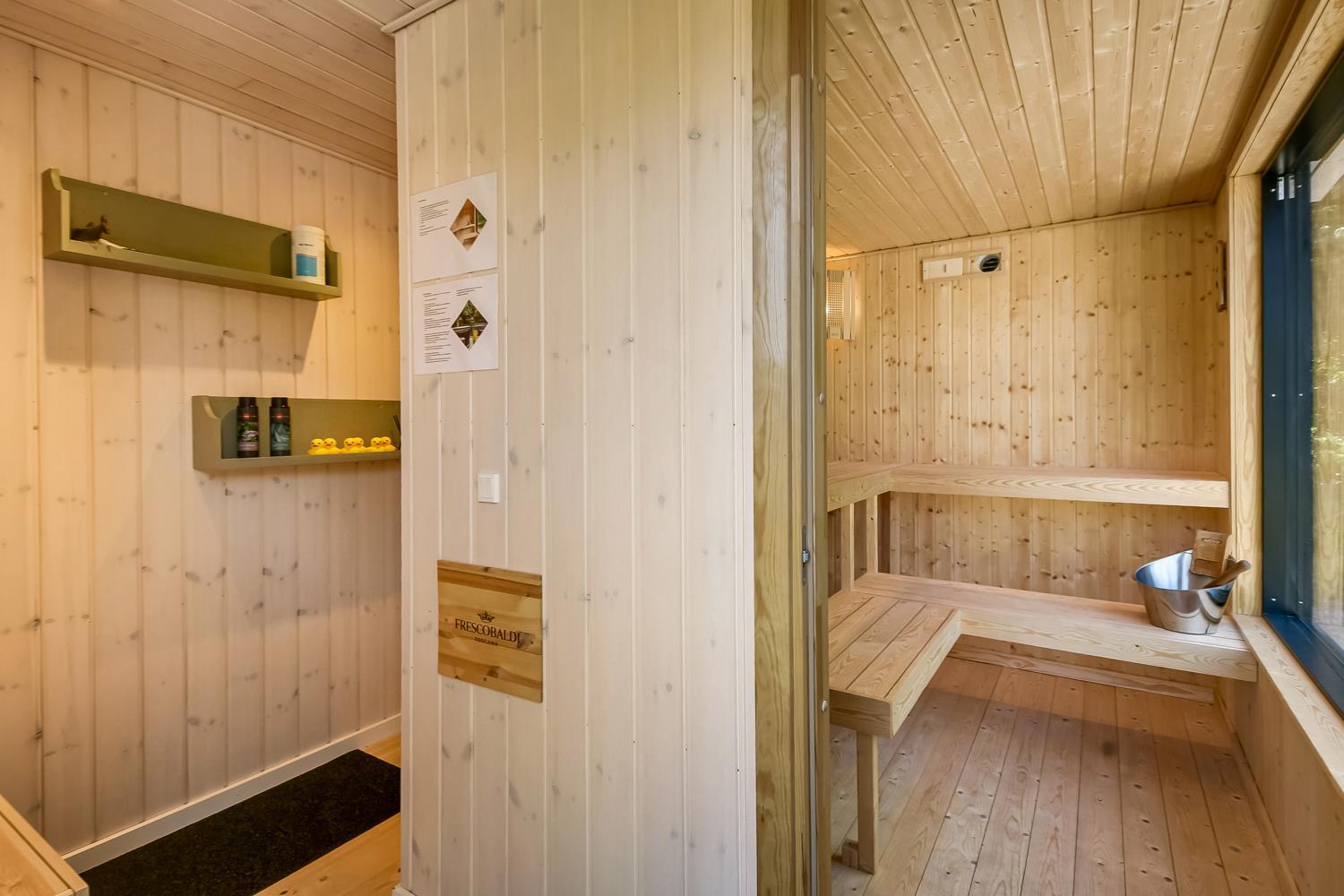Husets 2 badeværelser er helt unikke. De er begge udført i mikrocement som giver en helt speciel oplevelse. Begge har med toilet, håndvask, bruser og gulvvarme, men på det største badeværelse er der også spabad og direkte adgang til sauna. Puslepude, babubadekar, barneseng og højstol til de små medrejsende. I hele huset er det praktiske og rengøringsvenlige gulve. Der er tænkt på alt, og ejer af huset passer og plejer huset, så det altid præsenteres fra den bedste side.