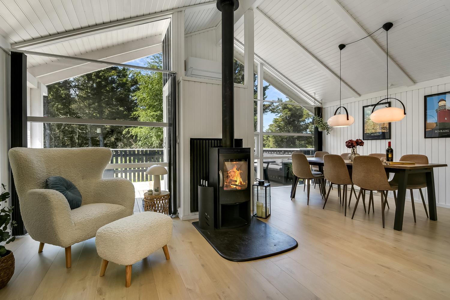Træd ind i dette skønne og rummelige feriehus på 92 m2, hvor komfort og hygge mødes. Med fire godt indrettede soveværelser (1DS, 1DS, 1DS, 2KS). Herudover er der også hyggelig hems med plads til yderligere to personer. En rigtig lille hule som børnene vil elske. Der rigeligt med plads til hele familien eller gruppen af venner – dog må huset beboes af max. 8 personer. Den åbne opholdsstue, flot indrette i lyse og venlige farver. Inviterer til afslapning i den hyggelig hjørnesofa, foran den knitrende brændeovn, mens I kan nyde jeres yndlingsfilm på det moderne TV med danske og tyske kanaler. Den opsatte varmepumpe søger for fantastisk indeklima året rundt og bidrager til en energisparende opvarmning af huset. Køkkenhjørnet er en sand kulinarisk oase, udstyret med alt hvad I behøver for at tilberede lækre måltider. Samtalekøkkenet har alt i service, køkkengrej. Opvaskemaskine, mikroovn, airfryer, keramiske kogeplader, indbygningsovn, køle-/fryseskab og emhætte. Spisearrangementet er praktisk placeret lige ved køkkenet og giver jer mulighed for at dele uforglemmelige øjeblikke sammen.