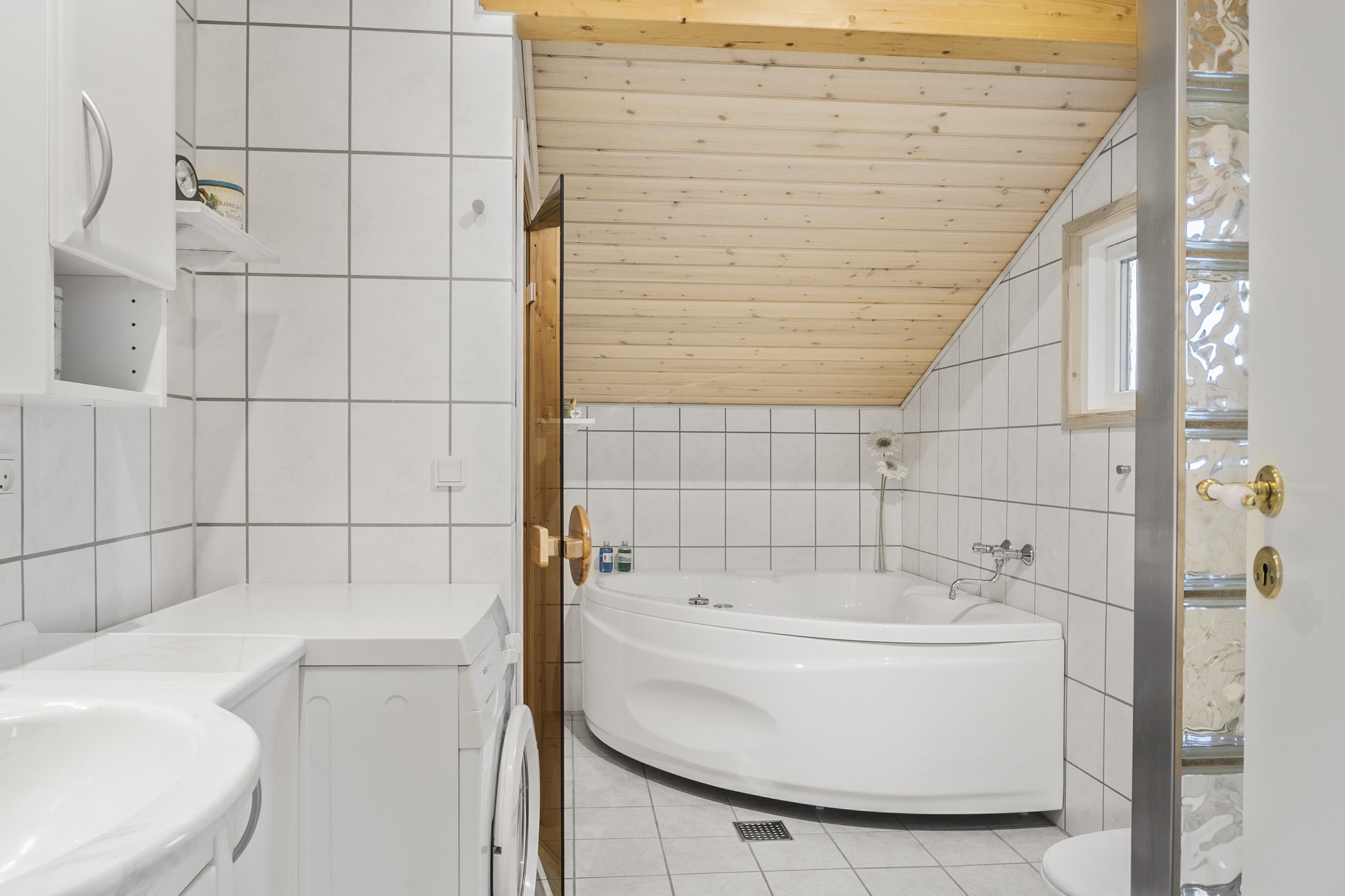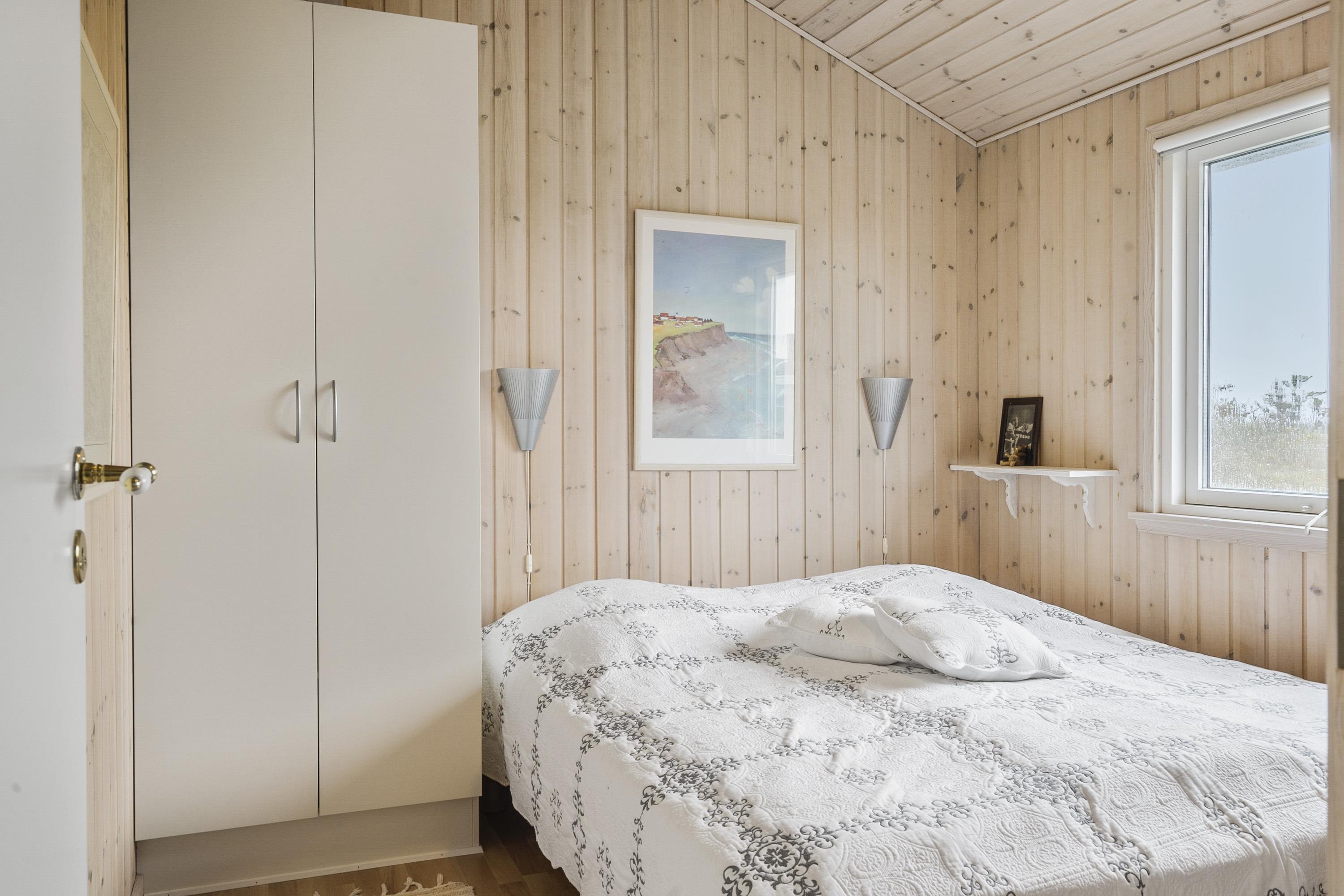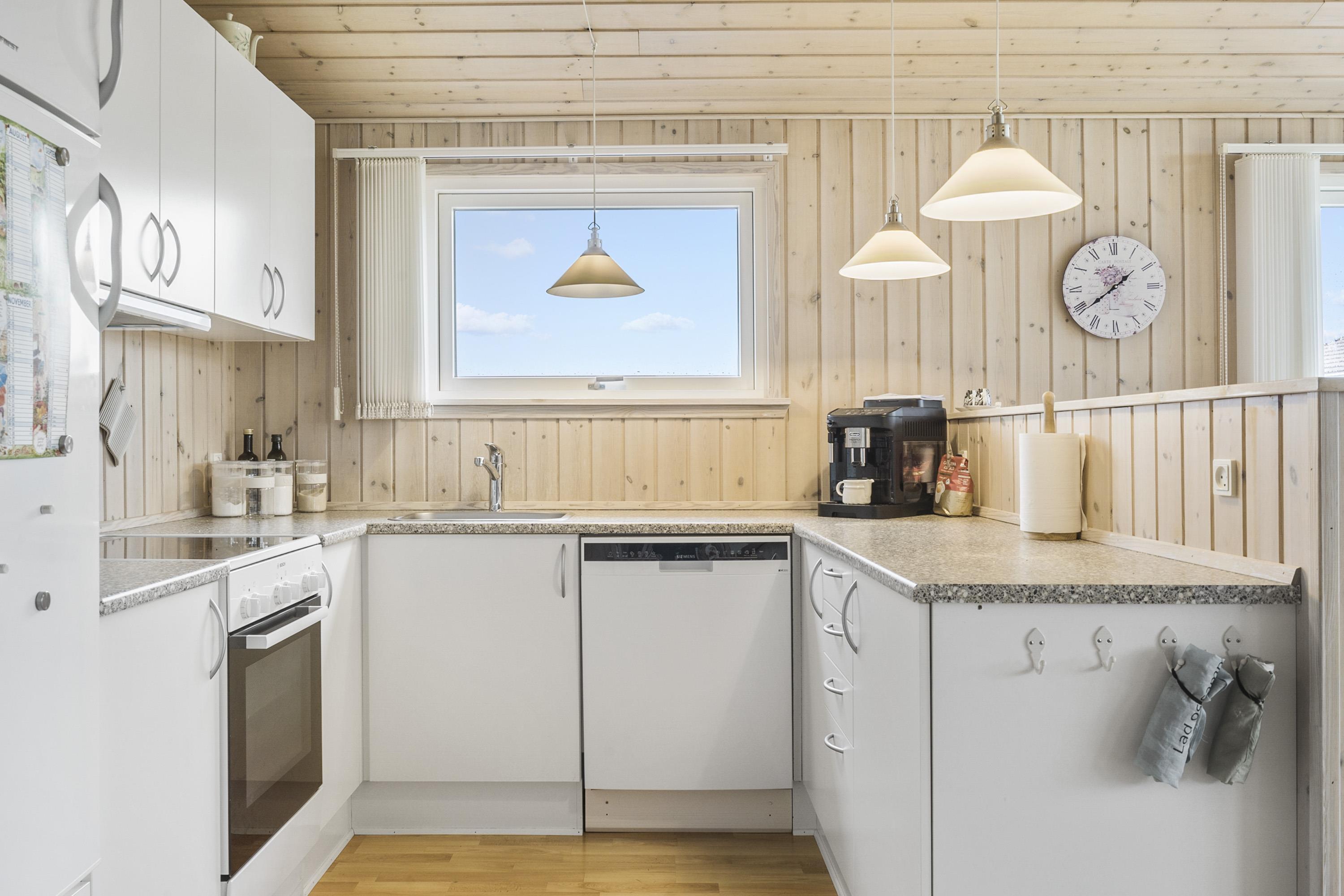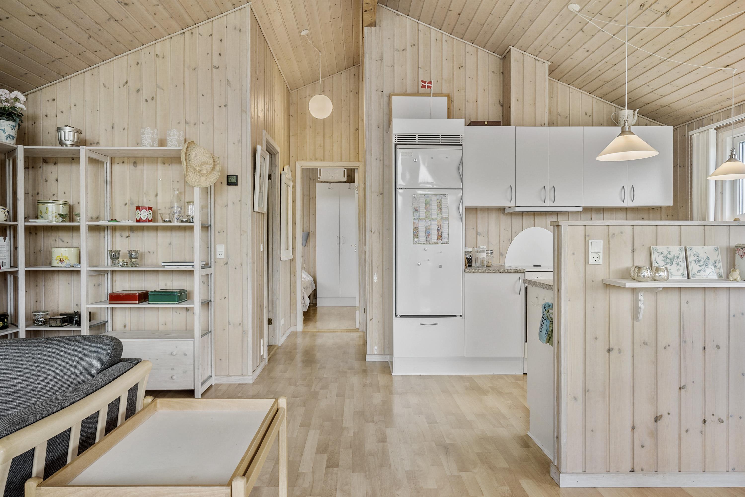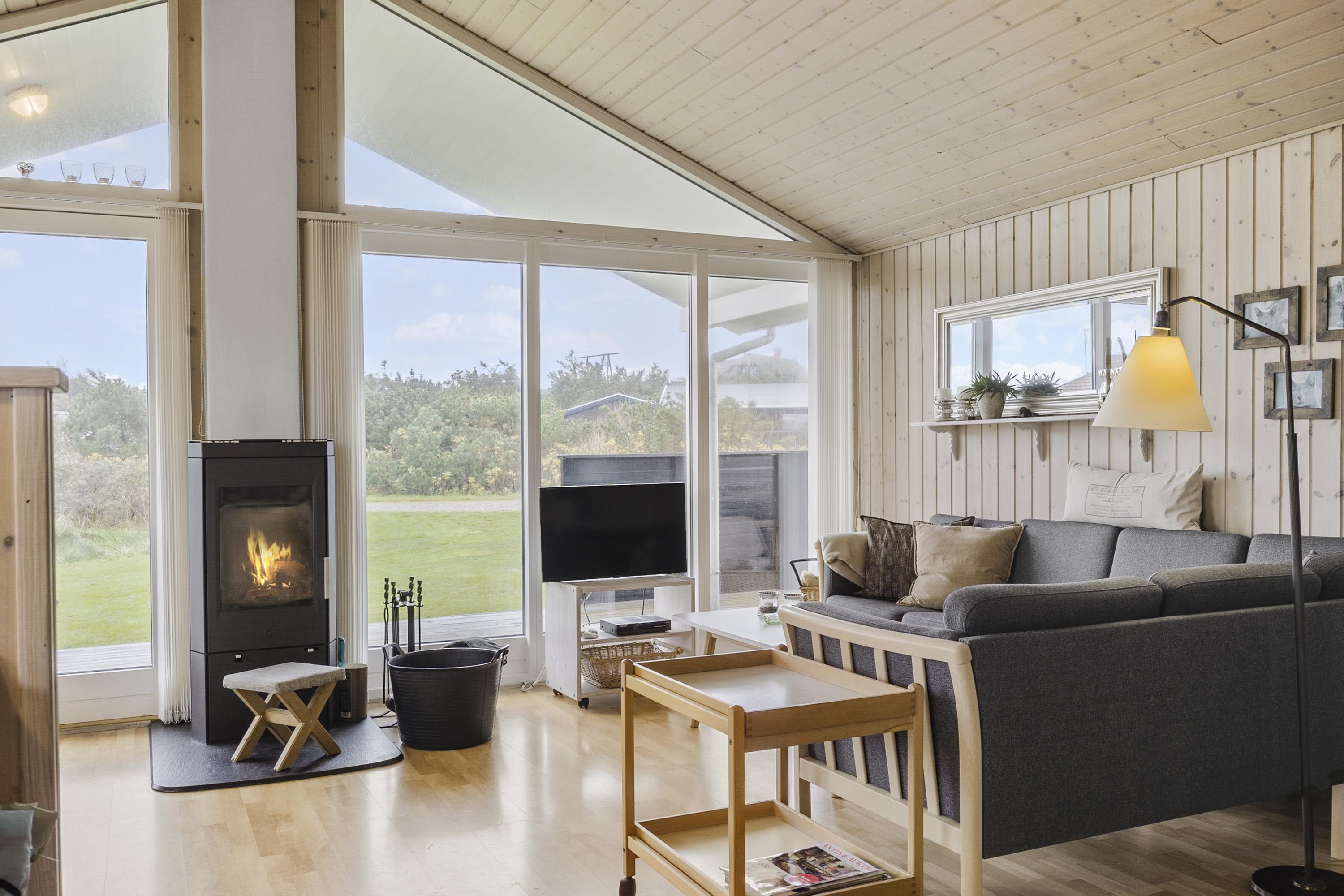 Feriehuset er indbydende, lyst og hyggeligt indrettet. Stuen og køkkenet er lyst med store vinduespartier, som giver et godt lysindfald, loft åben til kip. Opholdsstuen er indrettet med polstermøbler, TV med danske og tyske programmer. I stuen kan man nyde varmen fra brændeovnen eller varmepumpen, som er med til at mindske forbrugsomkostningerne. Spiseafdeling er placeret tæt på køkkenet. Åbent og lyst køkken. Køkkenet er veludstyret og indeholder bl.a. glaskeramisk komfur, mikroovn, køle-fryseskab og opvaskemaskine. 3 gode soverum: 1DS + 1DS + 1S. Laminatgulve i hele huset som er meget rengøringsvenlige. Badeværelse med toilet, håndvask, bruser, vaskemaskine, spa og adgang til sauna, klinkegulv. Ikke rygerhus. Husdyr ikke tilladt.